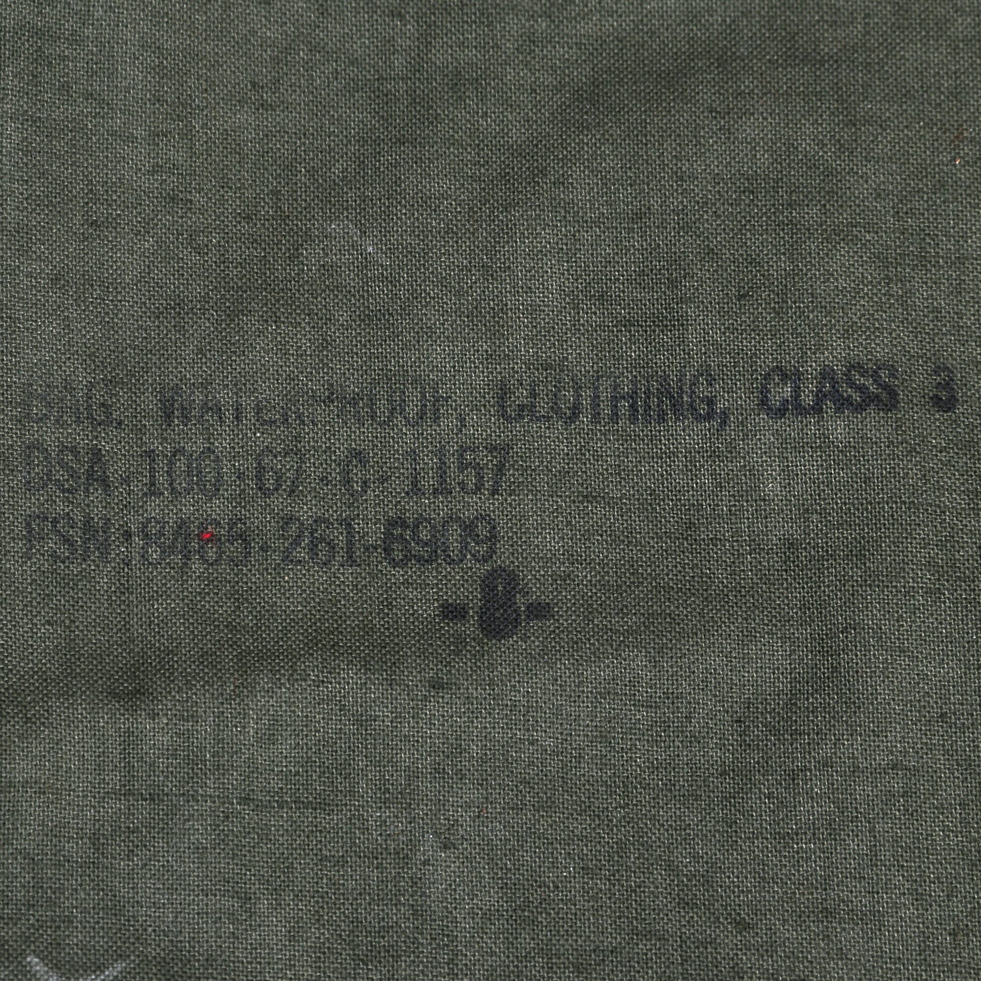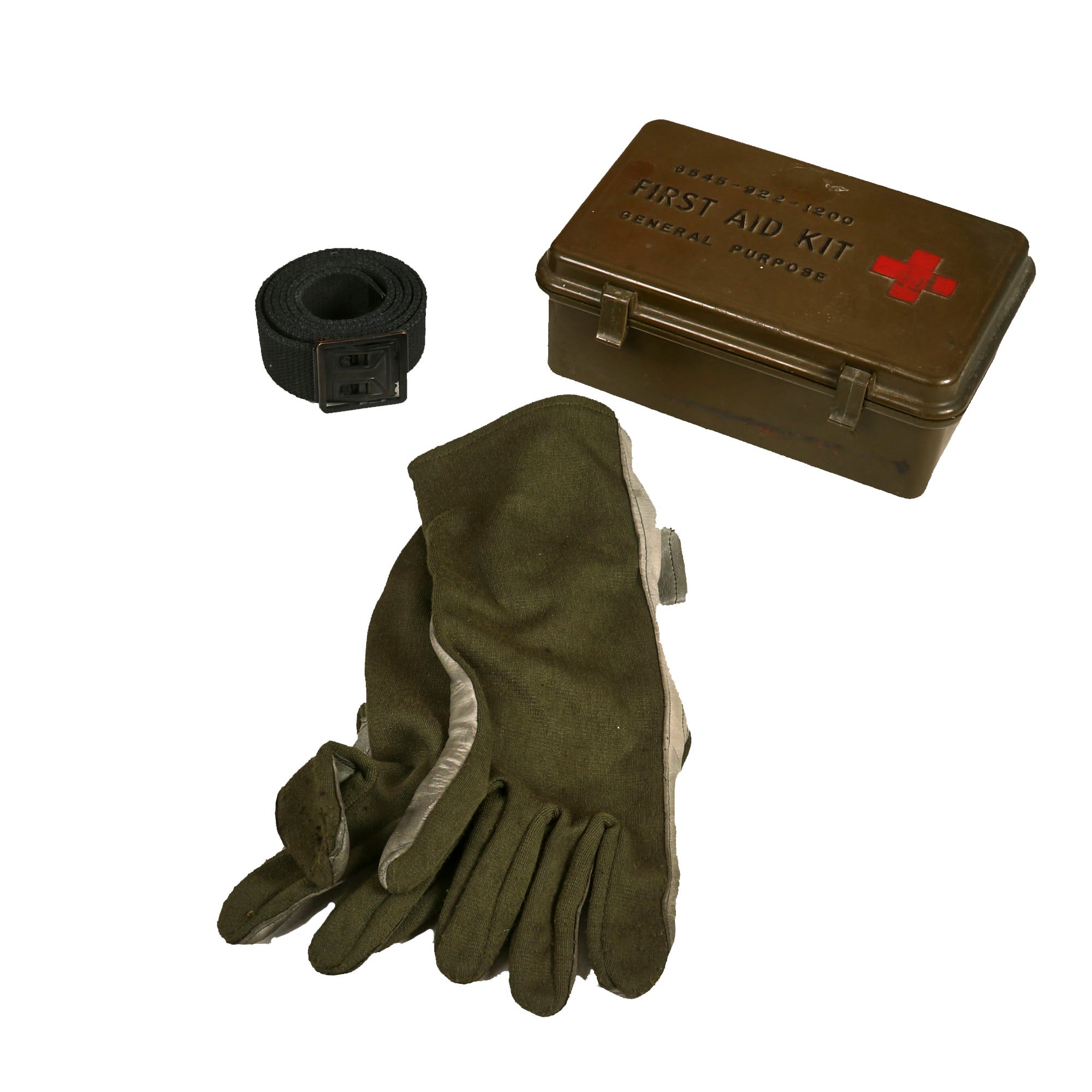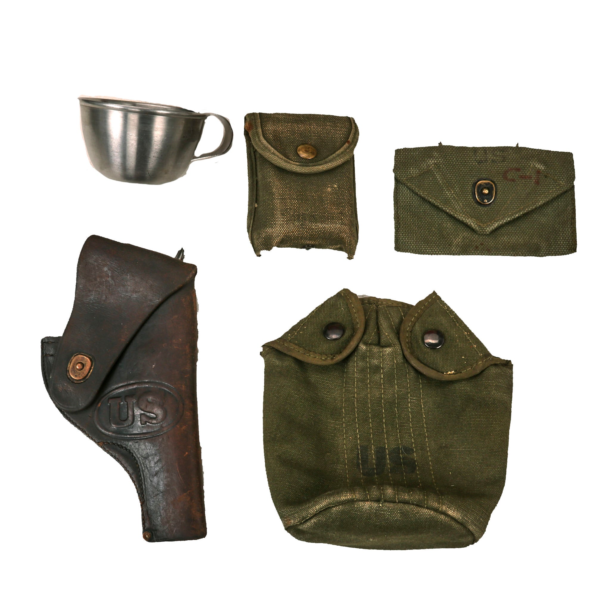 -Various Field Gear: M-1956 Canteen Cover, M-1956 1st Aid Pouch with Dressing, MX-991/U Flashlight, 1952 Dated Cup (From Officer’s Mess Set). Private Purchase Poncho in Case.