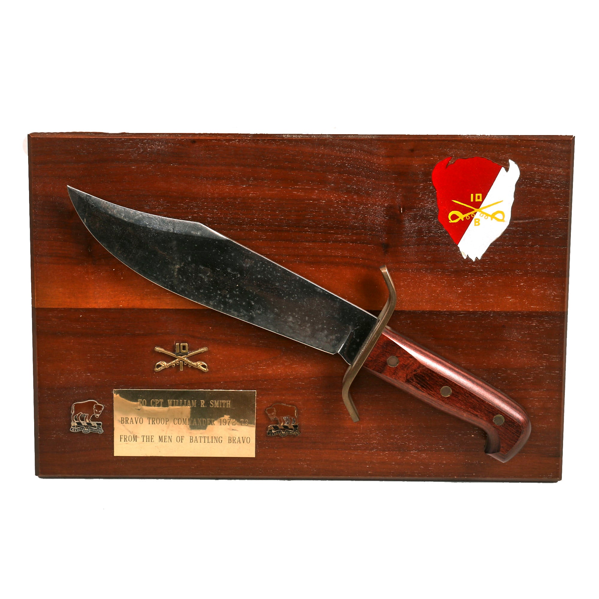 -Western W-49 Bowie Knife mounted on Plaque: It was relayed by a family member that Smith was known for carrying a W-49 Knife during his time in Vietnam, and his subsequent assignment with the 10th Cavalry Regiment. This Plaque dates from 1973, commemorating his period as Bravo Troop Commander, by the men he commanded. We were told this is the knife he carried in Vietnam.