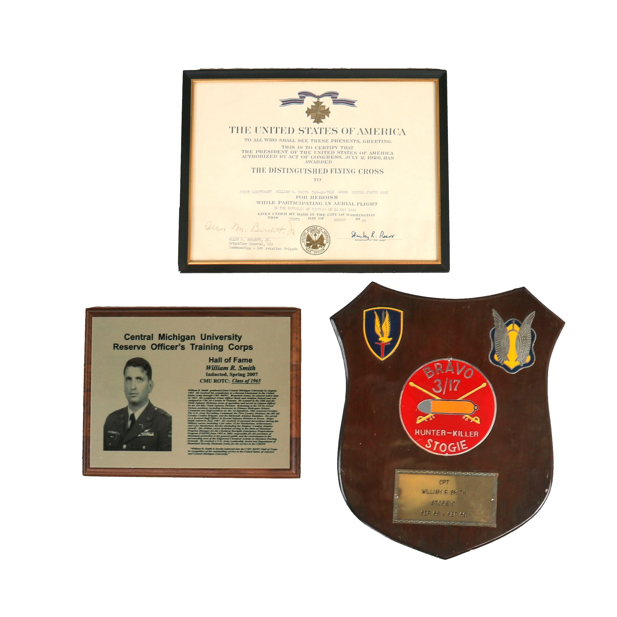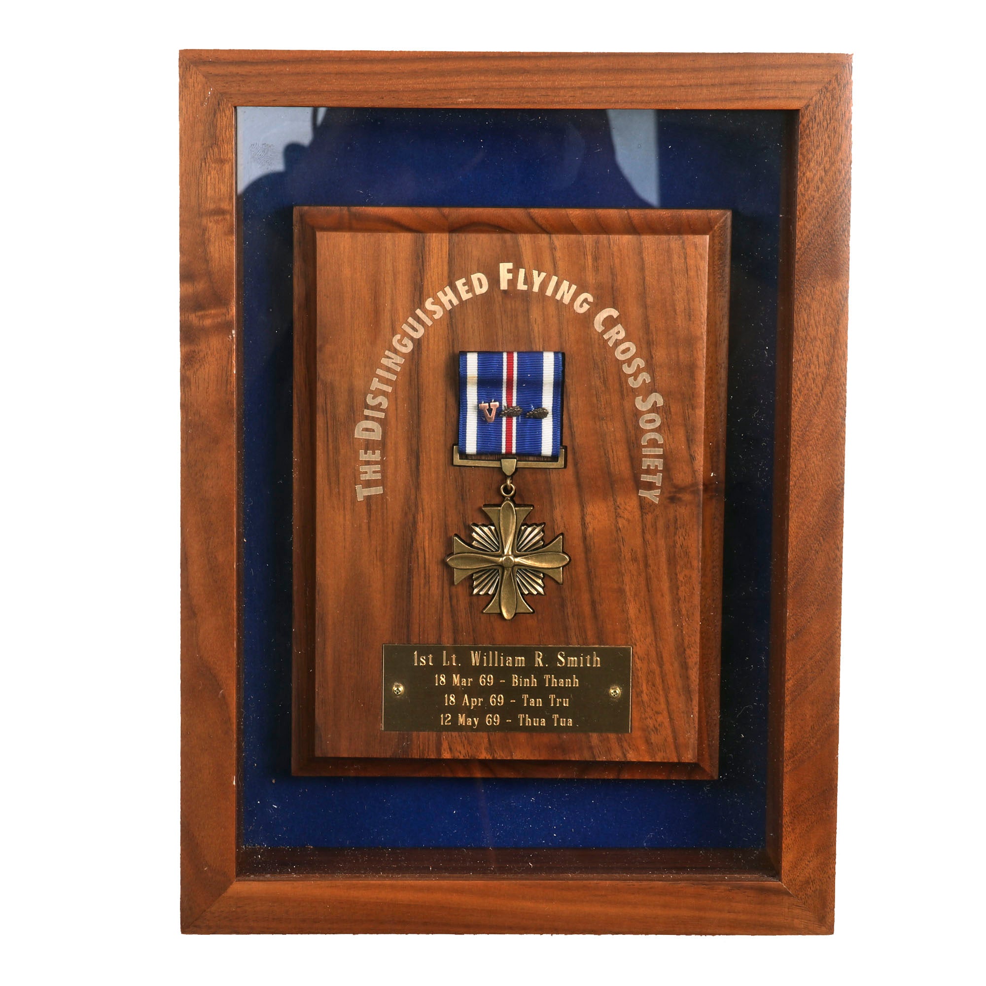 -Distinguished Flying Cross Mounted on Plaque. Presented by The Distinguished Flying Cross Society. With Inscription: “1st Lieutenant William R. Smith/18 Mar 69 Binh Thanh/ 18 Apr 69 Tan Tru/ 12 May 69/Thua Tua”.