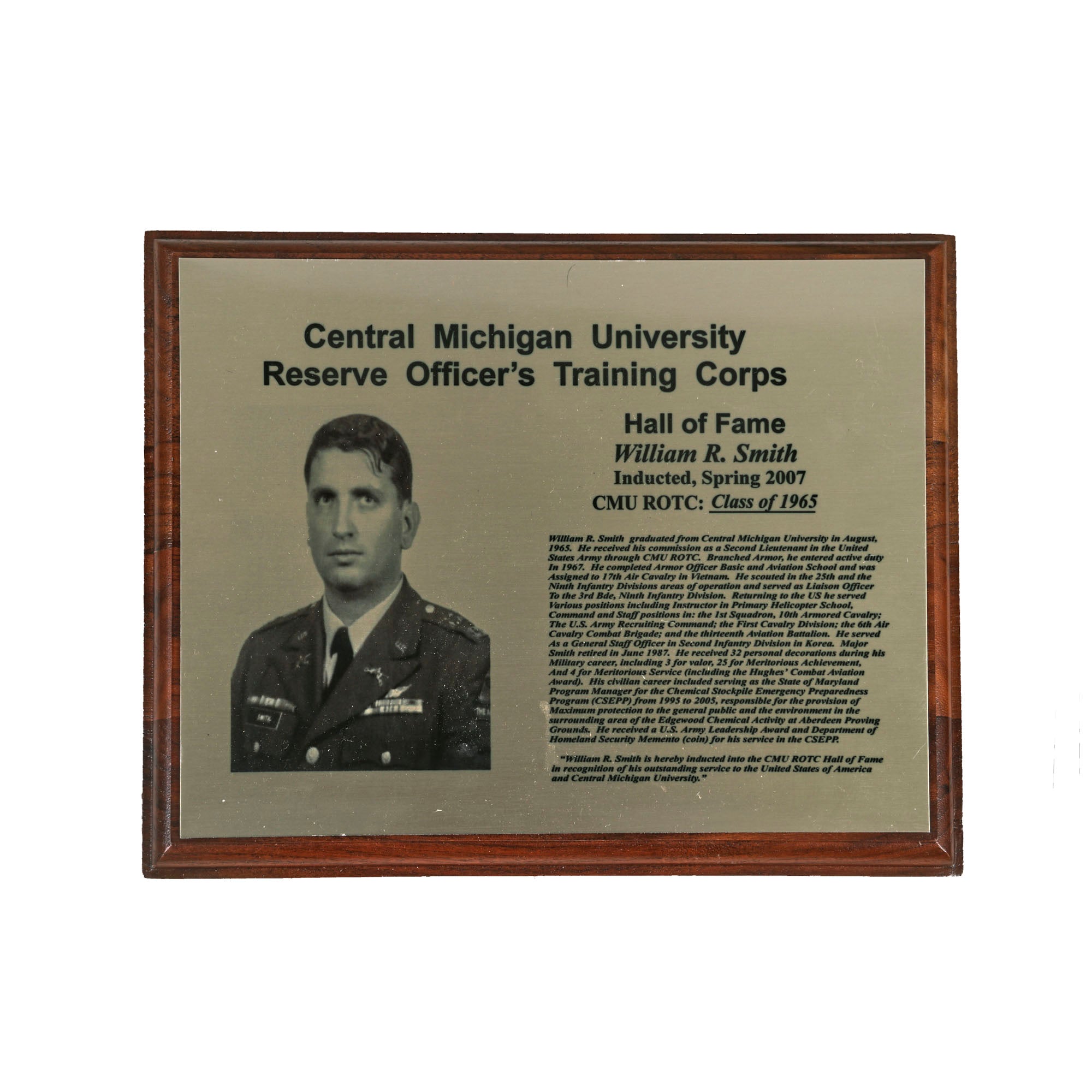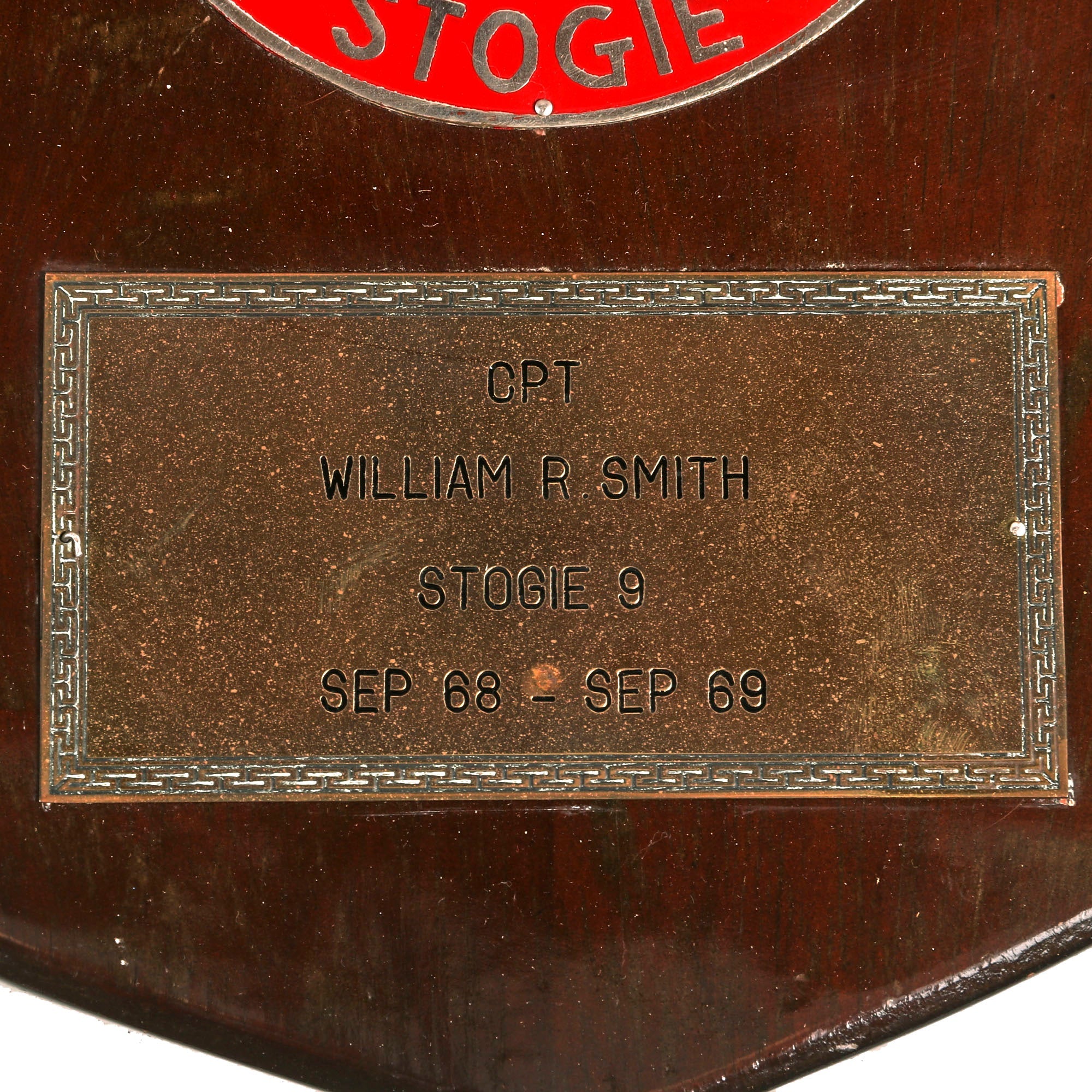-Presentation Plaque Awarded to Captain Smith in Commemoration of His Tour with B Troop, 3/17th Cavalry in 1969. The plaque features Vietnamese-Made “Beercan” Insignias of the 1st Aviation Brigade, 17th Cavalry and B Troop, with an engraved plaque “CPT/William R. Smith/Stogie 9/Sep 68-Sep 69”