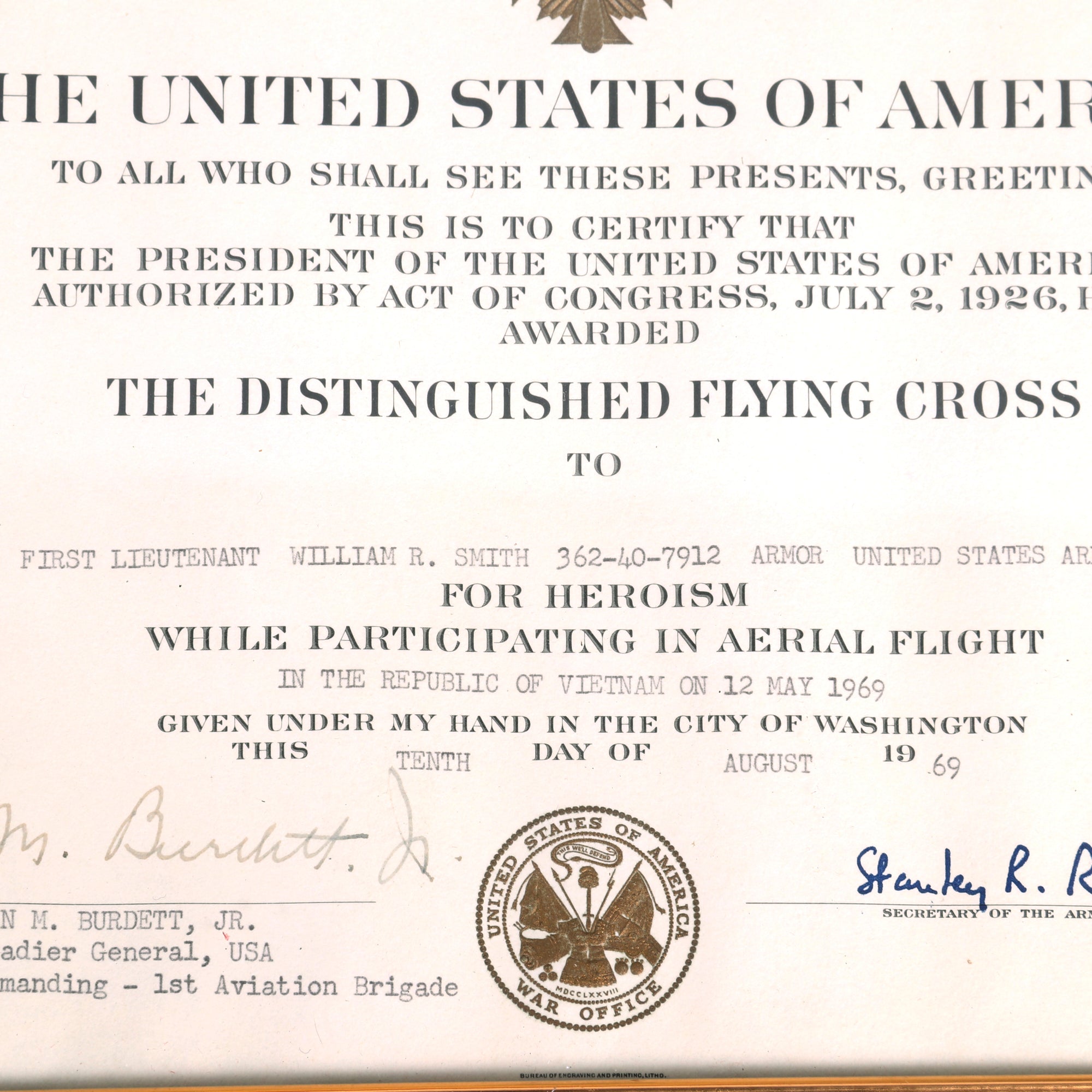 -Framed Original Distinguished Flying Cross Citation. From Smith’s action on May 12, 1969. Awarded August 10th, 1969. In Period Frame.