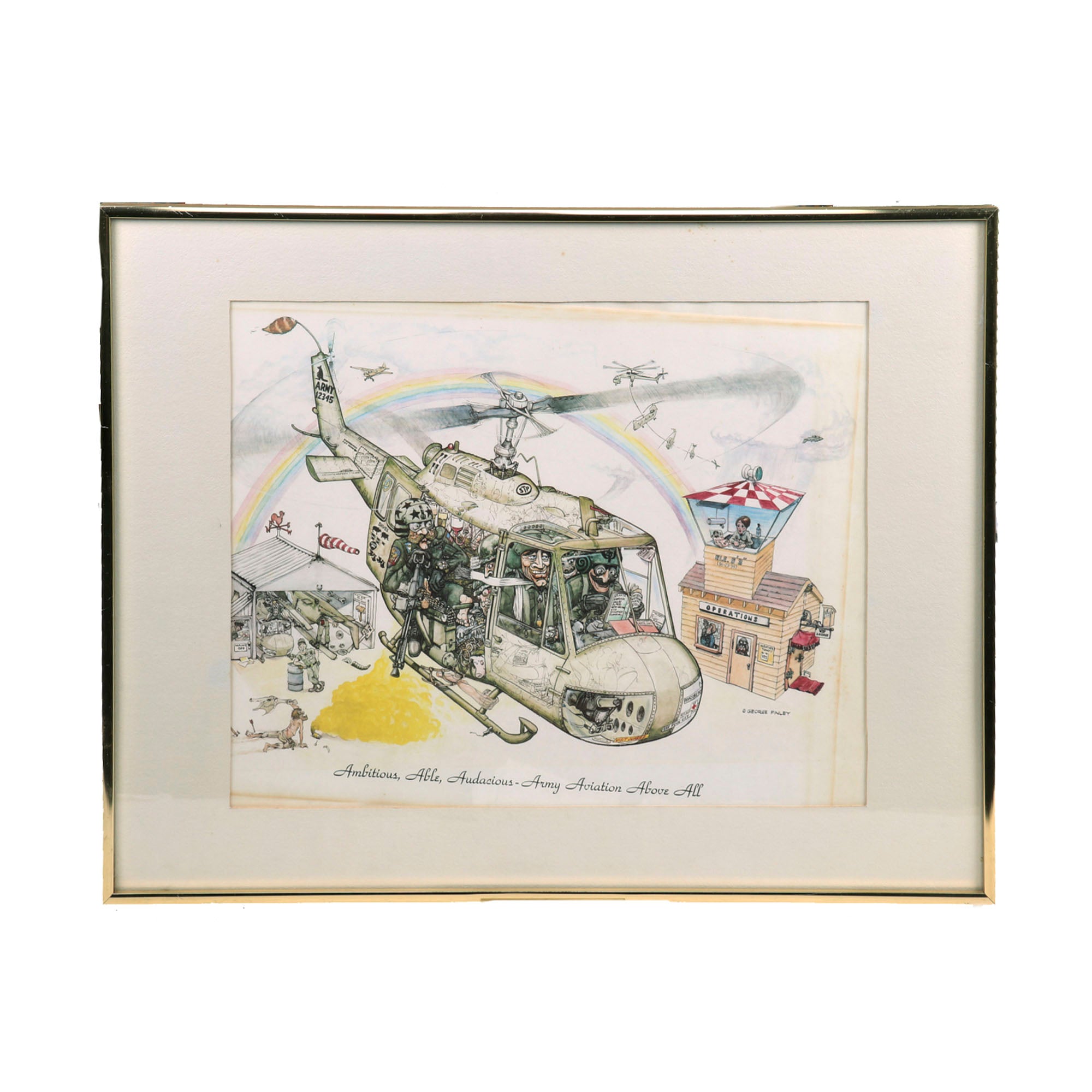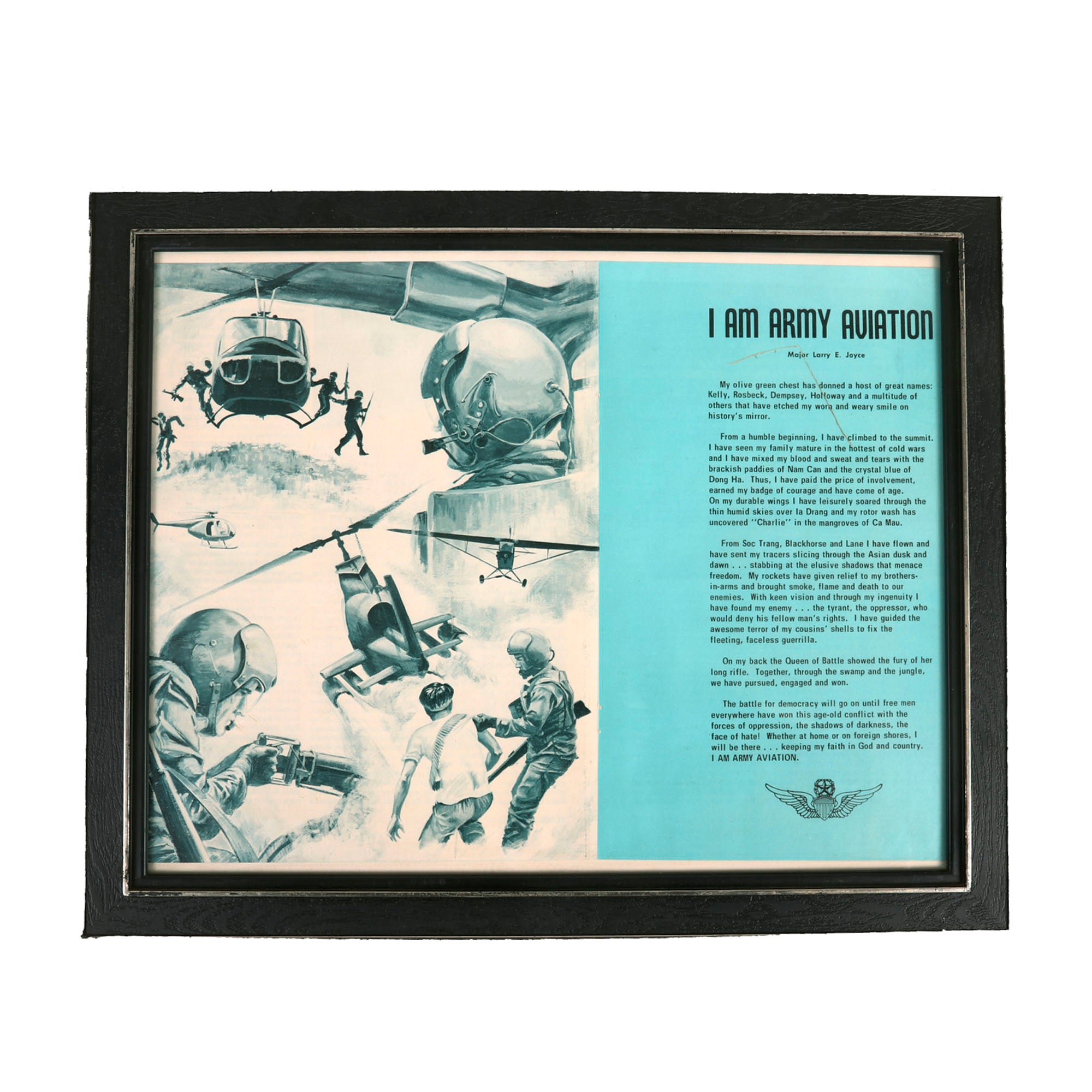 -Framed Pieces: Smith’s Framed Commission from 1965. “I’am Army Aviation” Advertisement remobed from Period magazine. “Ambitious, Able, Audacious Above All” Light hearted cartoon print of Army Aviators.