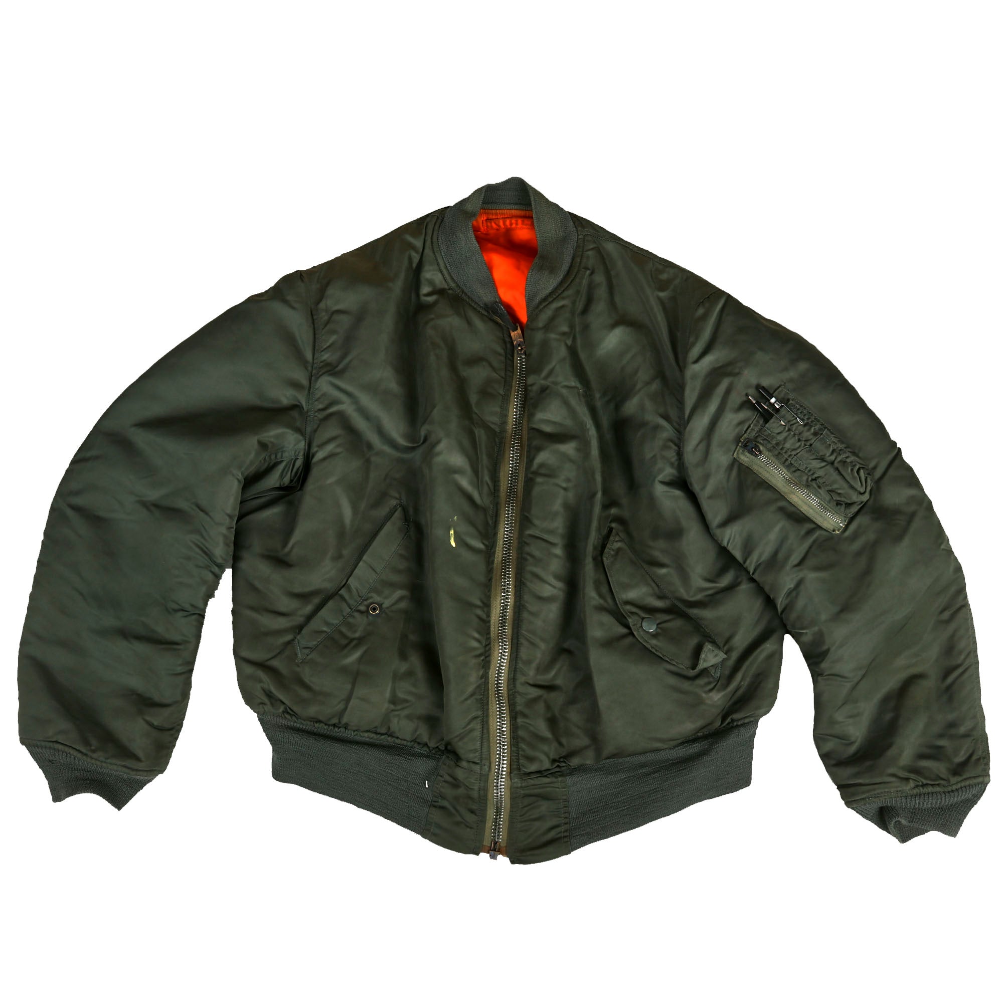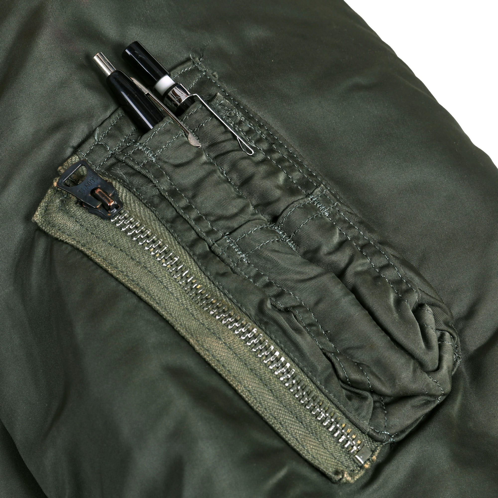 -MA1 Flight Jacket, Size Large, Dated 1972. Has a Government Issue Skillcraft Pen and a Period Mechanical Pencil still seated in the arm pocket. Zipper is functional, as well as the snaps.