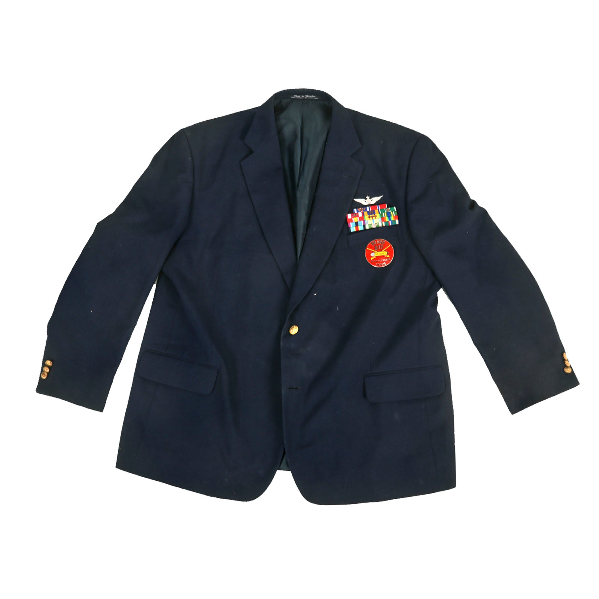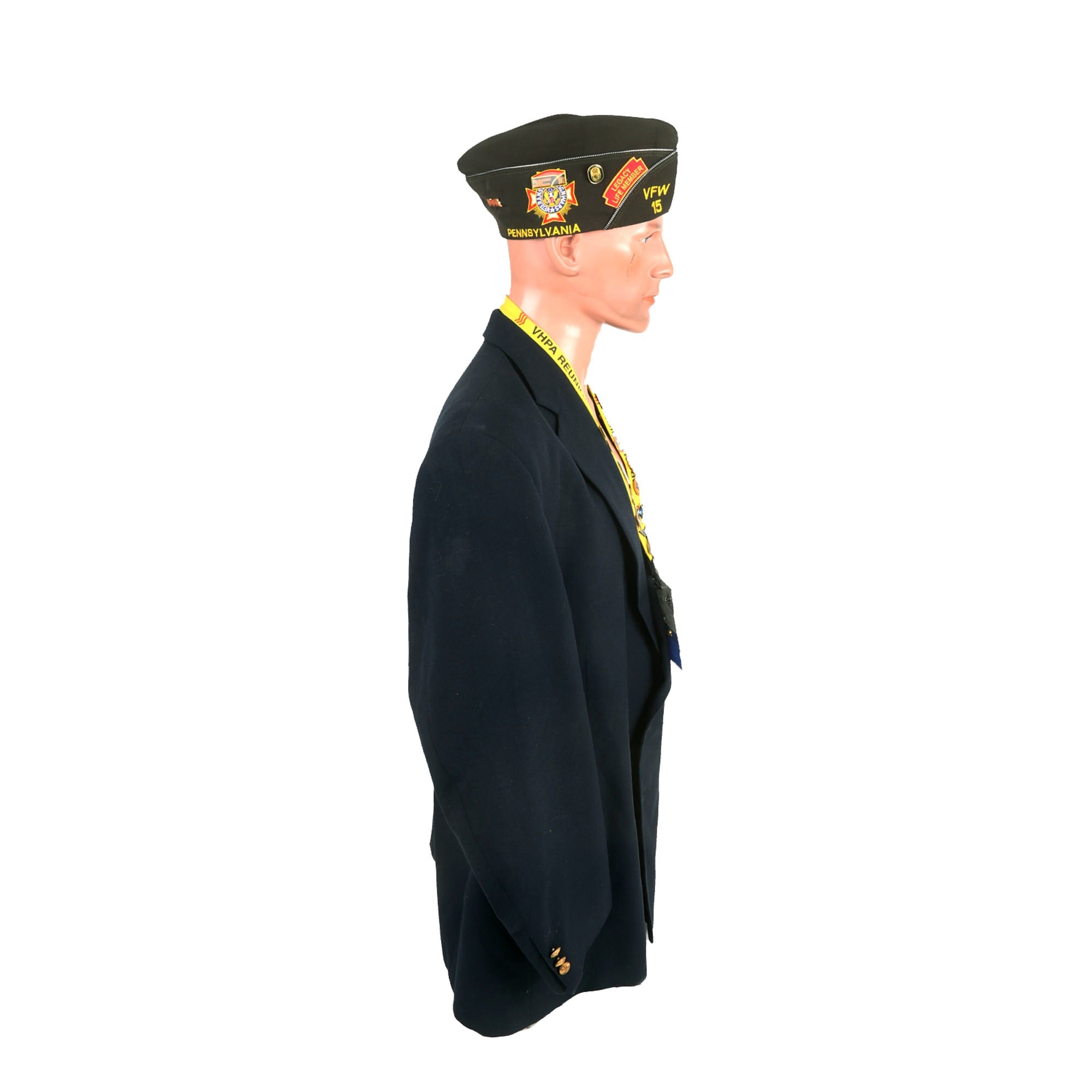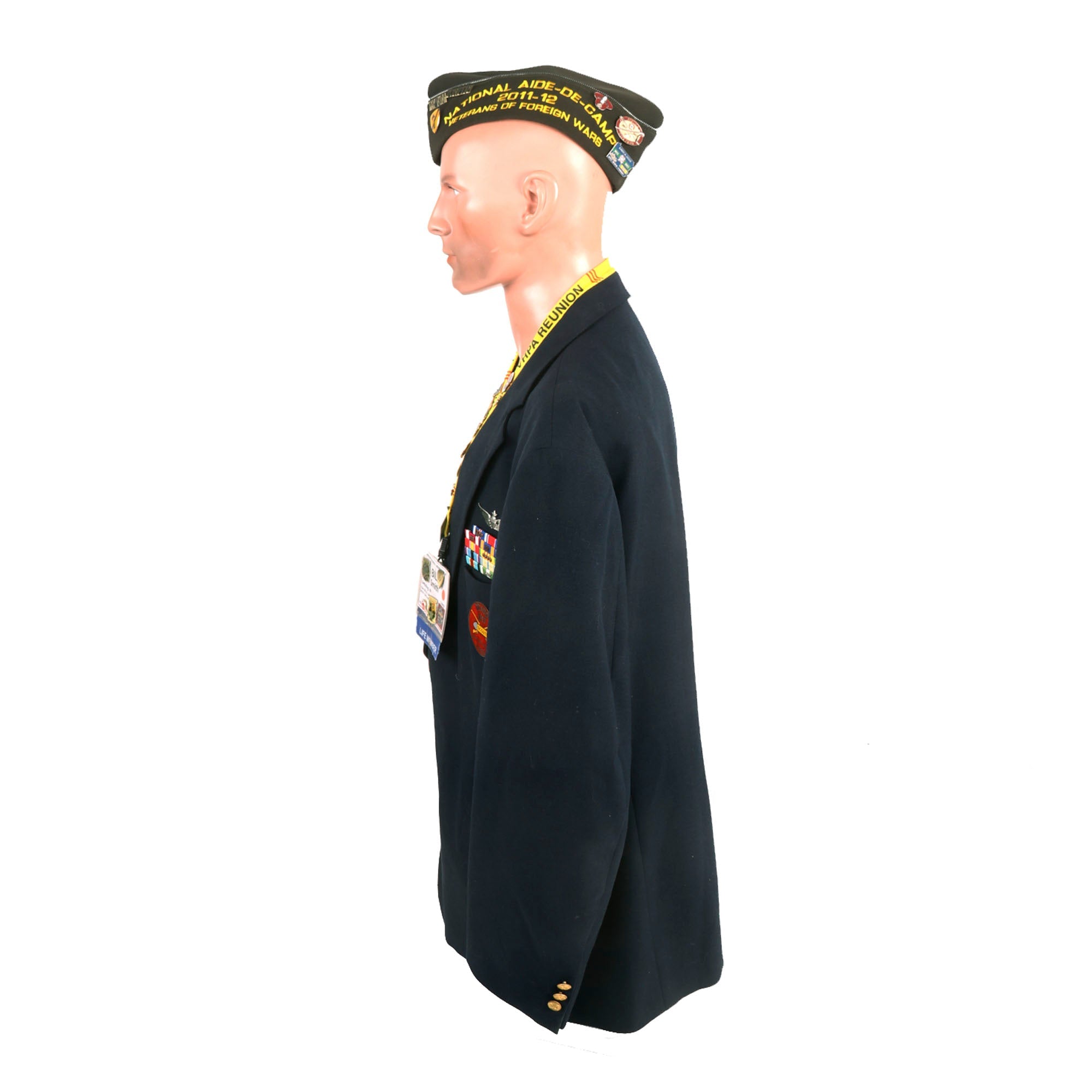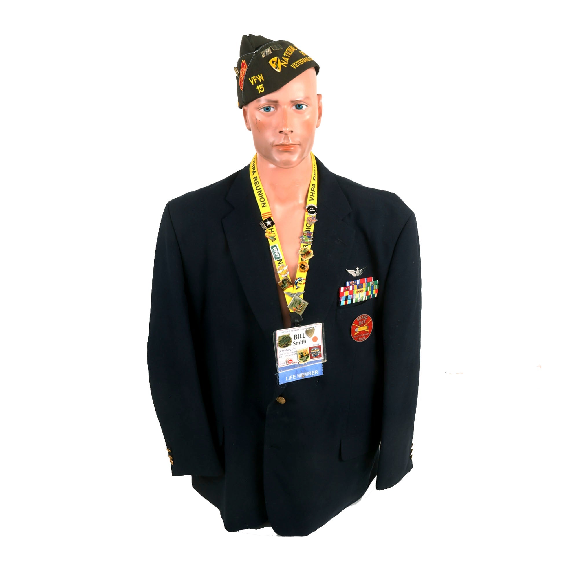 -Veteran’s Reunion Blazer with VFW Overseas Cap. Just the way it was pulled from the closet. The Blazer is a contemporary garment worn at reunions. On the jacket is Smith’s original 3/17th Stogie “Beercan”, contemporary miniature ribbon rack, and miniature Army Pilot Wings. The Cap features various pins.