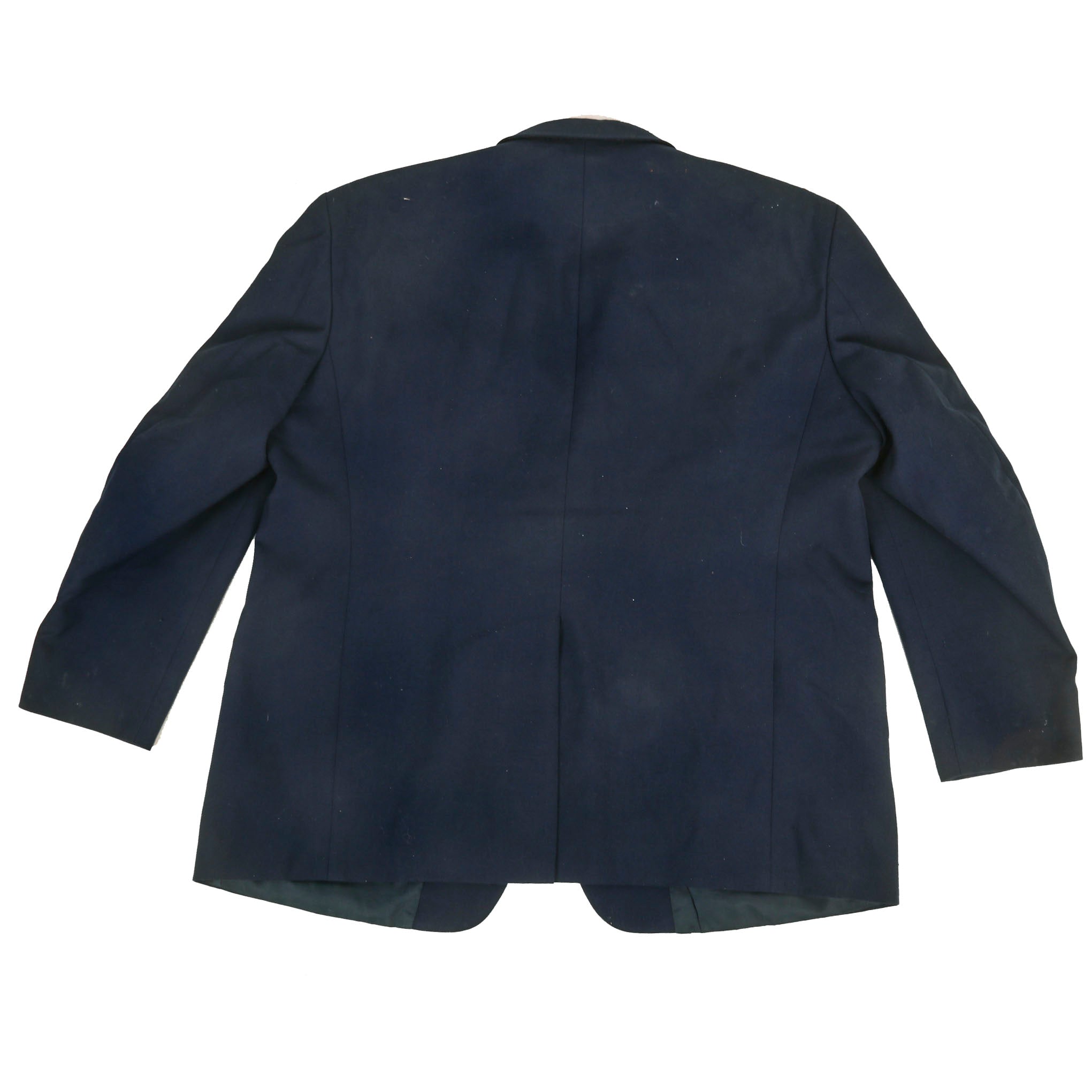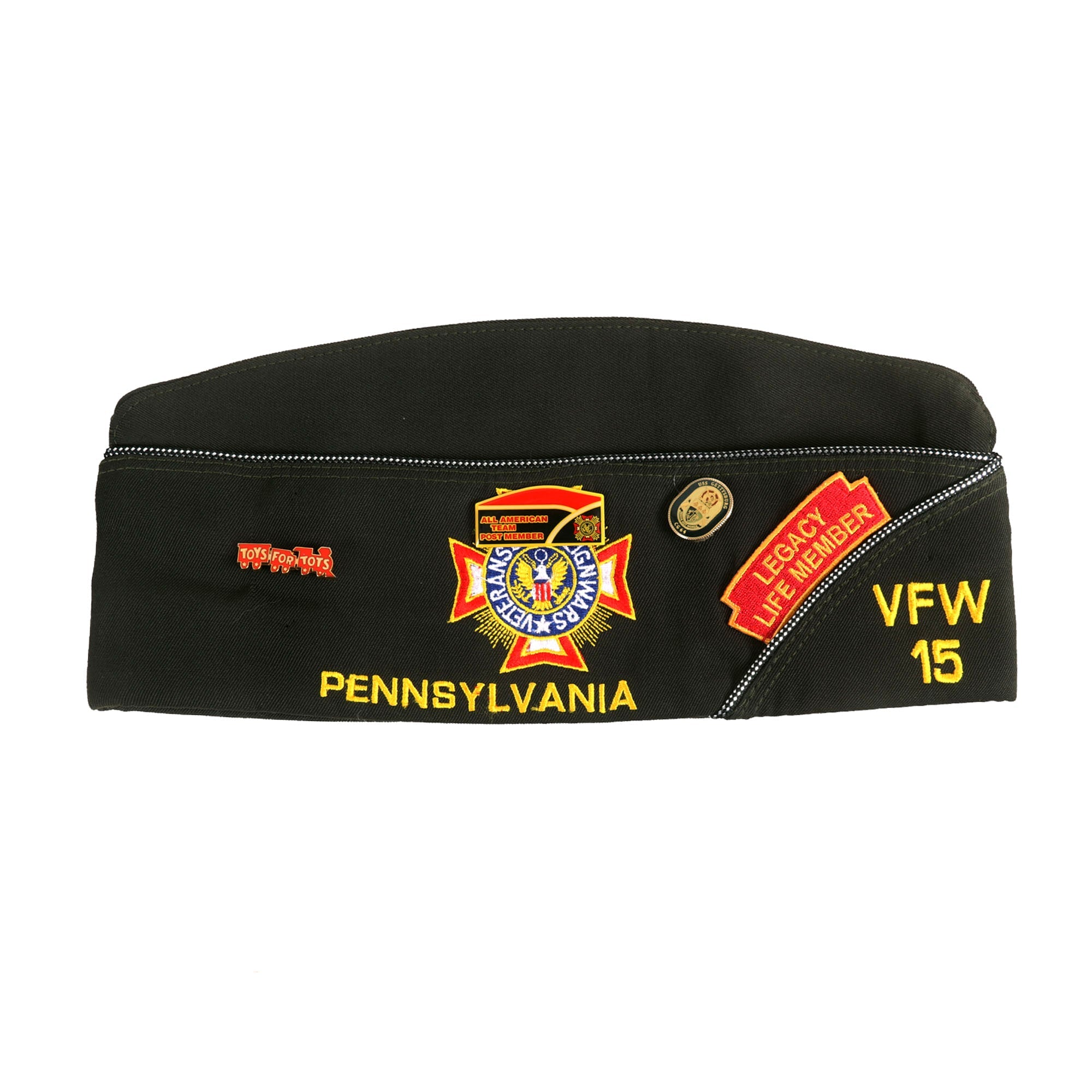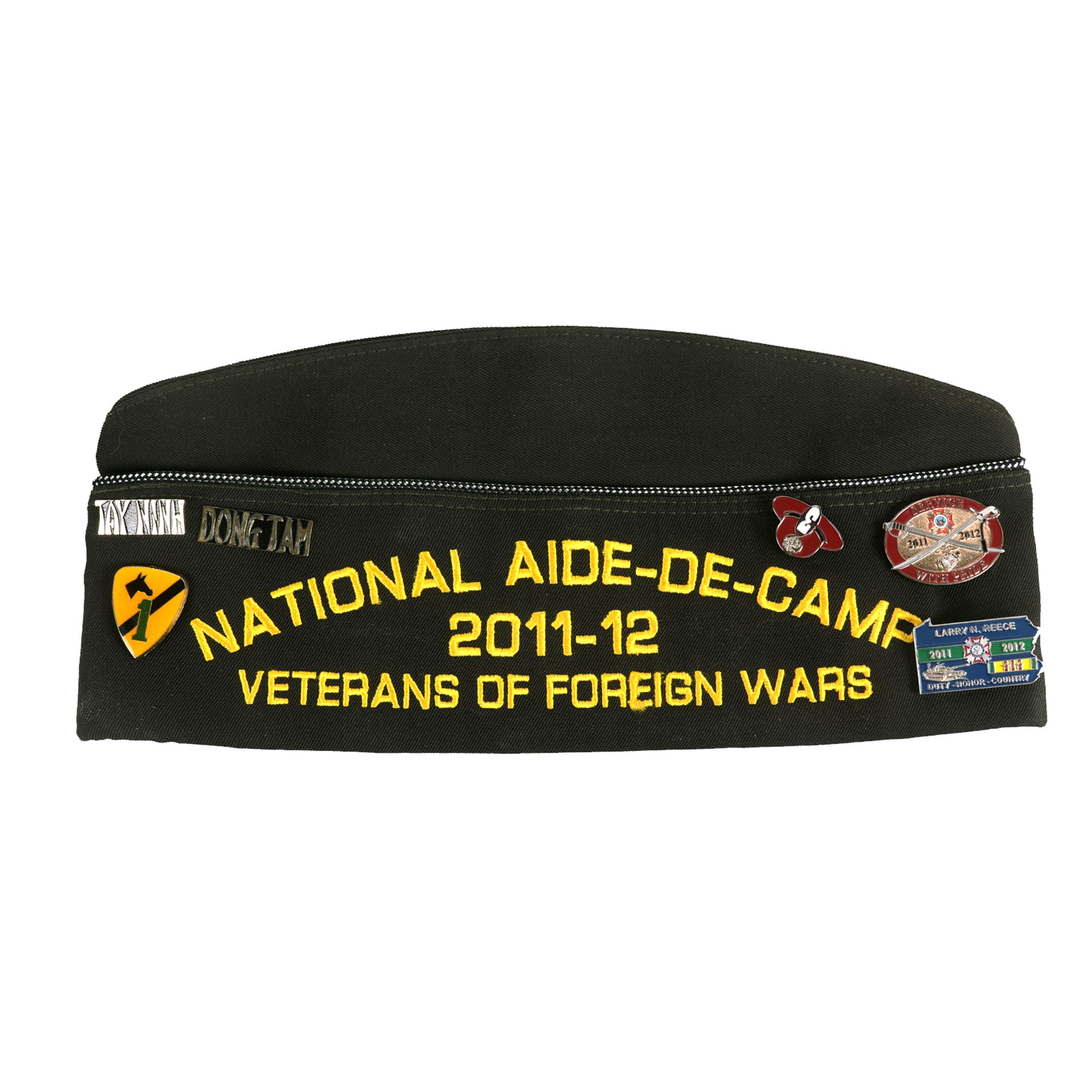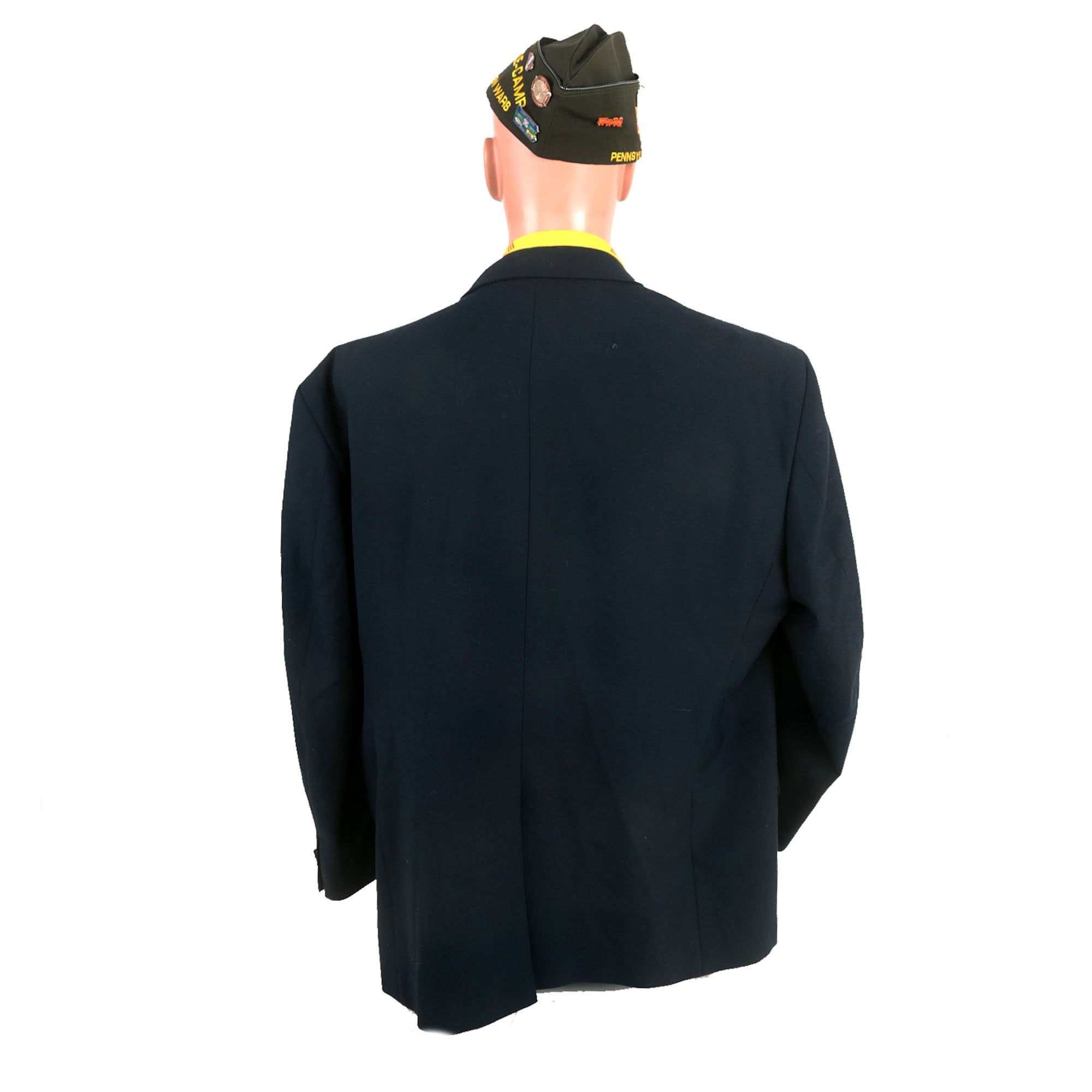 -Veteran’s Reunion Blazer with VFW Overseas Cap. Just the way it was pulled from the closet. The Blazer is a contemporary garment worn at reunions. On the jacket is Smith’s original 3/17th Stogie “Beercan”, contemporary miniature ribbon rack, and miniature Army Pilot Wings. The Cap features various pins.