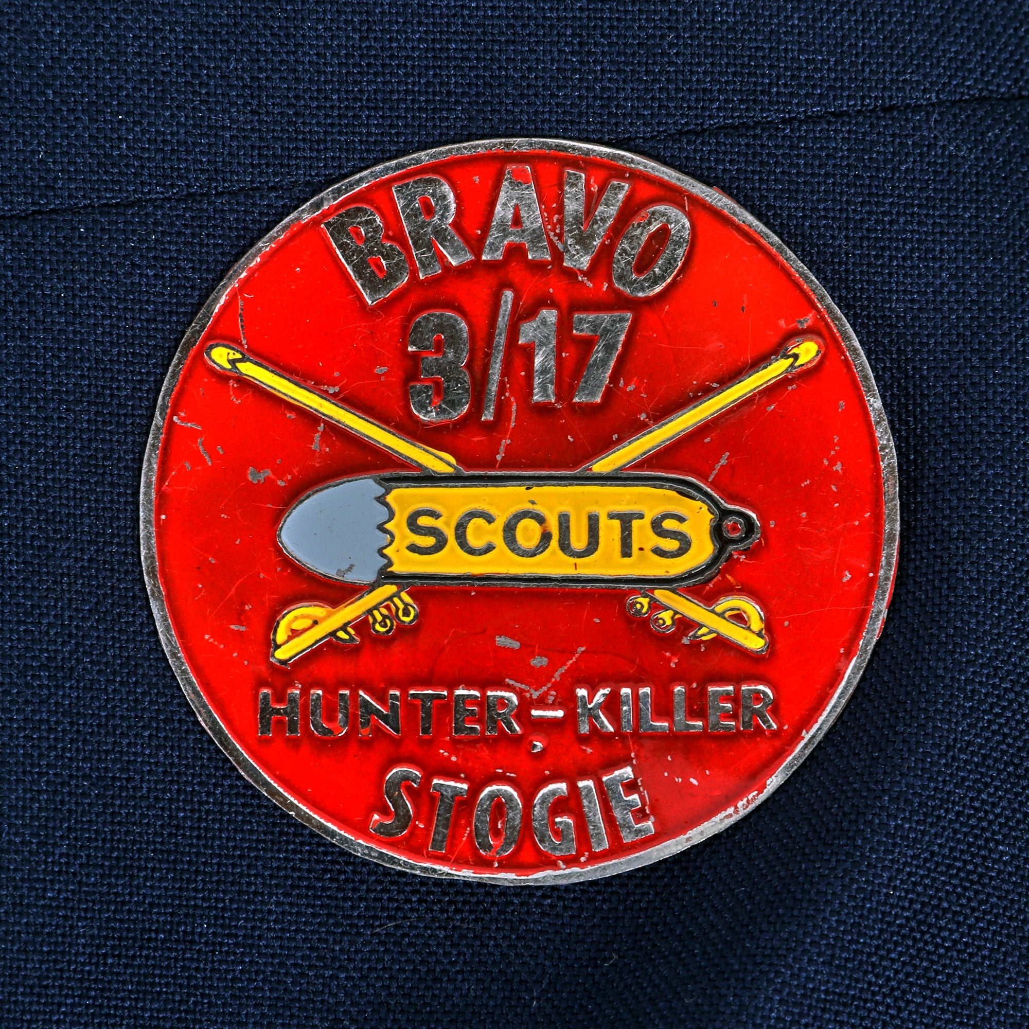 -B Troop, 3/17th Cavalry “Beercan” Insignia “Pocket Patch”. This is an original piece which was obtained in Vietnam and worn by Smith at reunions. It is currently on his Blazer Smith wore to reunions.