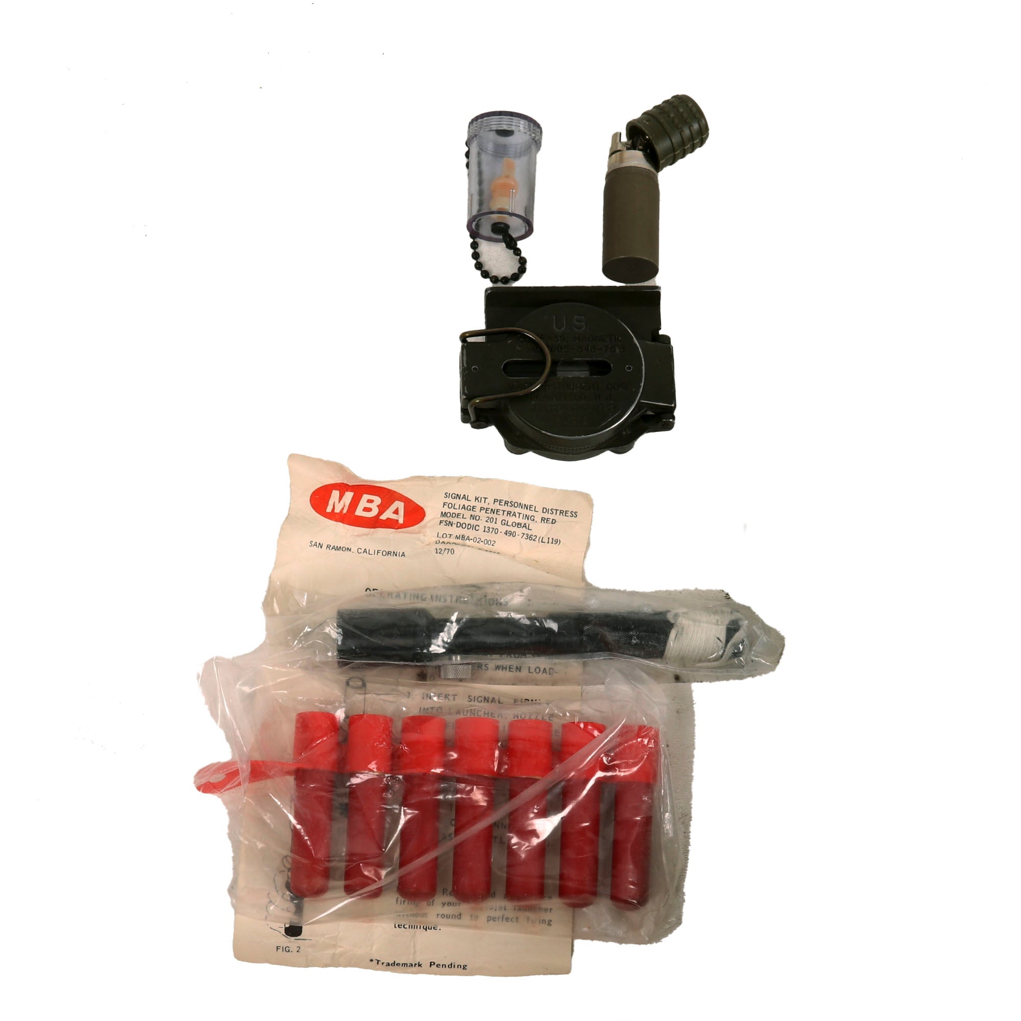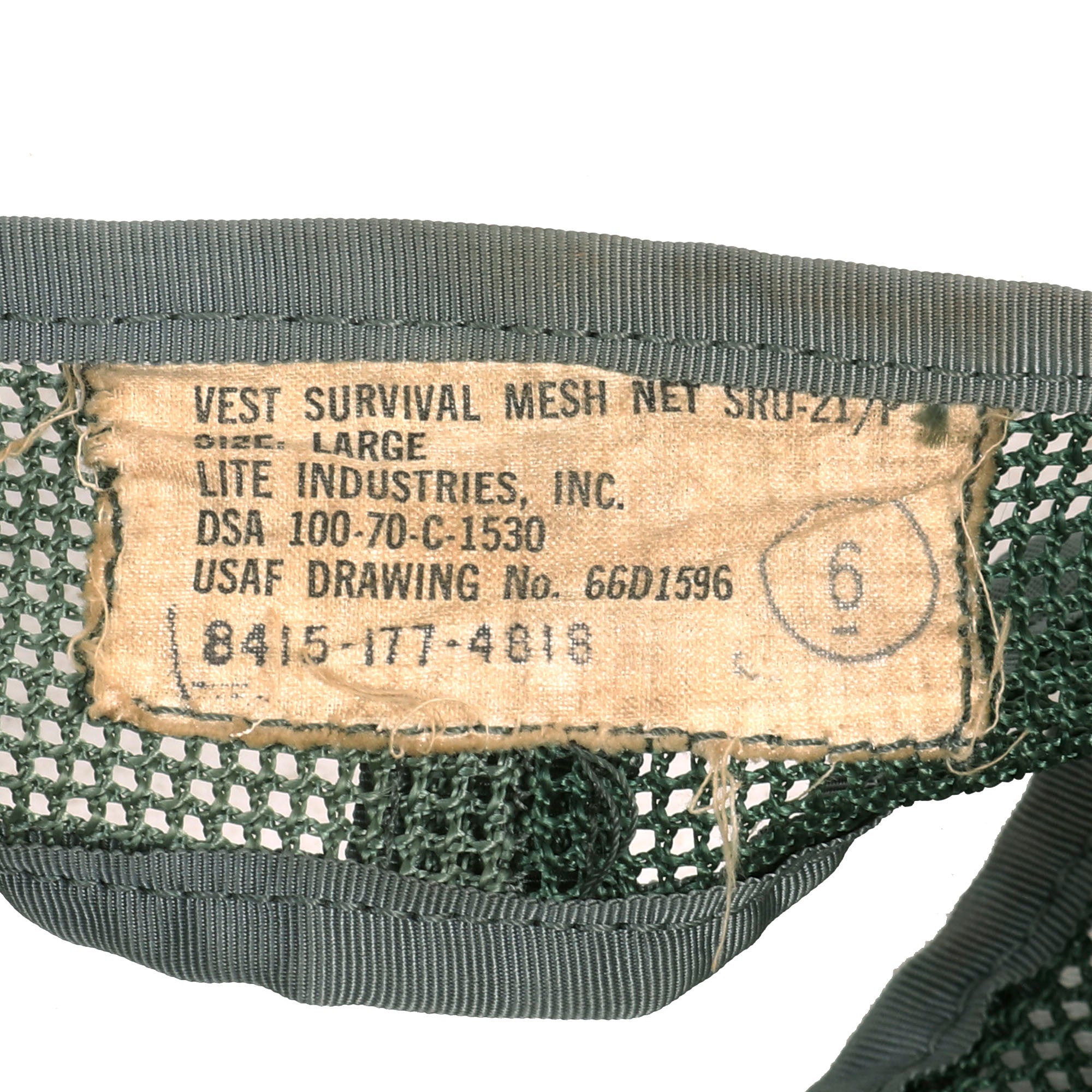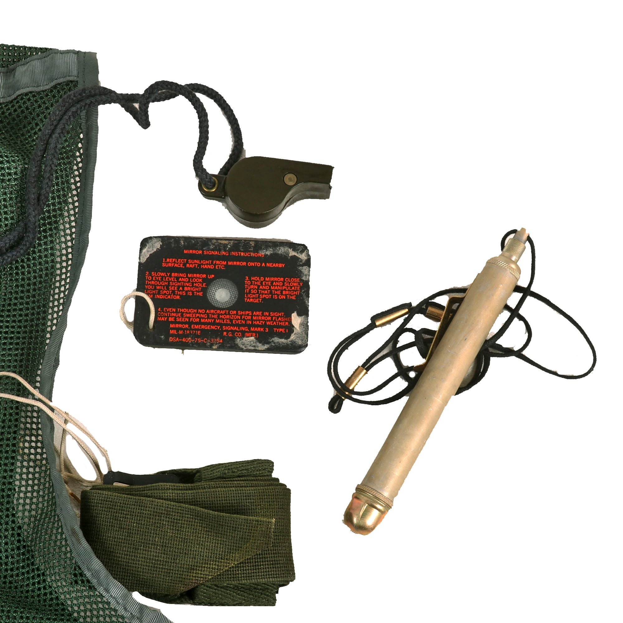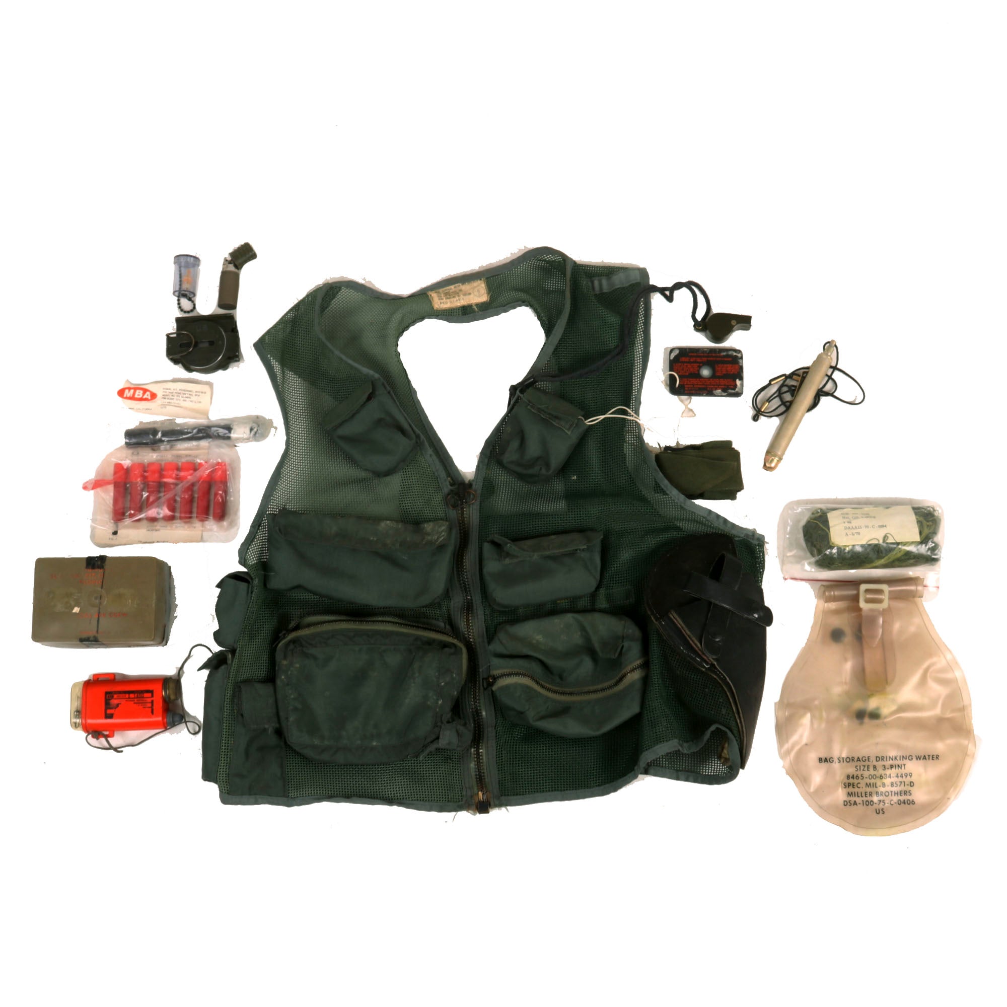 -Survival Vest with Contents, SRU-21/P, Dated 1970. Size Large. Includes a complete HOT/WET Survival Kit, Survival Net Dated 1970, Tourniquet, Survival Lighter, Earplugs with Case, “U.S.” Marked Pilot’s Pen Flashlight, Issue Penflare (Sealed) with Flares (Sealed), with 1970 Dated Instruction Sheet, Signal Mirror, Whistle (Postwar Dated), Signal/Distress Strobe, 1969 Dated Lensatic Compass (marked “radioactive”), Collapsible Water Bladder.