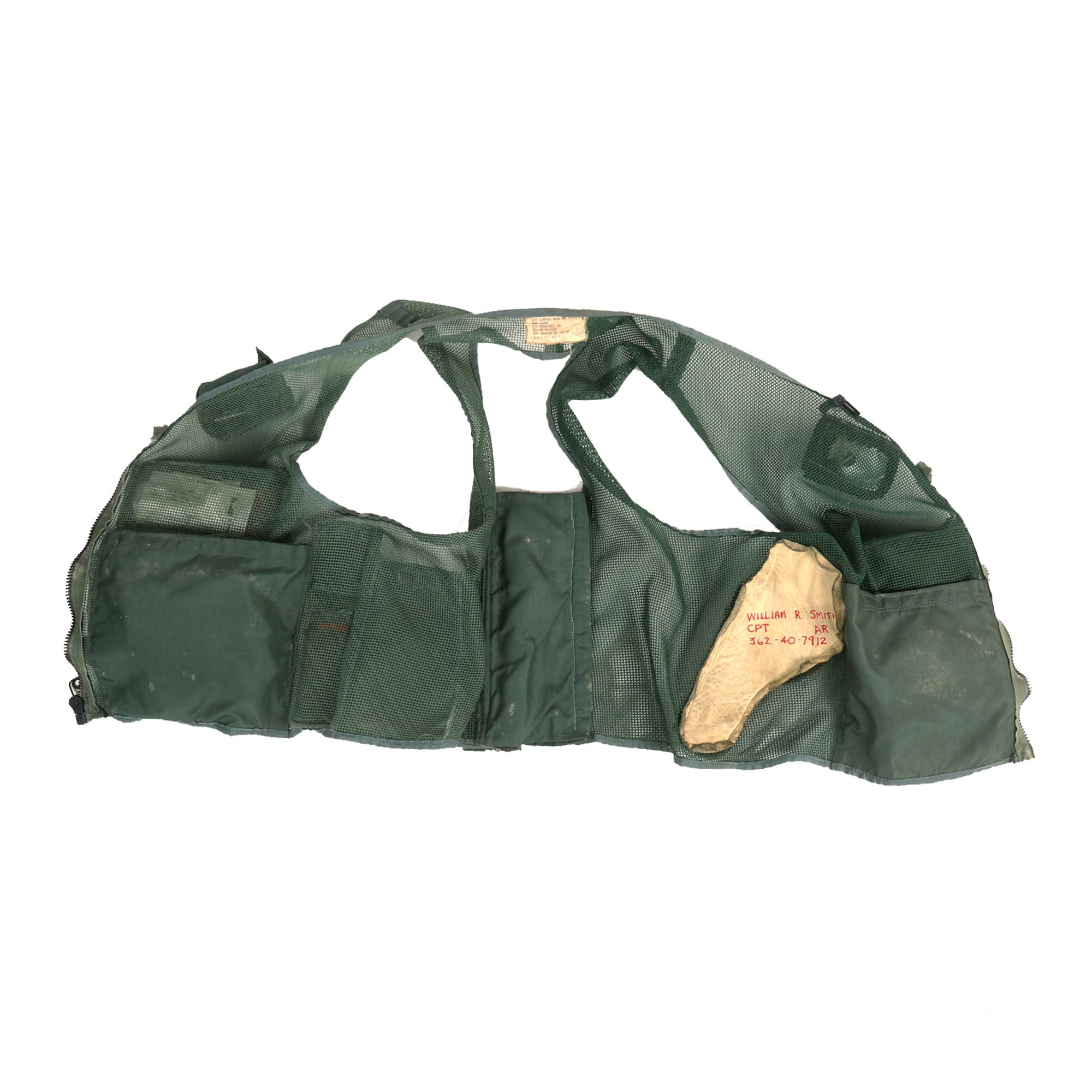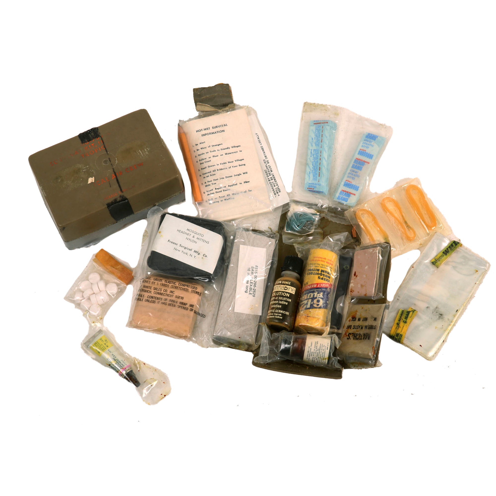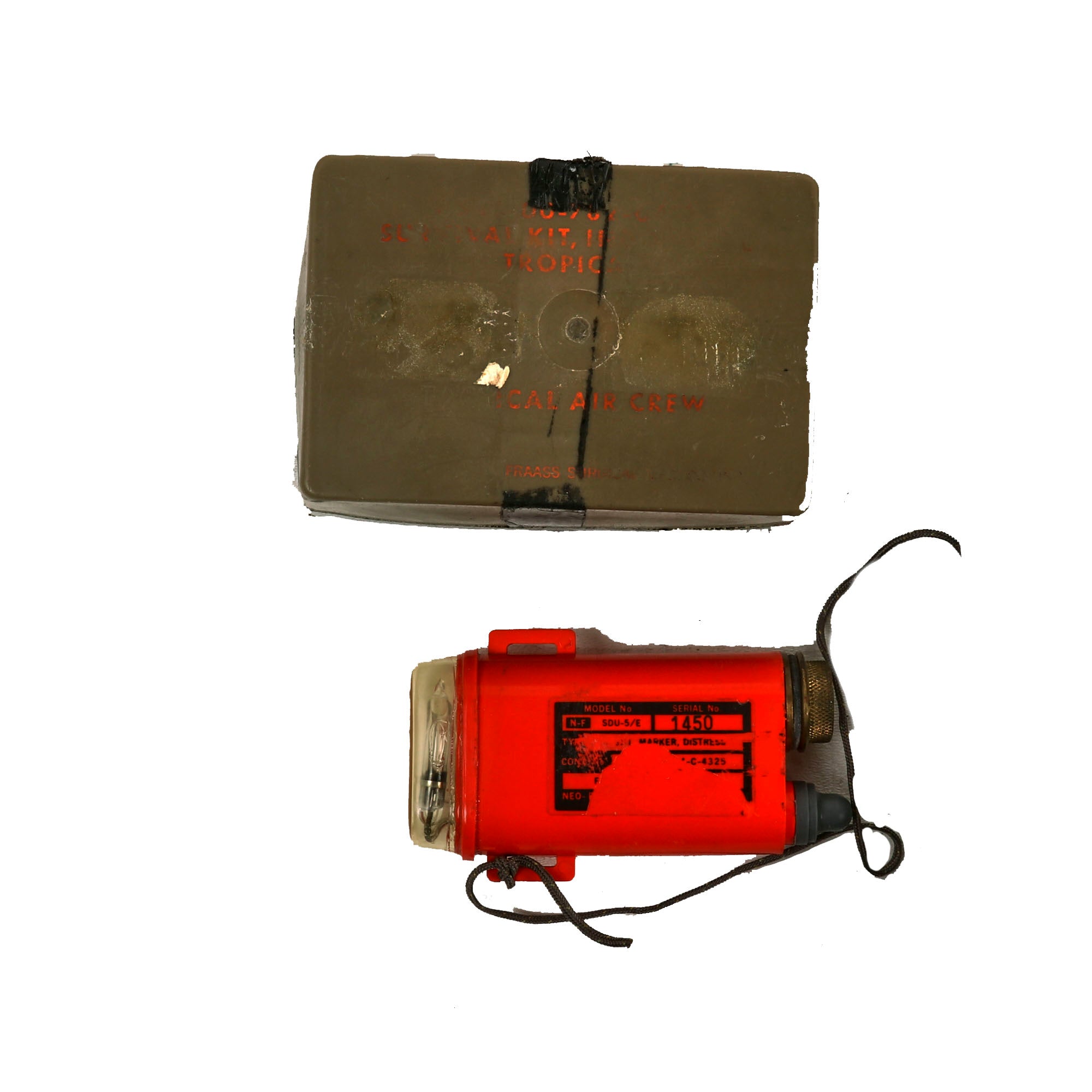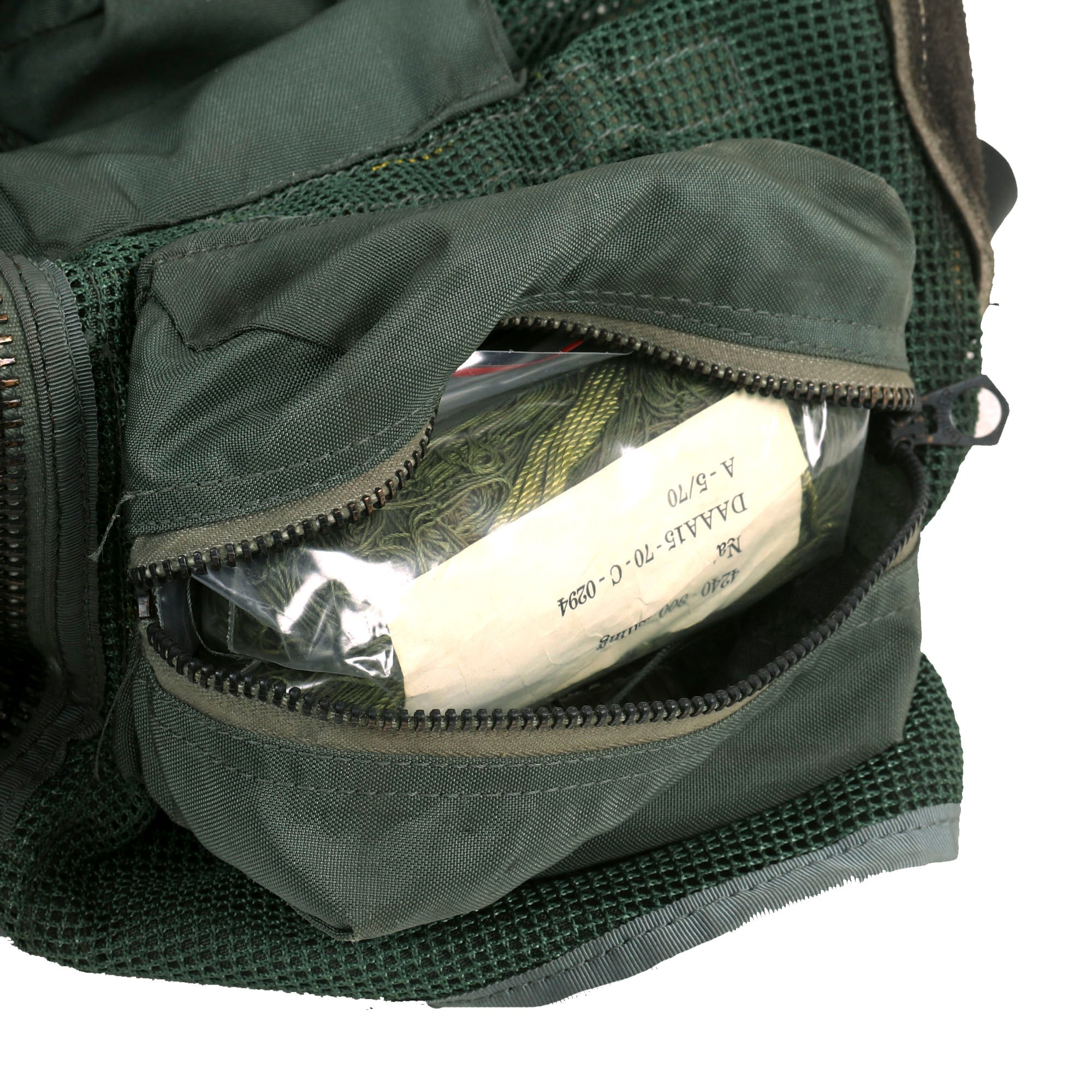 -Survival Vest with Contents, SRU-21/P, Dated 1970. Size Large. Includes a complete HOT/WET Survival Kit, Survival Net Dated 1970, Tourniquet, Survival Lighter, Earplugs with Case, “U.S.” Marked Pilot’s Pen Flashlight, Issue Penflare (Sealed) with Flares (Sealed), with 1970 Dated Instruction Sheet, Signal Mirror, Whistle (Postwar Dated), Signal/Distress Strobe, 1969 Dated Lensatic Compass (marked “radioactive”), Collapsible Water Bladder.