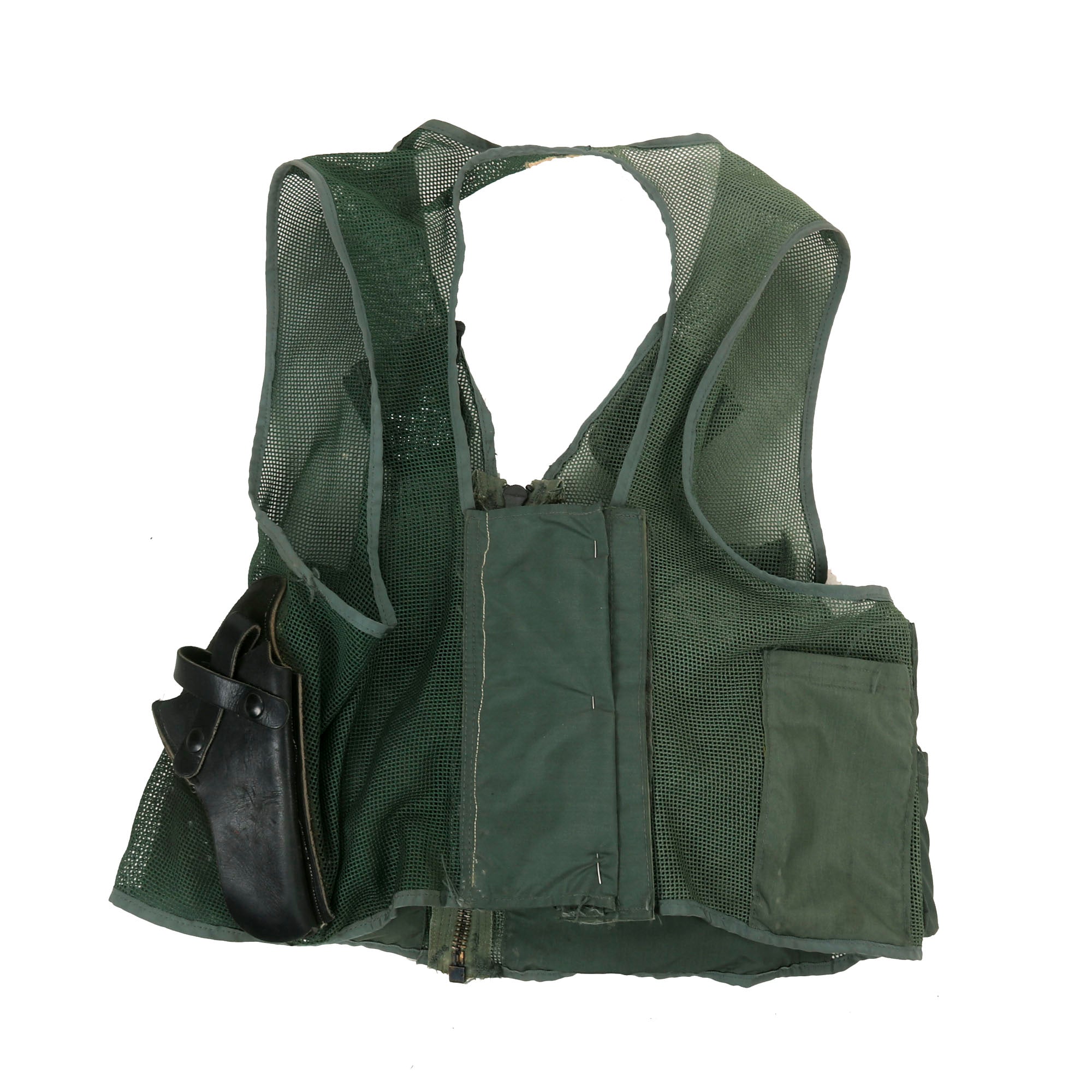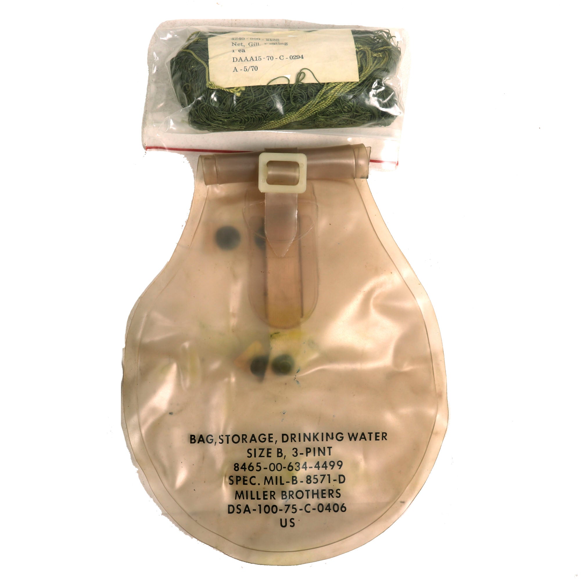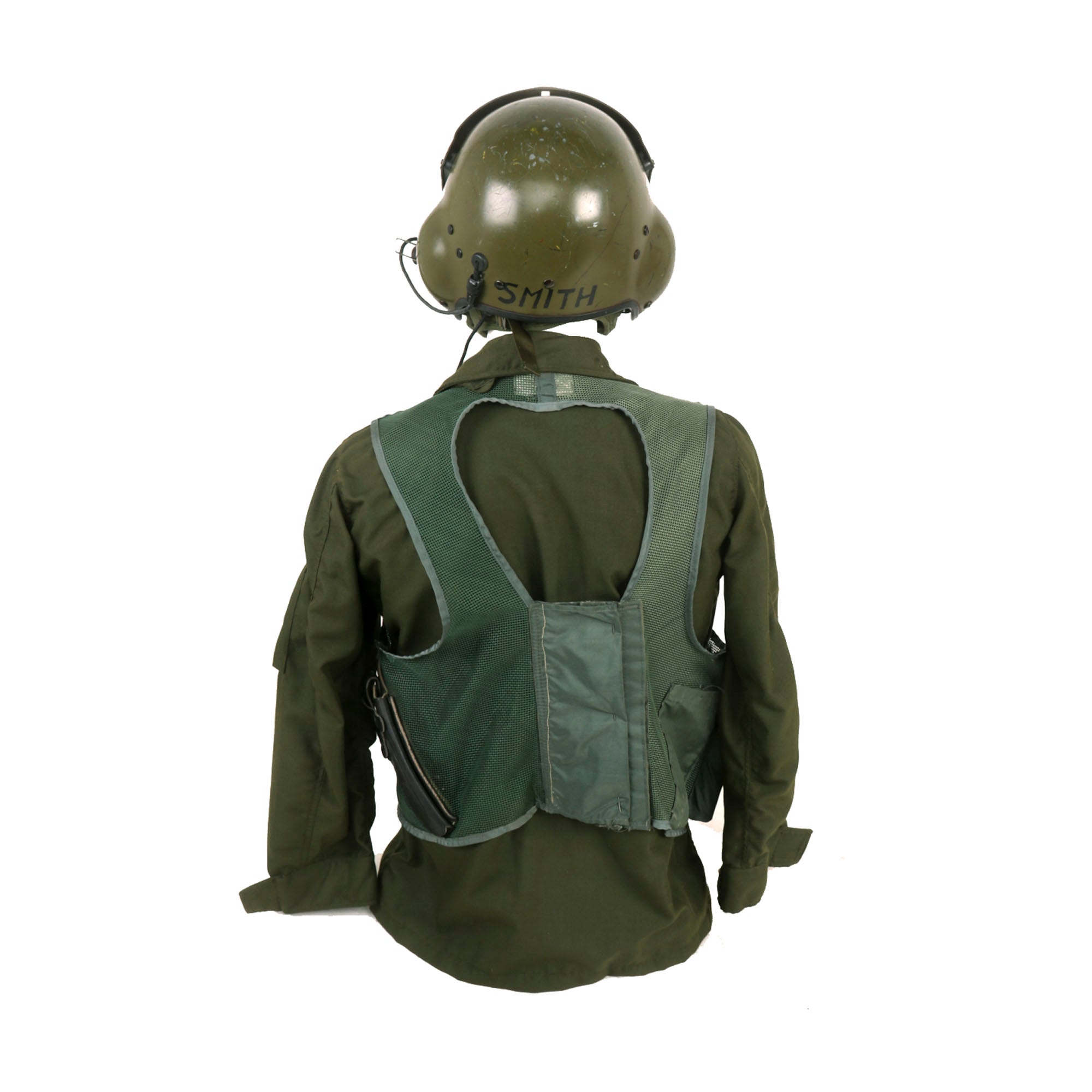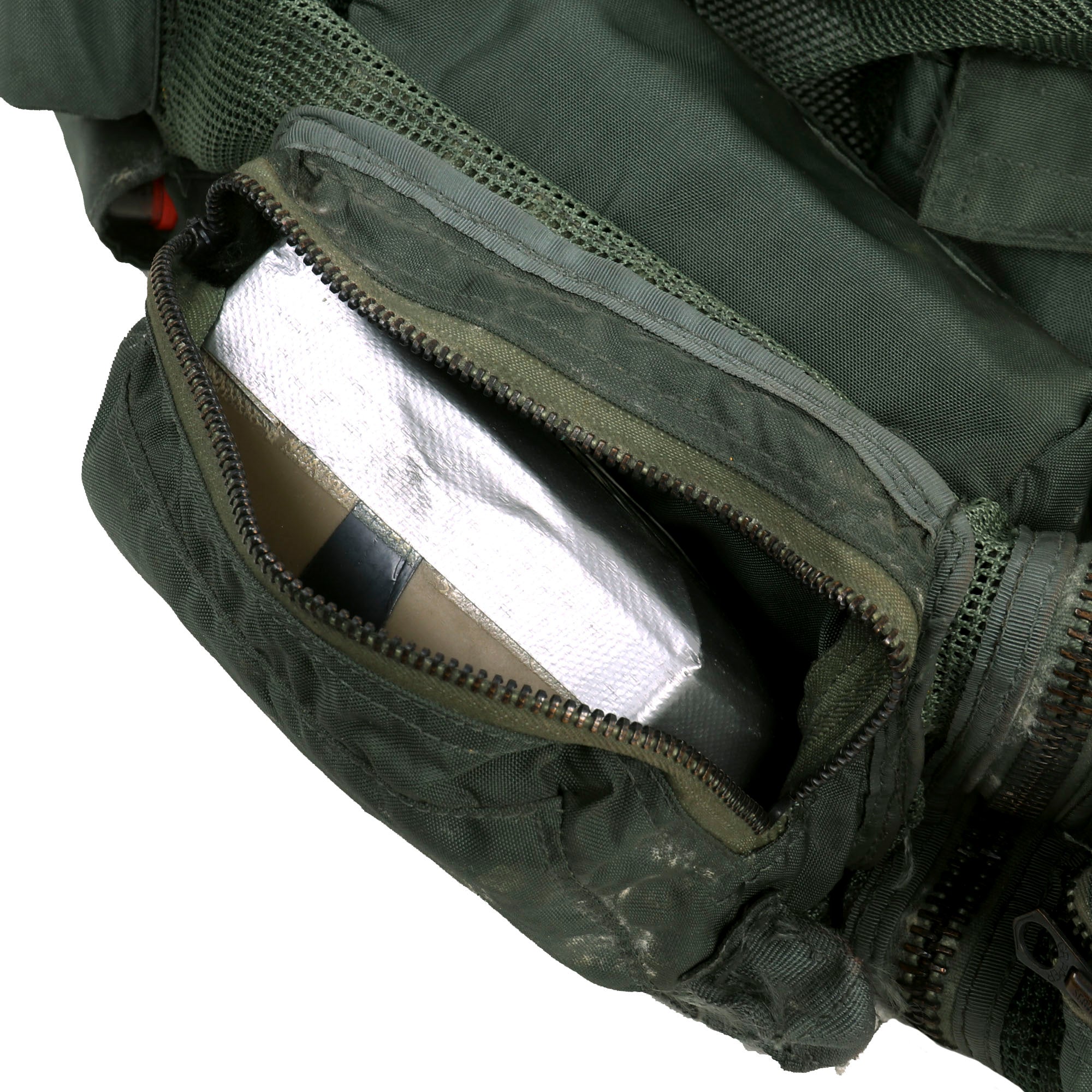 -Survival Vest with Contents, SRU-21/P, Dated 1970. Size Large. Includes a complete HOT/WET Survival Kit, Survival Net Dated 1970, Tourniquet, Survival Lighter, Earplugs with Case, “U.S.” Marked Pilot’s Pen Flashlight, Issue Penflare (Sealed) with Flares (Sealed), with 1970 Dated Instruction Sheet, Signal Mirror, Whistle (Postwar Dated), Signal/Distress Strobe, 1969 Dated Lensatic Compass (marked “radioactive”), Collapsible Water Bladder.