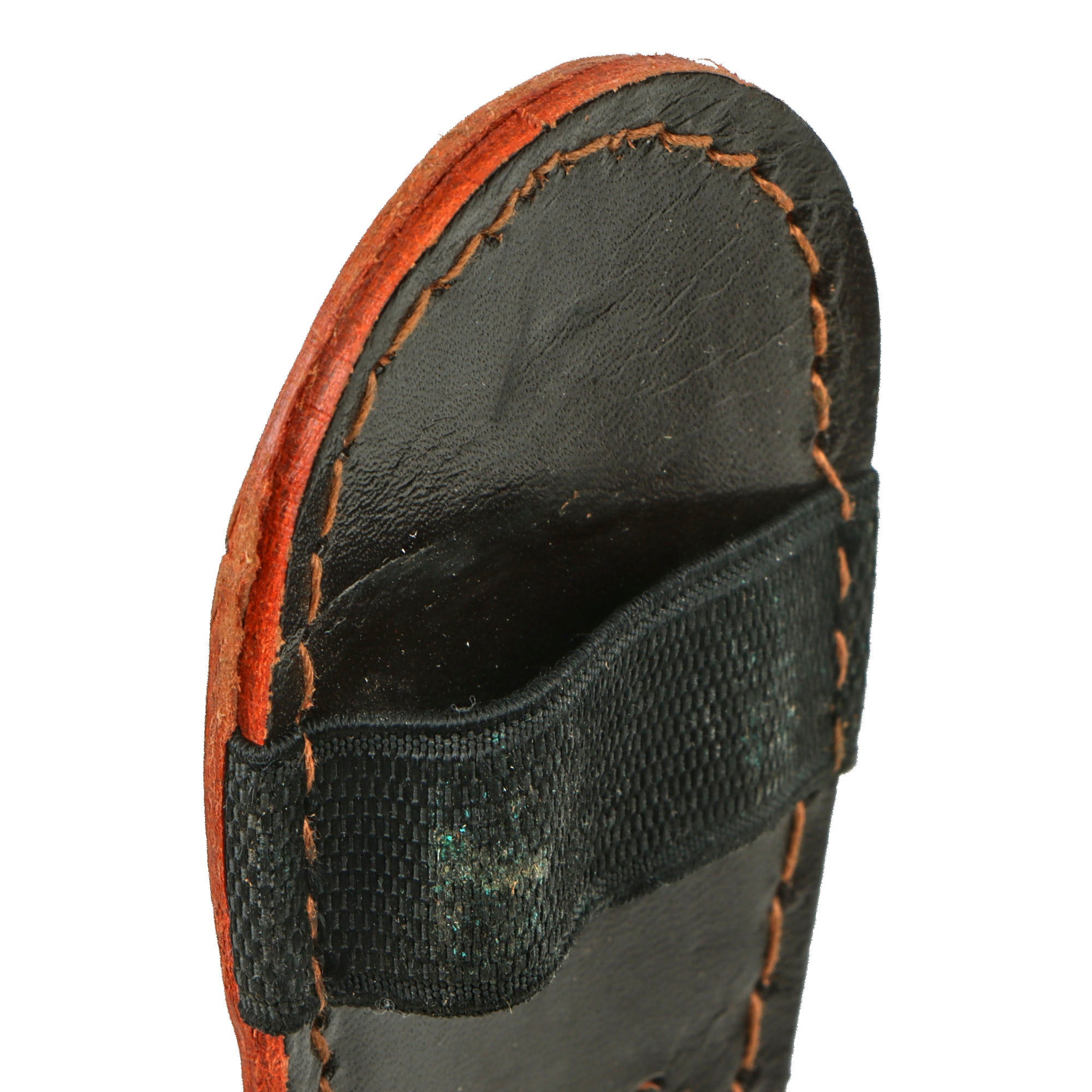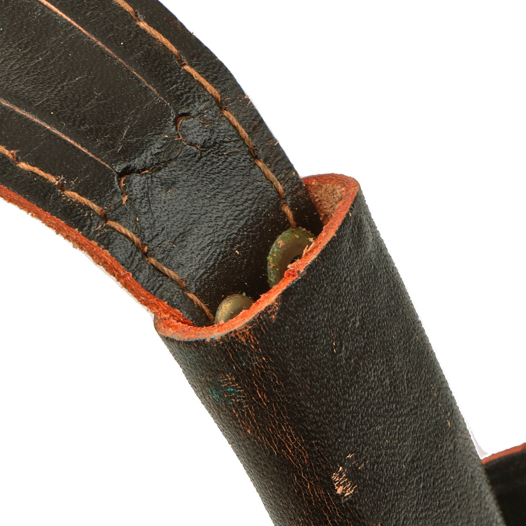 This example comes in a scabbard modeled after the British pattern with the leather tongue and elastic retaining strap. The strap is intact but fragile. The brass drag is missing much of its paint.