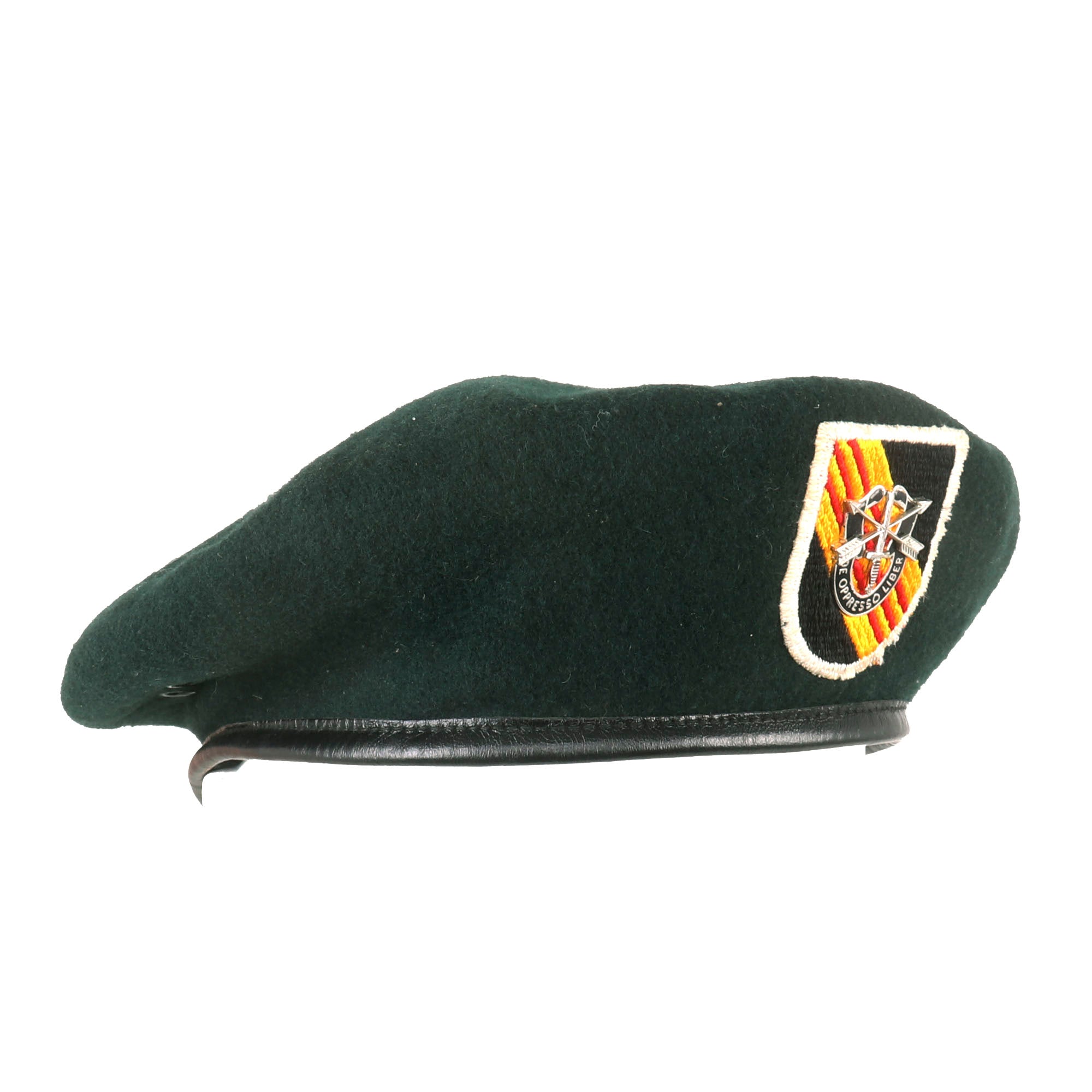 The flash on the front is for the 5th Special Forces Group (Airborne). Only those personnel who were assigned to the 5th Special Forces Group (Airborne) are authorized to wear this flash, which is placed on the green beret so that it is positioned directly above the left eye when the beret is properly. Enlisted personnel wear the Special Forces Regimental Distinctive Insignia centered on the flash, while Officers center their non-subdued rank insignia on it.