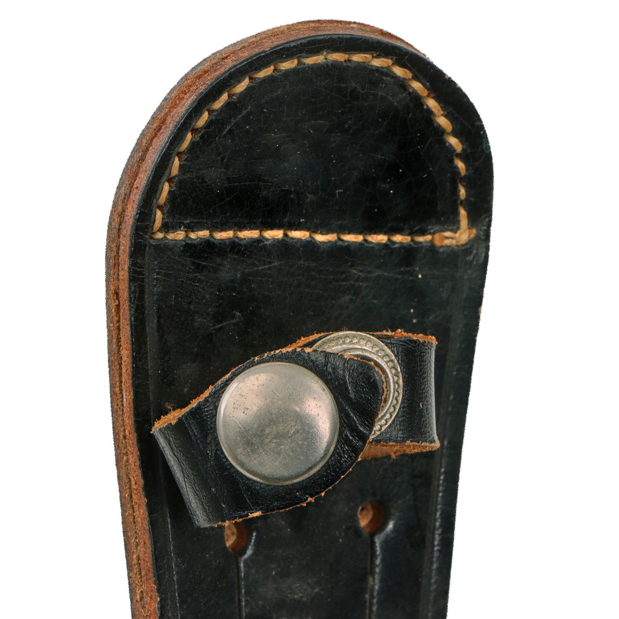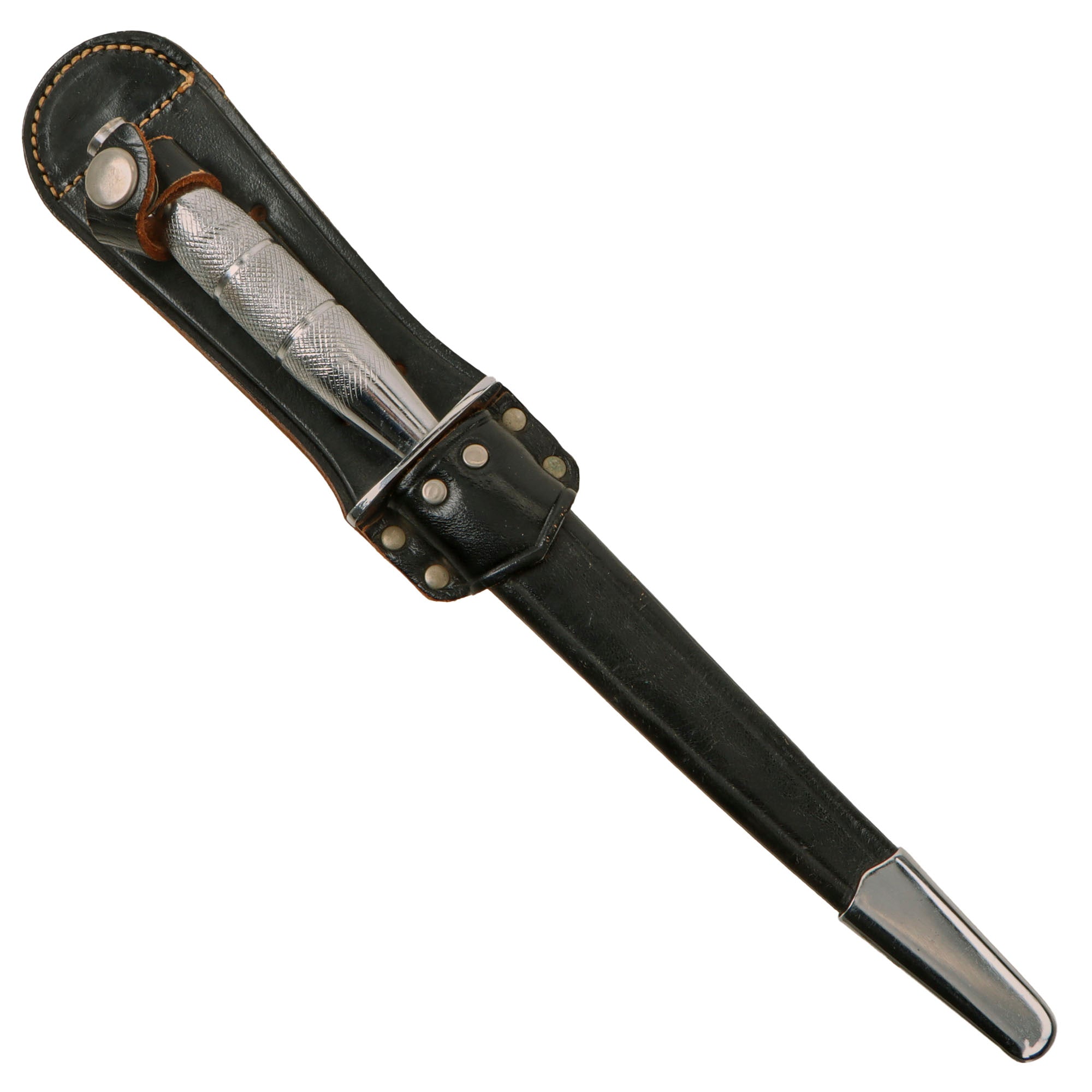 The knives were given to the troops after a tour "in-country," It is a very well built knife whose only drawback is the nickel or chrome plating on the blade. This one comes in the original correct sheath heavily modeled after the Sykes knife sheath. The securing snap and strap is intact but a bit worn. There is minor crazing in the leather.