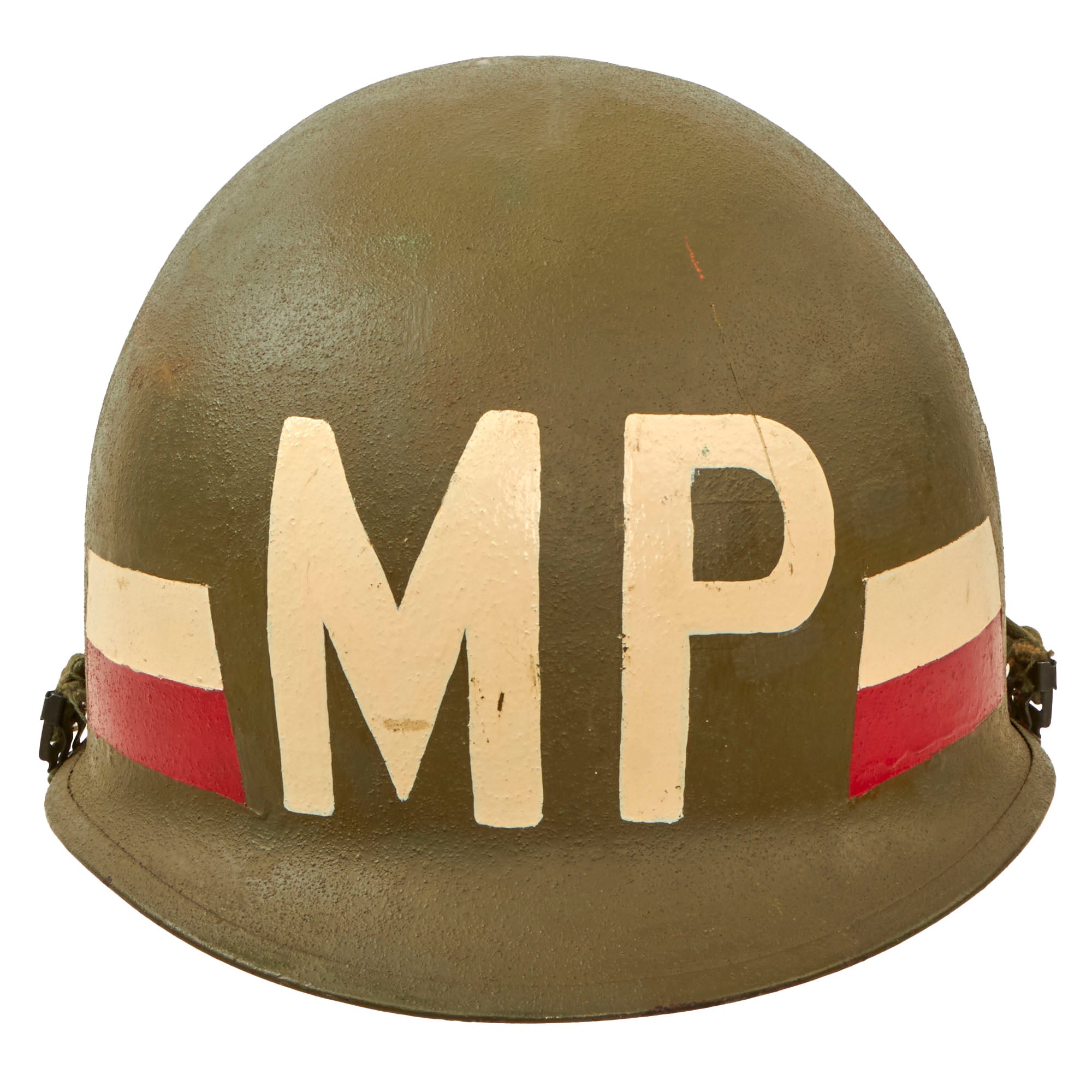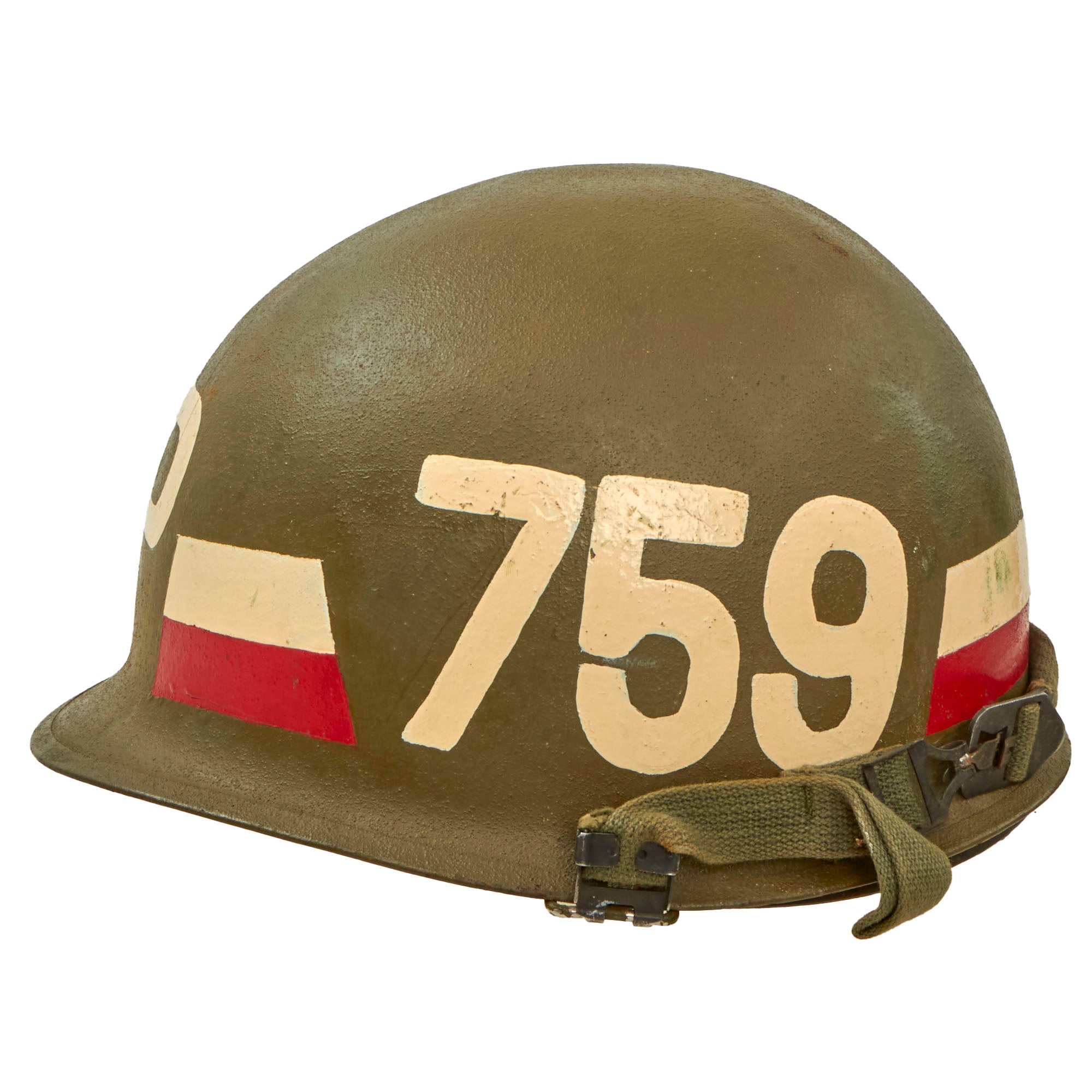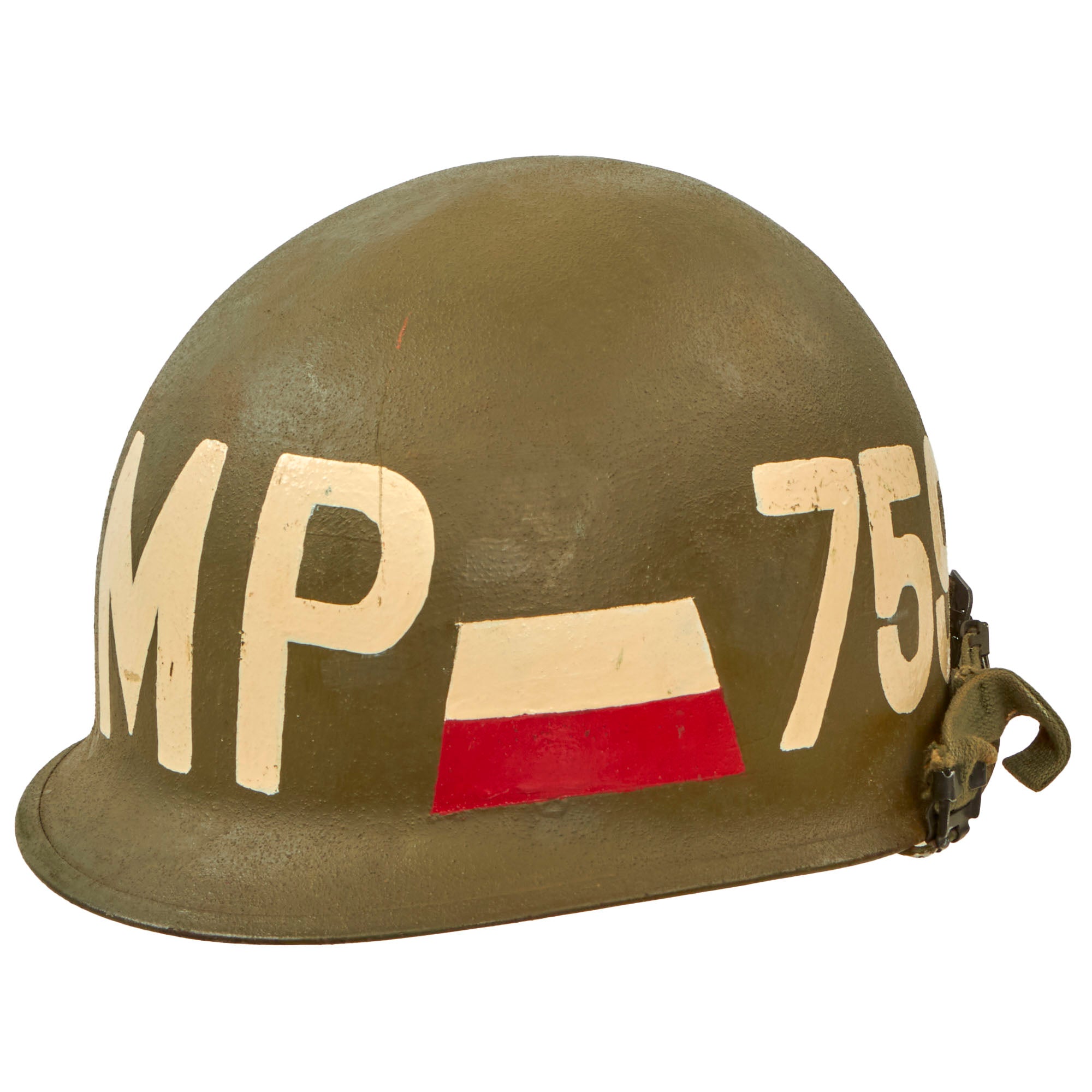 This helmet is a fine example and still retains all of its original Vietnam War parts, and the shell has the original dark OD Green finish. The exterior has MP painted on the front, with 759 on the side for the 759th Military Police Battalion, and the correct Red and White stripes for a Vietnam War era member of the Military Police. These helmets are quite a bit harder to find than unmarked ones, and this is the first Vietnam MP helmet that we have had in a while.
