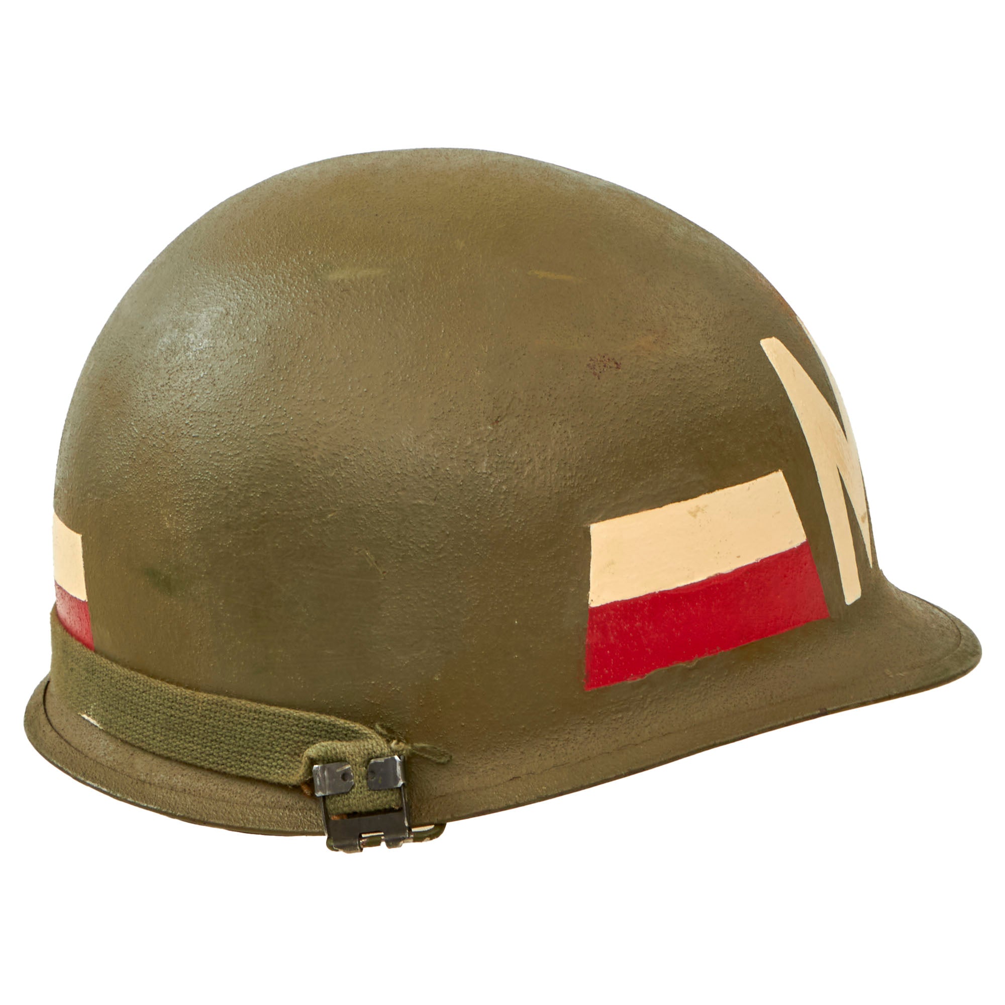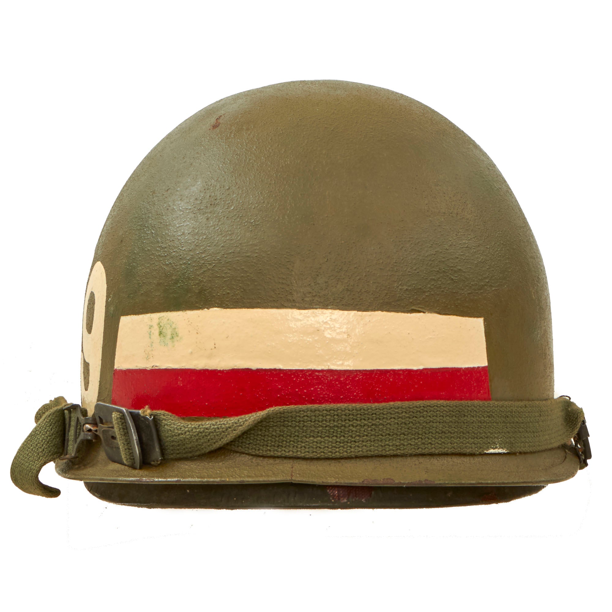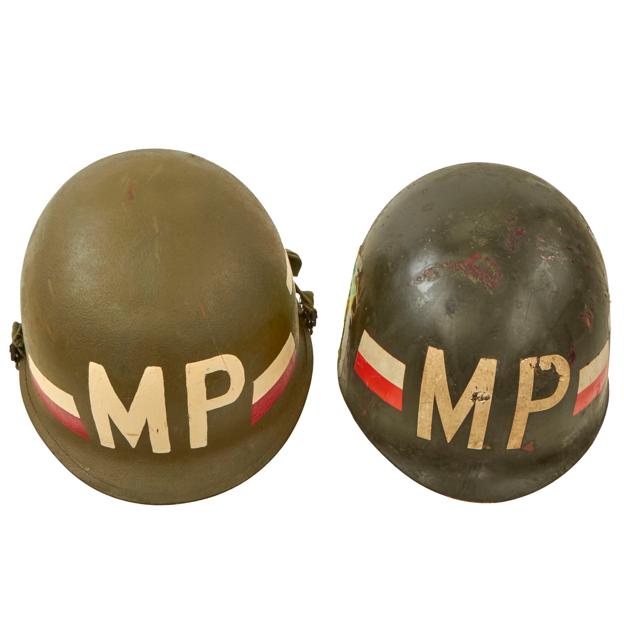 This helmet is a fine example and still retains all of its original Vietnam War parts, and the shell has the original dark OD Green finish. The exterior has MP painted on the front, with 759 on the side for the 759th Military Police Battalion, and the correct Red and White stripes for a Vietnam War era member of the Military Police. These helmets are quite a bit harder to find than unmarked ones, and this is the first Vietnam MP helmet that we have had in a while.