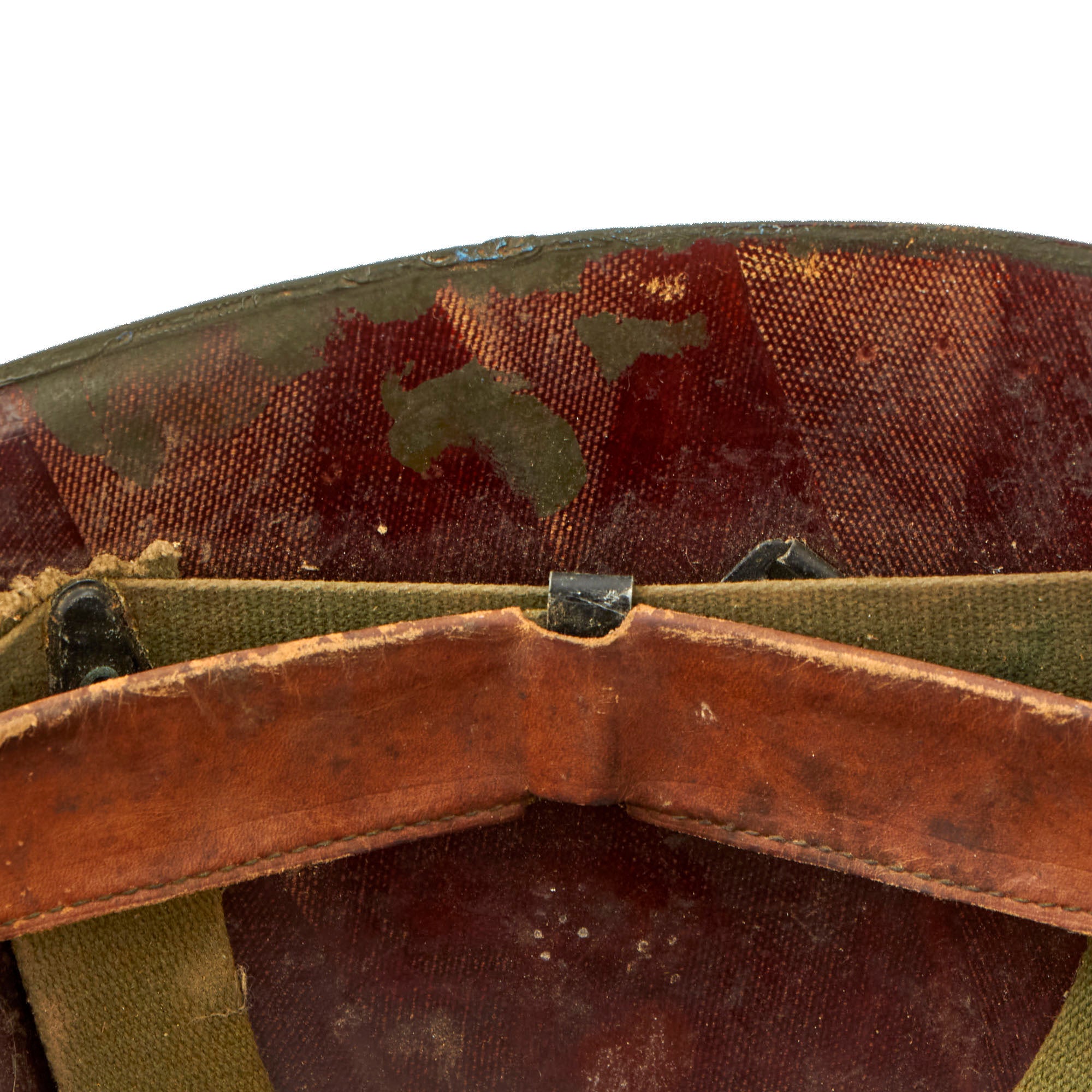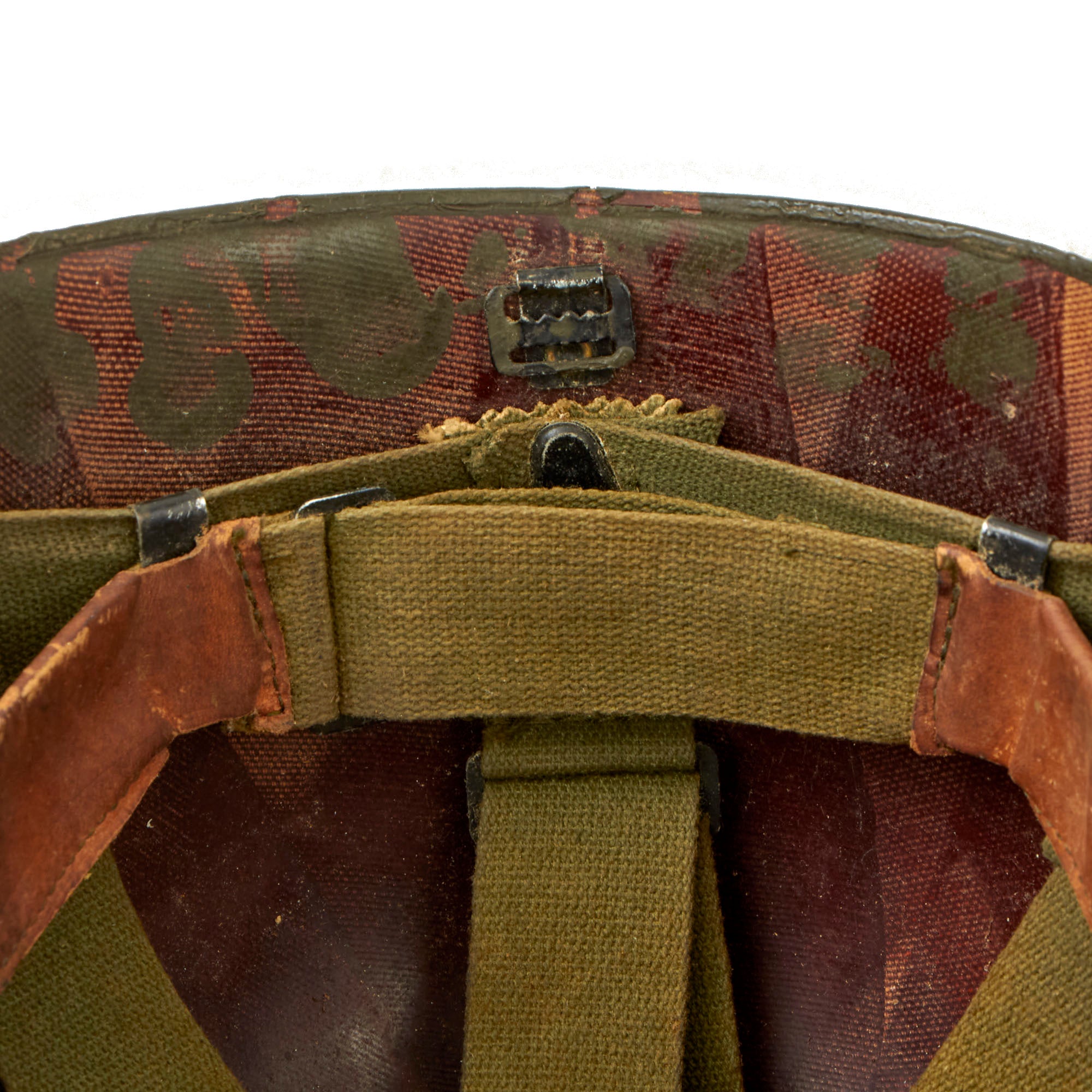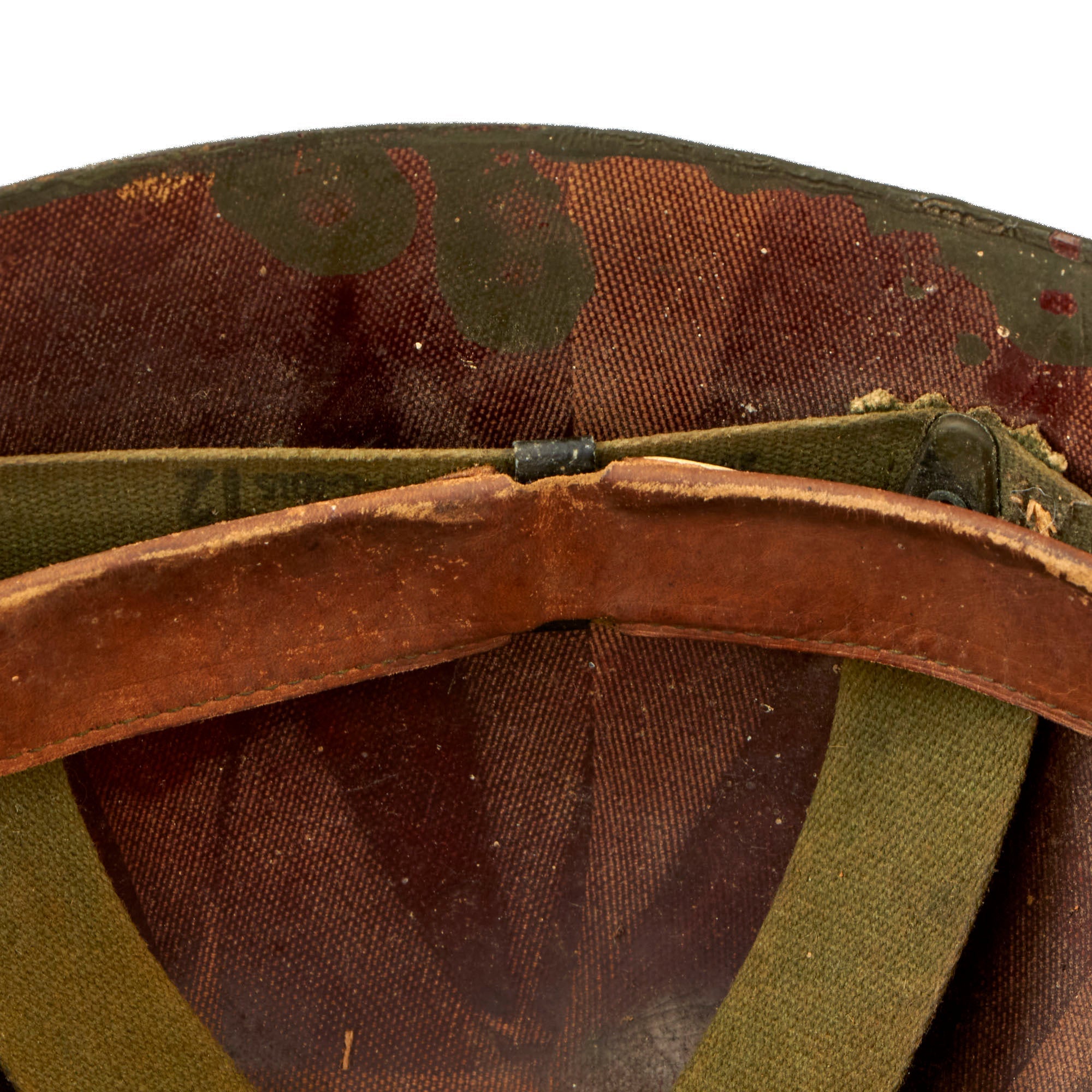 The liner is correct high pressure 1960s issue liner, marked on the inner crown with US / 29, a typical Vietnam Era liner marking. It has the classic support straps and rigging held in place by "A" Washers riveted to the liner, with a thick top tie. The sweatband is good, but does show quite a bit of wear and staining. This is definitely a helmet that saw extensive service. The liner chin strap is unfortunately missing, but the shell chin strap is intact and in great shape.