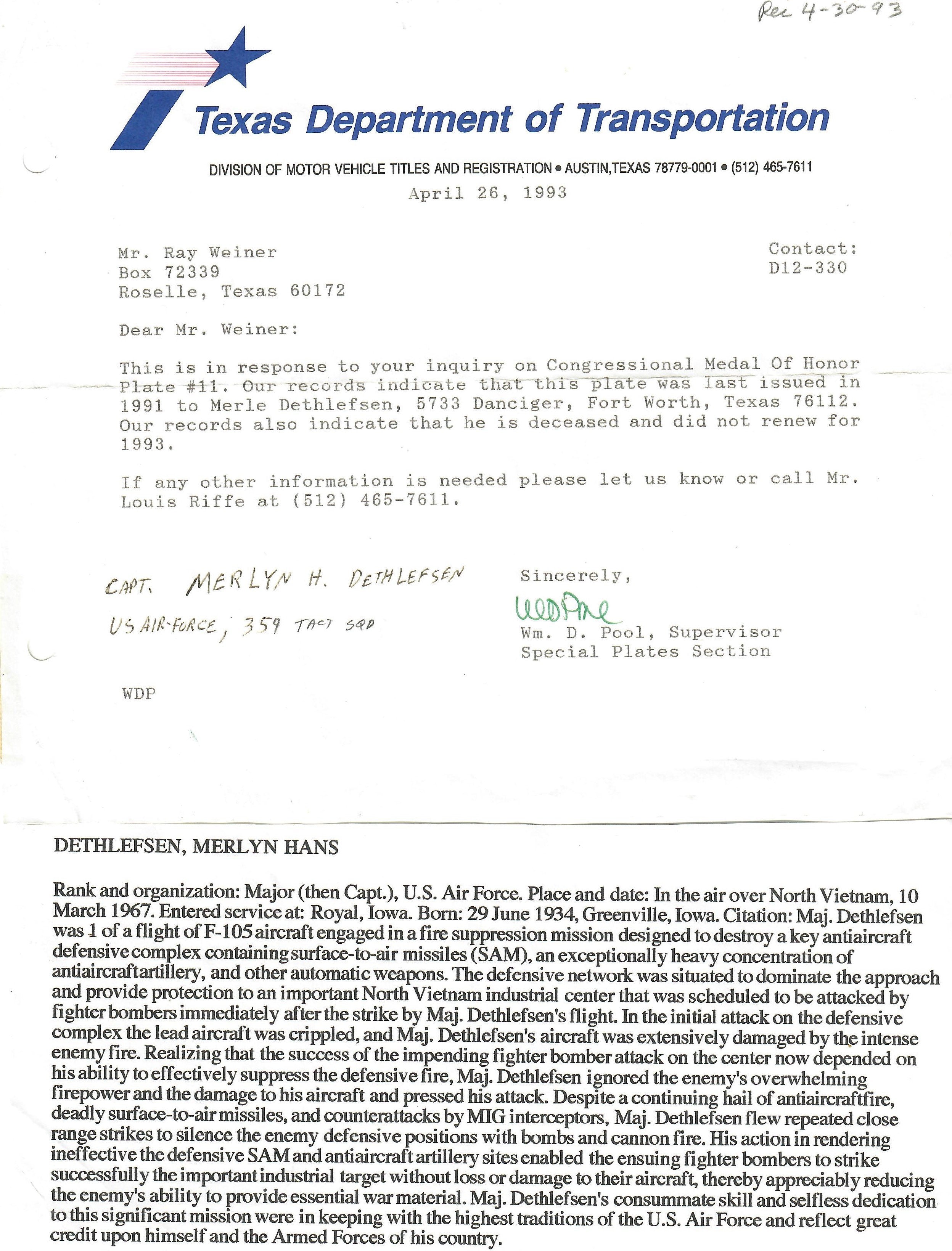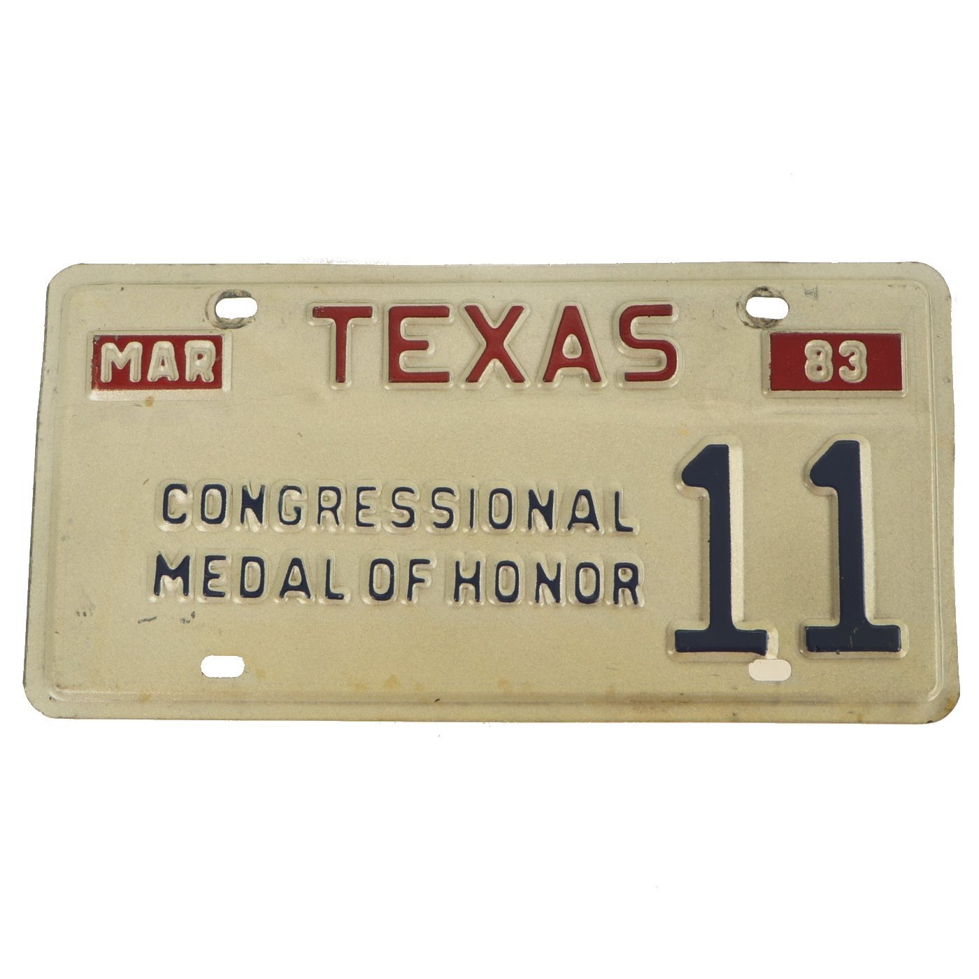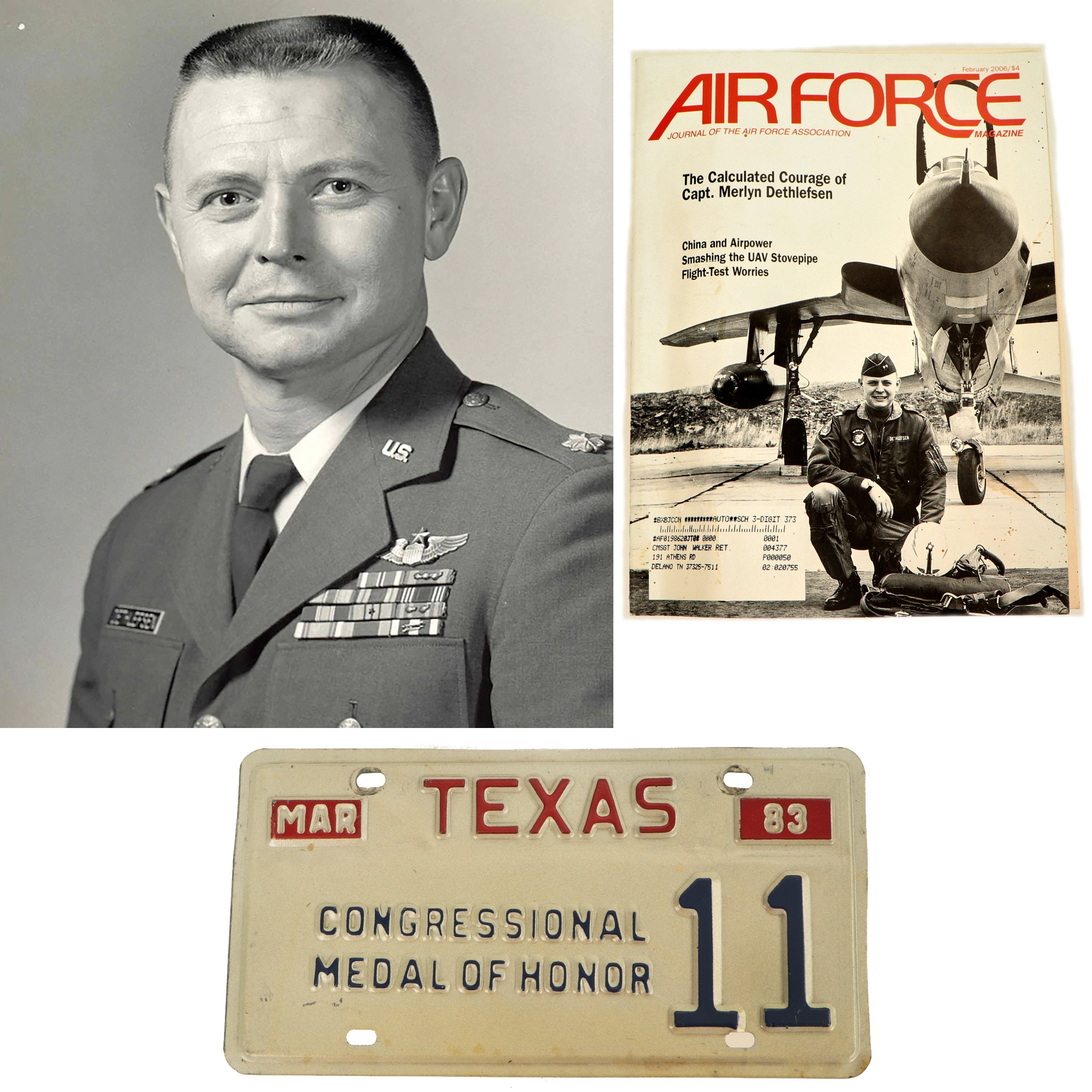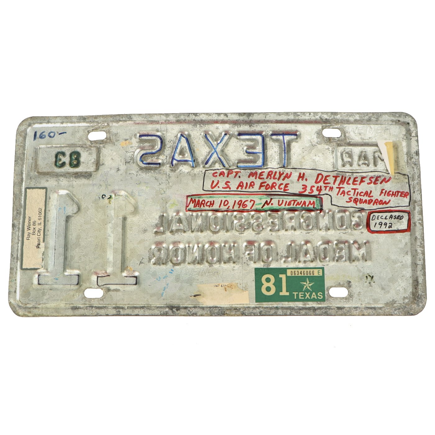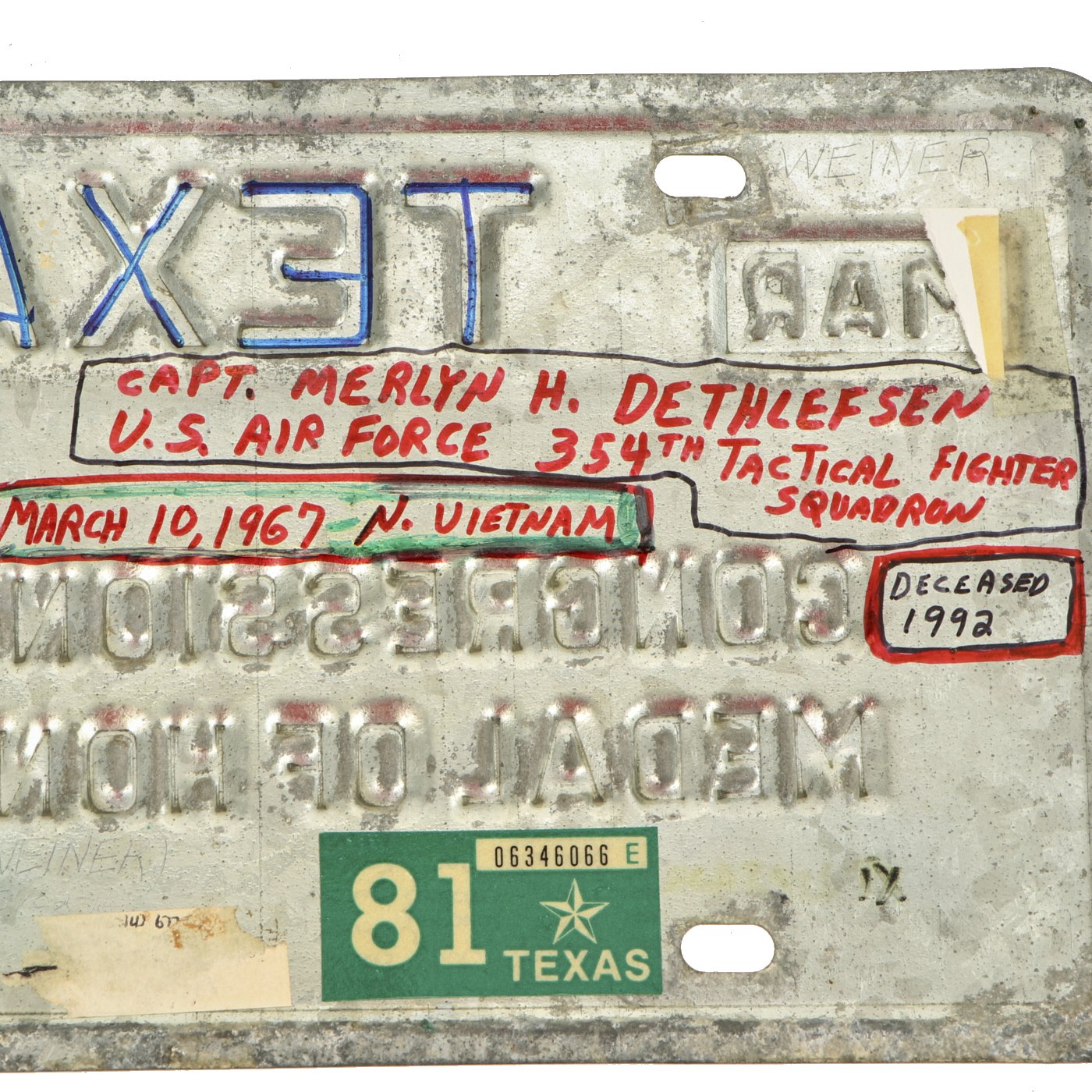 Original Item: One-of-a-kind. This is a genuine vintage license plate from the great state of Texas for Congressional Medal of Honor recipient Air Force Colonel Merlyn Dethlefsen. The plate reads: