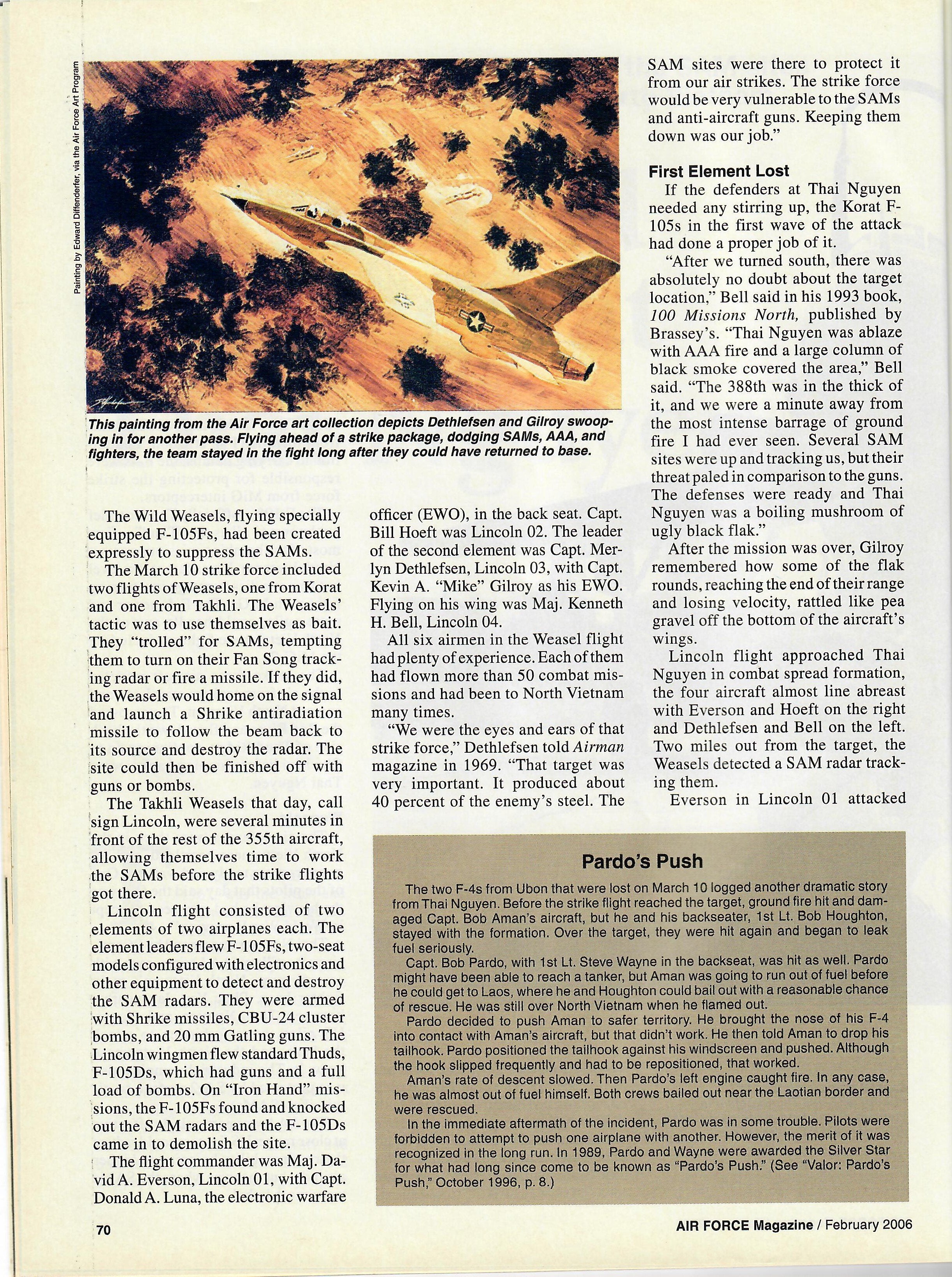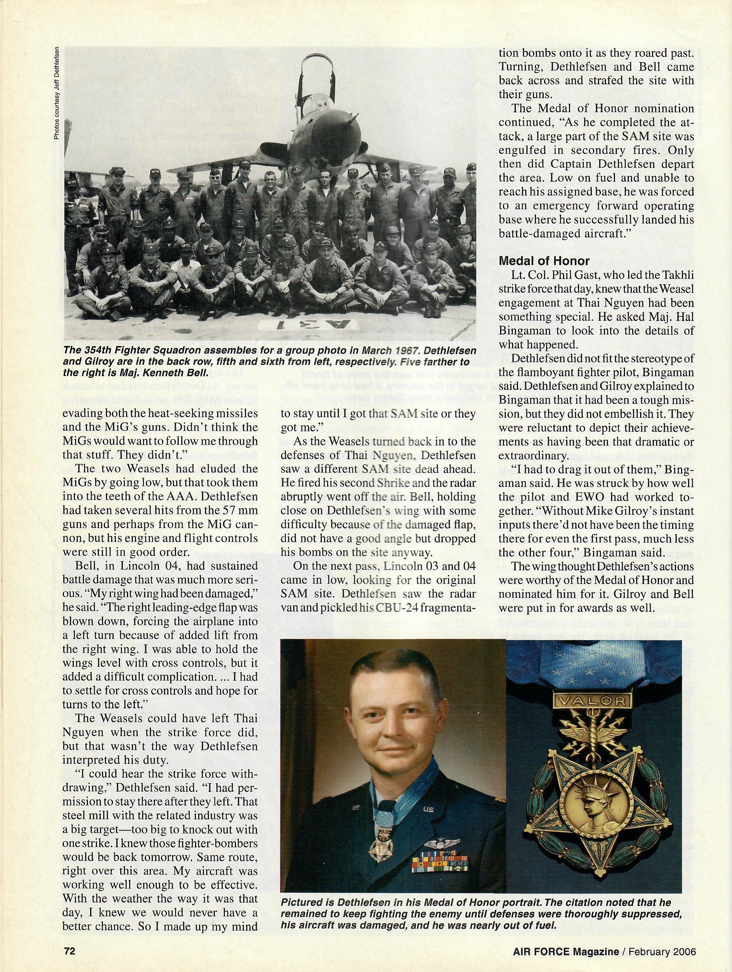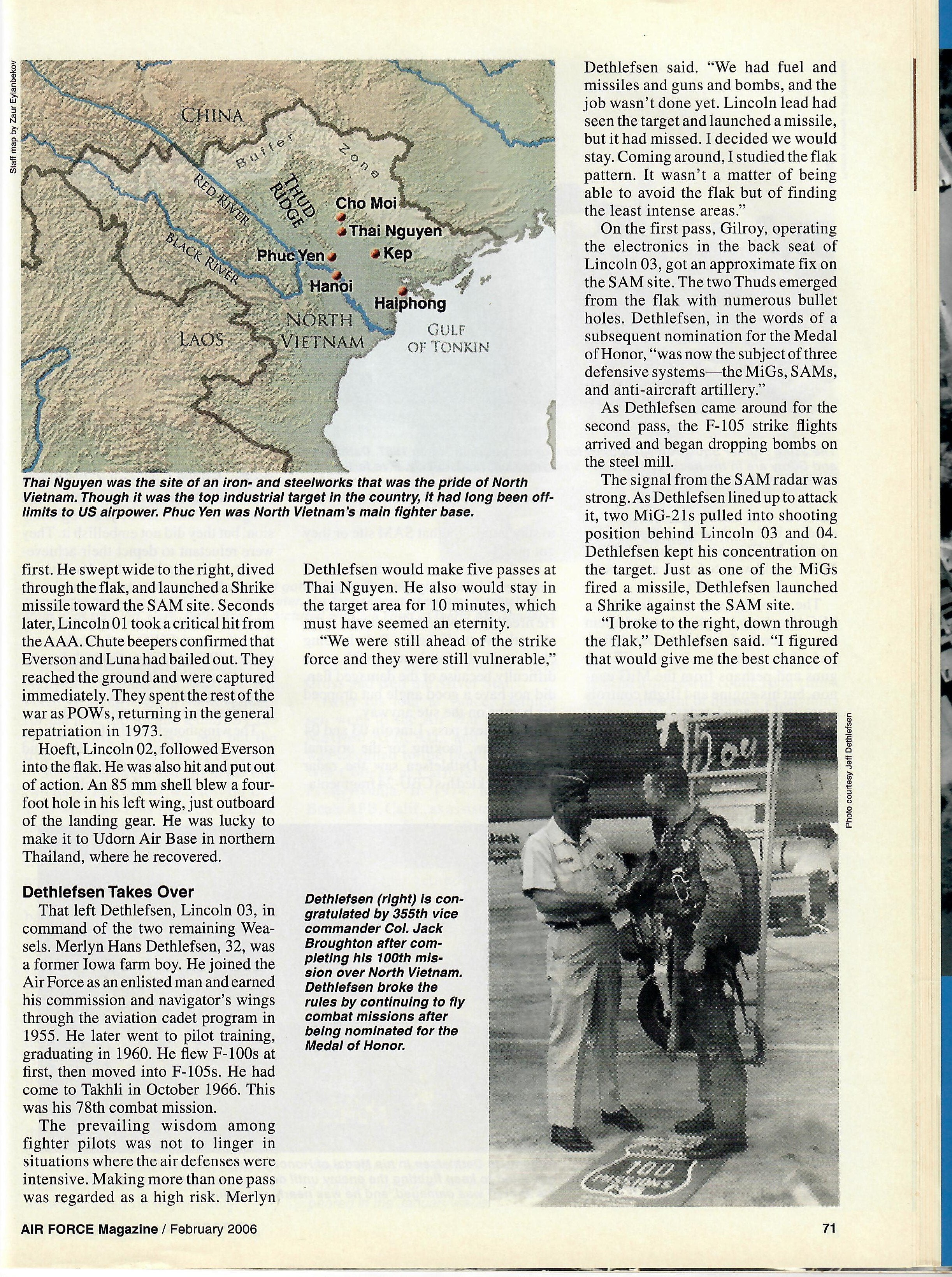 Dethlefsen, piloting the third aircraft in line, assumed leadership of the mission. Only he, his navigator, Capt. Mike Gilroy, and one other F-105 were left to carry out the plan.