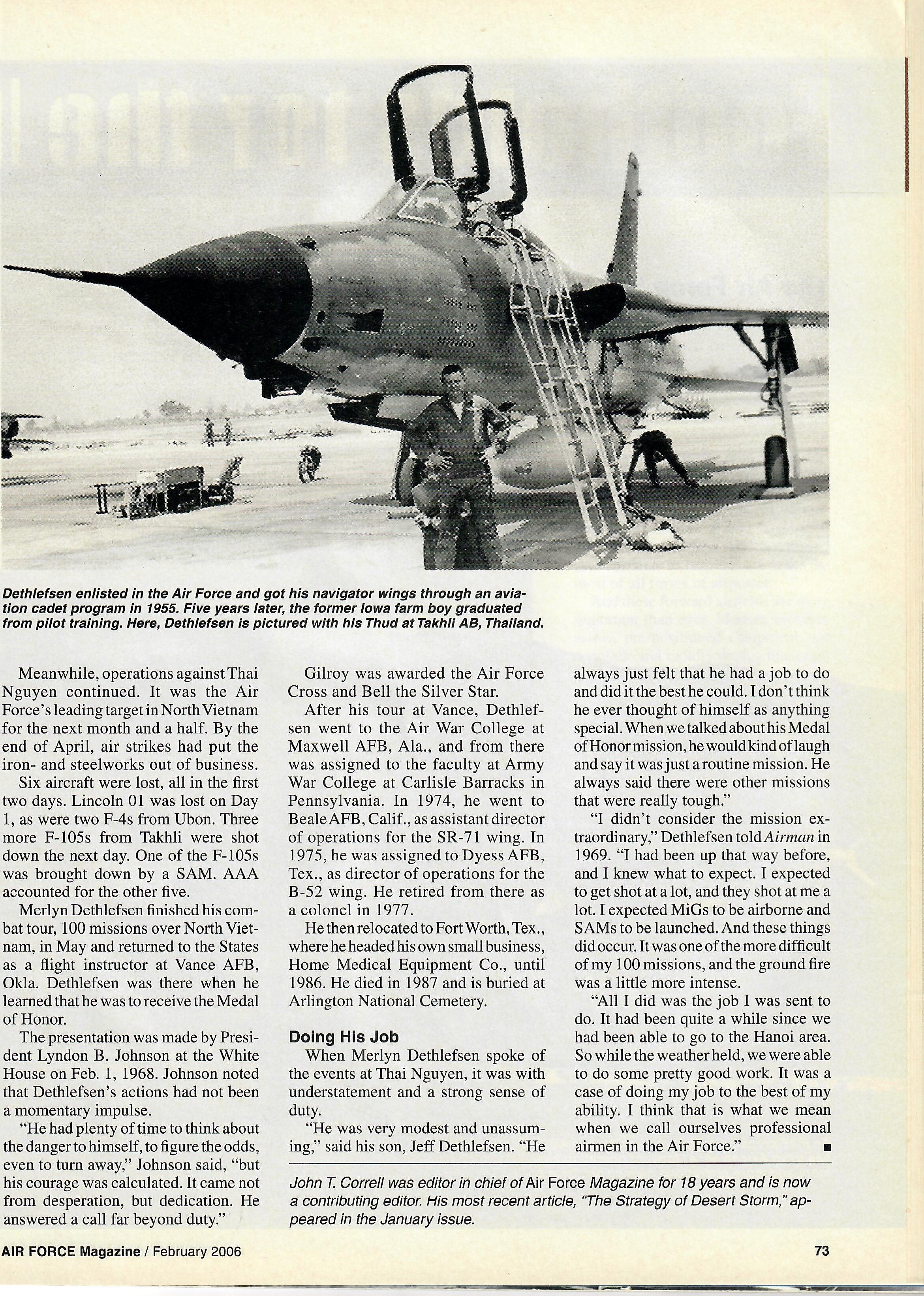 All I did was the job I was sent to do," Dethlefsen later said. "It had been quite a while since we had been able to go into the Hanoi area, so while the weather held, we were able to do some pretty good work."