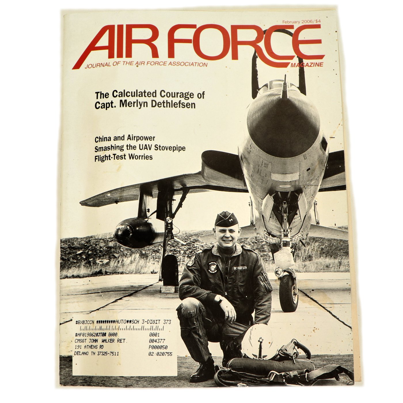 Also included is a copy of Air Force Magazine with a feature article and photos of Colonel Merlyn Dethlefsen, a Texas DMV letter confirming this plate was owned by him, and a copy of a photo of him in uniform.