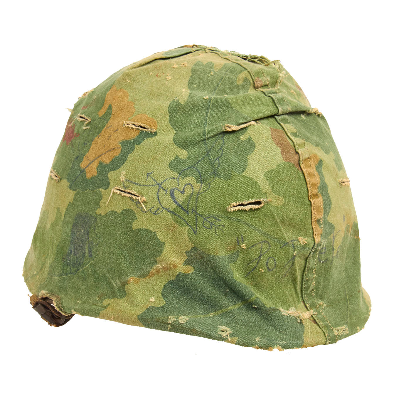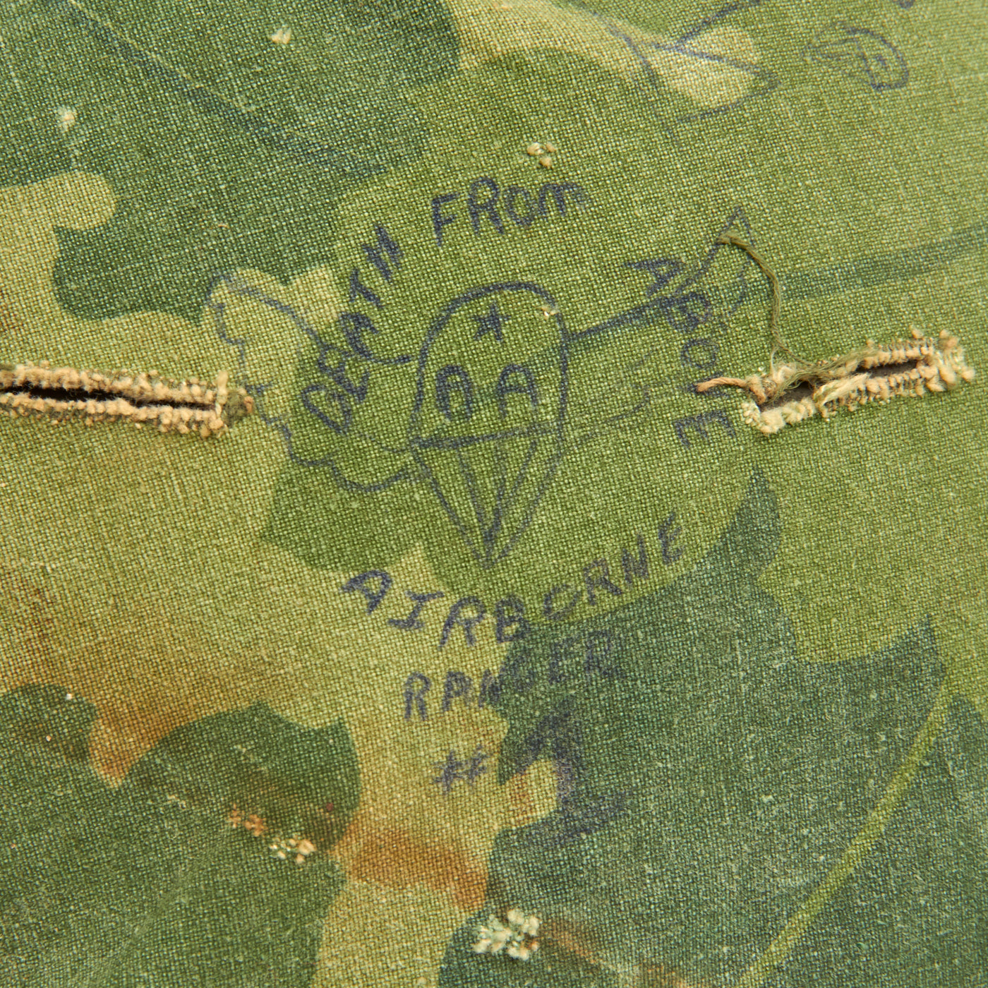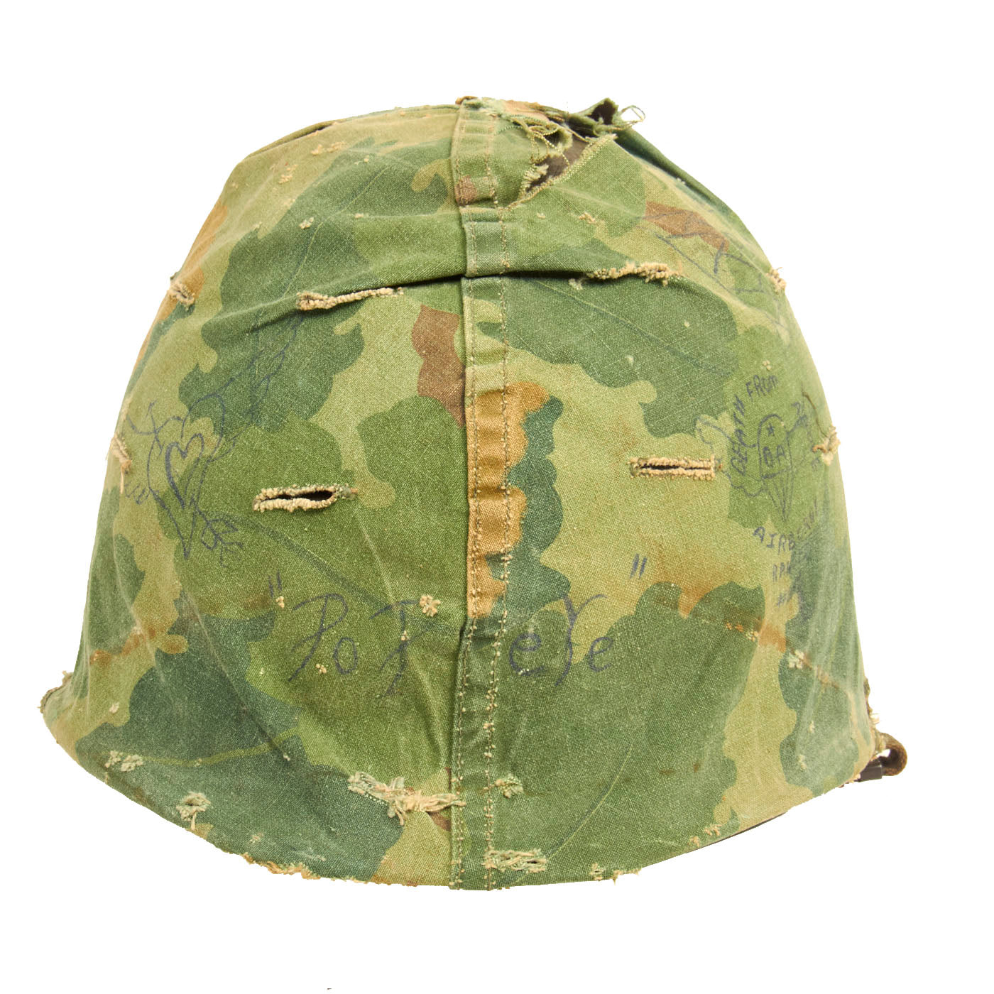 Looking closely however reveals that the cover itself was personalized by the owner with numerous slogans and drawings. The front of the helmet has written the original owner’s nickname “Popeye”. Each side of the helmet has drawn a rendition of the Zig-Zag Cigarette Rolling Paper Man (aka “Zig-Zag Man”). The left front of the cover has a winged heart with an arrow piercing through. Above that is a rendition of mountains with a moon rising over them. Opposite of this drawing on the other side, is a drawing of the same mountain range, only this time with an aircraft flying overhead with multiple parachutes descending below. Below this is a winged parachute, which encompassing the parachute is written “Death From Above/Airborne/Ranger”. The writing is quite faded, so it was not added any time recently. And is most certainly period. The writing goes not exhibit signs of laundering or artificial contrived aging, which is a solid way to tell the markings are quite old.