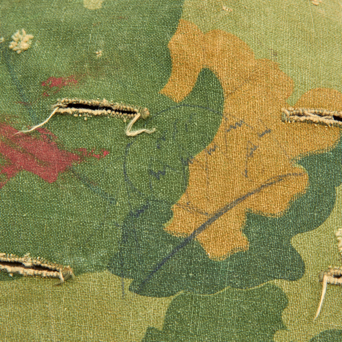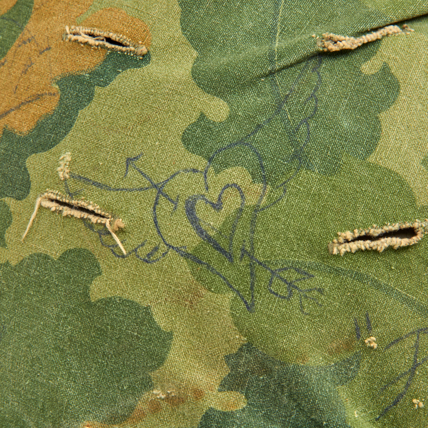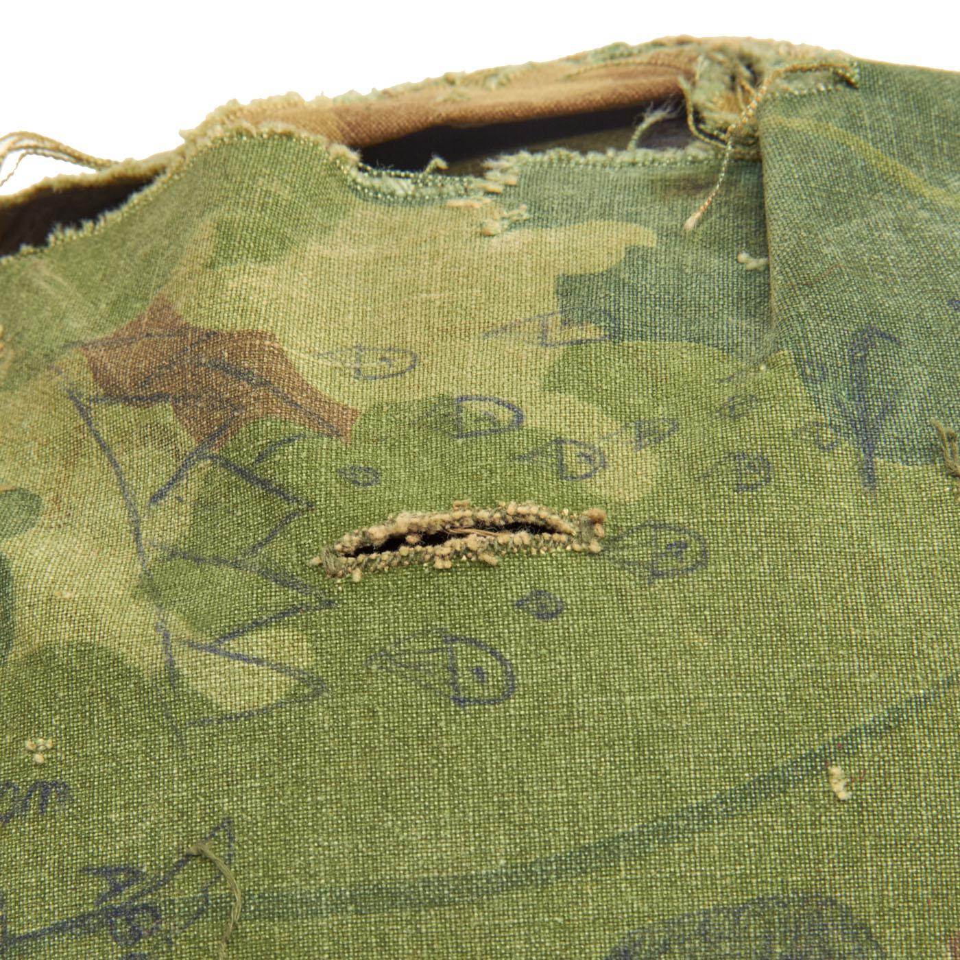 Looking closely however reveals that the cover itself was personalized by the owner with numerous slogans and drawings. The front of the helmet has written the original owner’s nickname “Popeye”. Each side of the helmet has drawn a rendition of the Zig-Zag Cigarette Rolling Paper Man (aka “Zig-Zag Man”). The left front of the cover has a winged heart with an arrow piercing through. Above that is a rendition of mountains with a moon rising over them. Opposite of this drawing on the other side, is a drawing of the same mountain range, only this time with an aircraft flying overhead with multiple parachutes descending below. Below this is a winged parachute, which encompassing the parachute is written “Death From Above/Airborne/Ranger”. The writing is quite faded, so it was not added any time recently. And is most certainly period. The writing goes not exhibit signs of laundering or artificial contrived aging, which is a solid way to tell the markings are quite old.