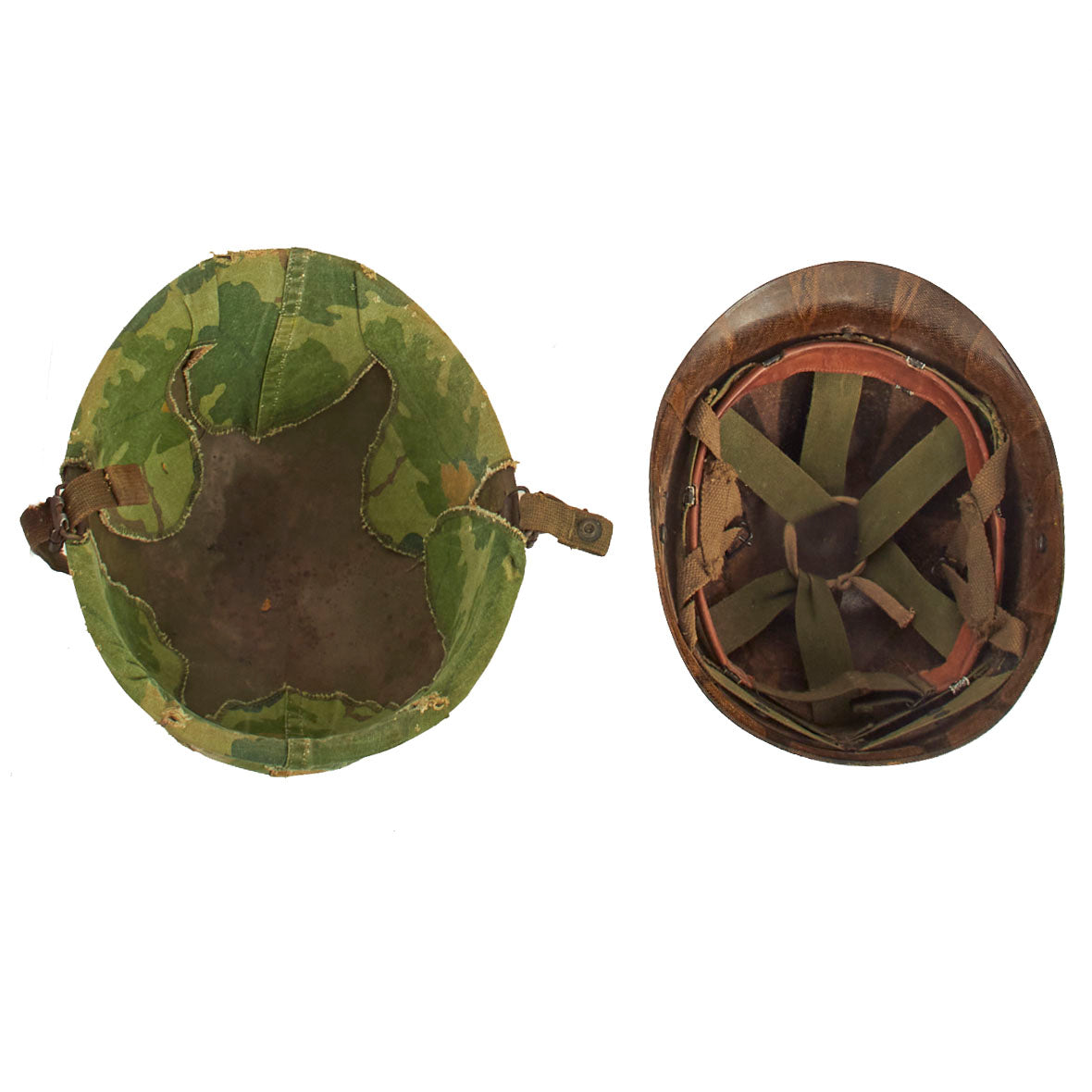 Original Item: Only One Available. An outstanding example of an original, untouched condition, Vietnam War Airborne M-1C Paratrooper’s Helmet with Mitchell Pattern Reversible Camouflage Cover featuring original period graffiti and artwork!