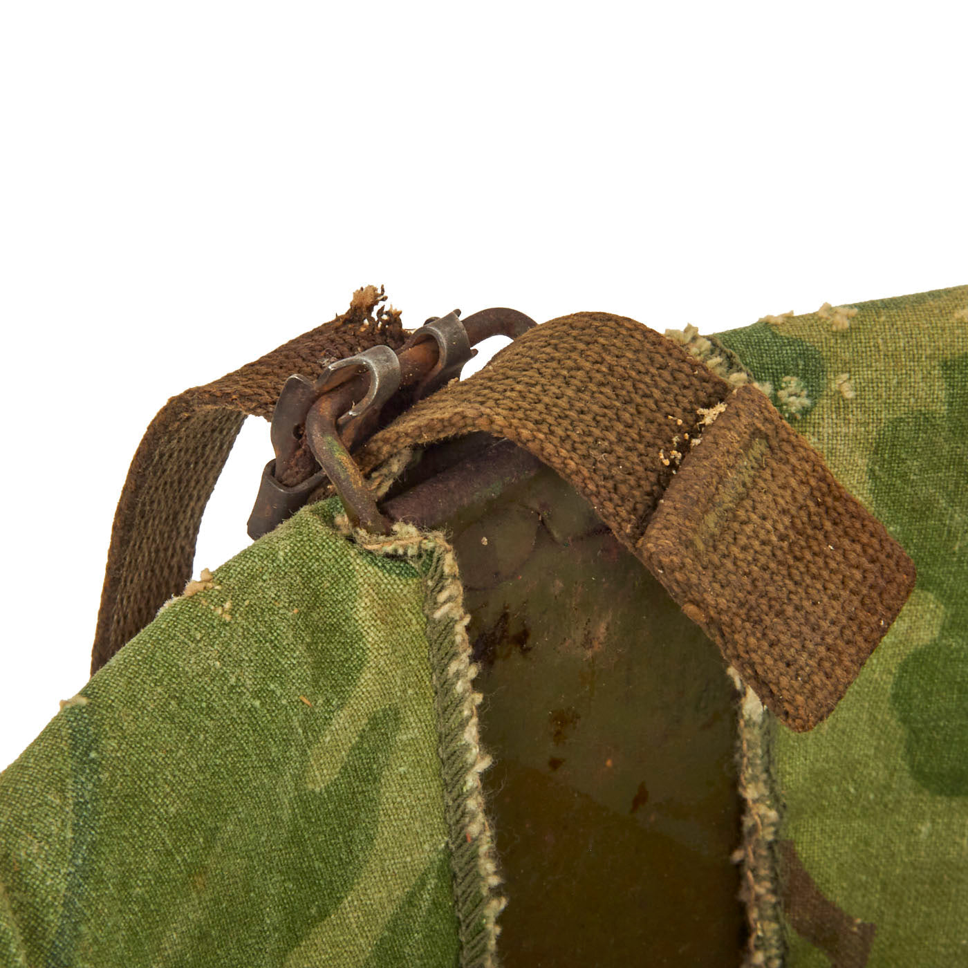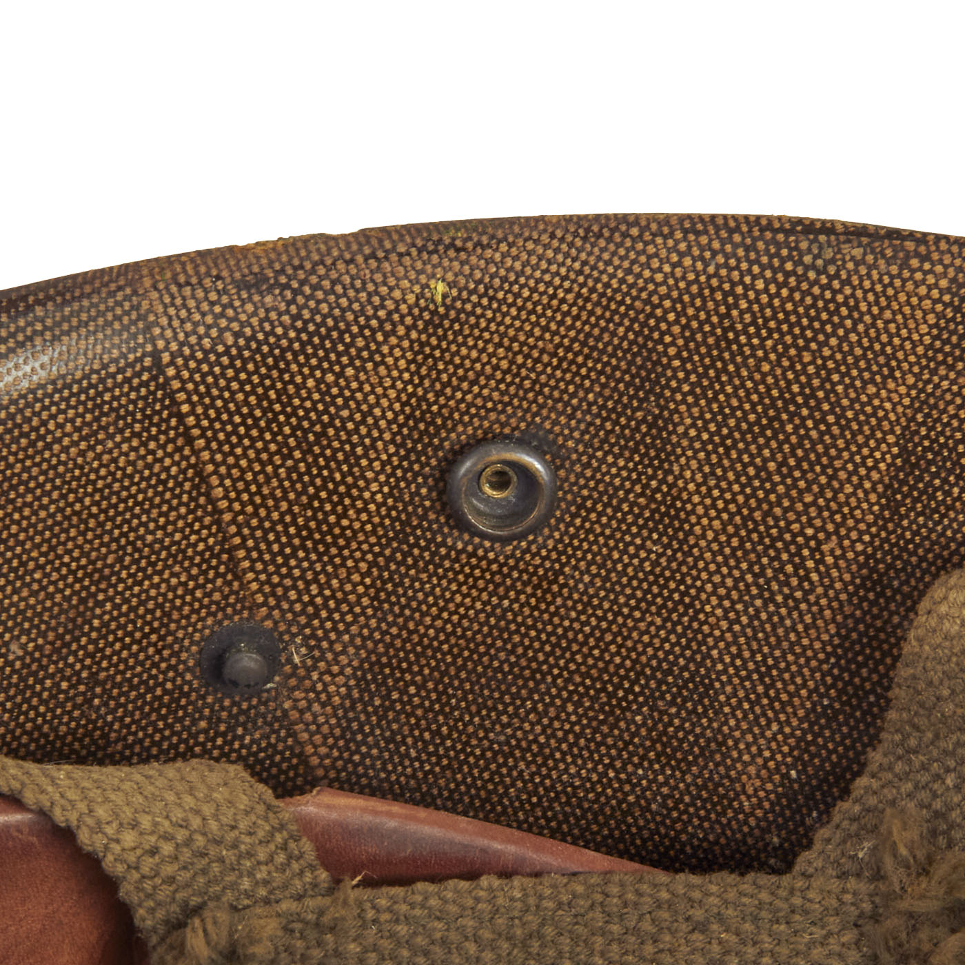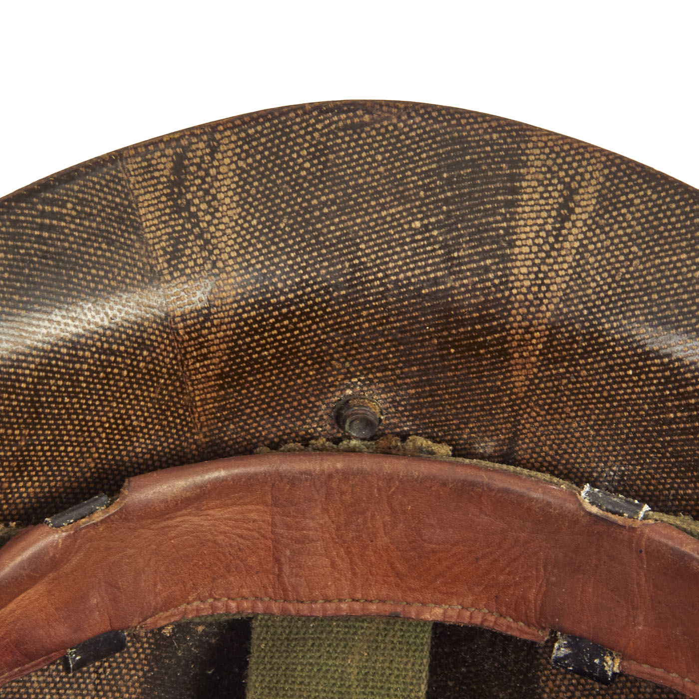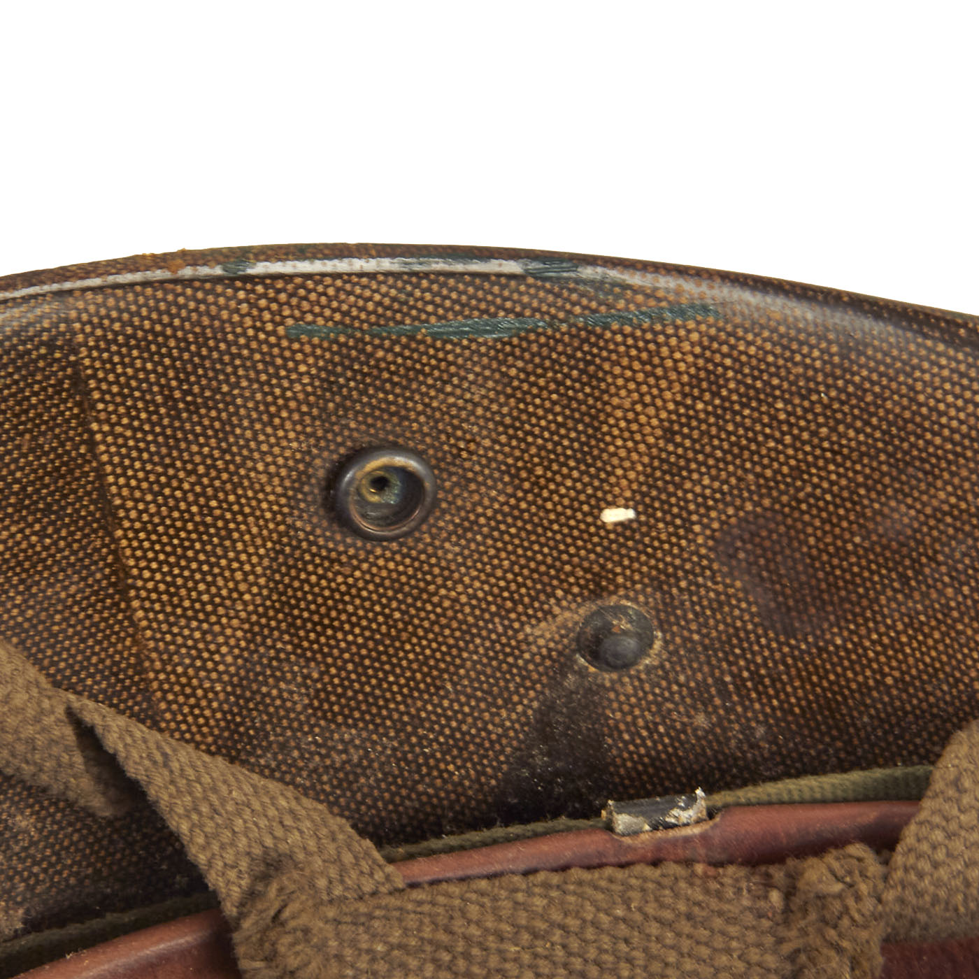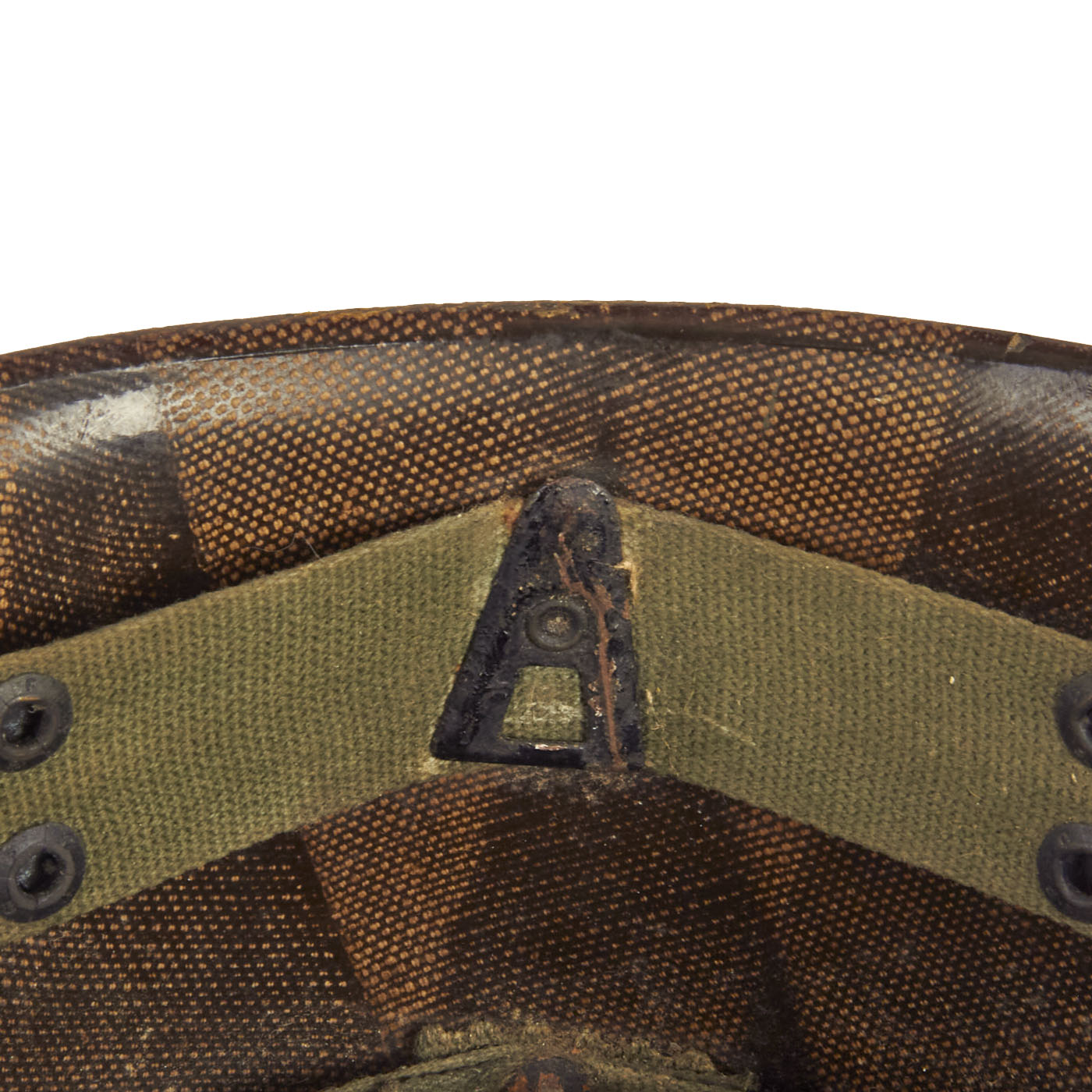 The liner is correct high pressure late 1950s (aka “P-1958”) liner which has the webbing configured in the same fashion as the WWII type liners. The sweatband is in good condition, and the rear is marked with the correct Vietnam Era stock numbers. The airborne A-Yokes for the chincup is intact, although the chincup itself is missing (which was routinely removed, as the chincups were rarely worn outside of combat jumps (which rarely occurred in Vietnam). The exterior of the helmet has been repainted with a bright green colored paint, which is undoubtedly period.