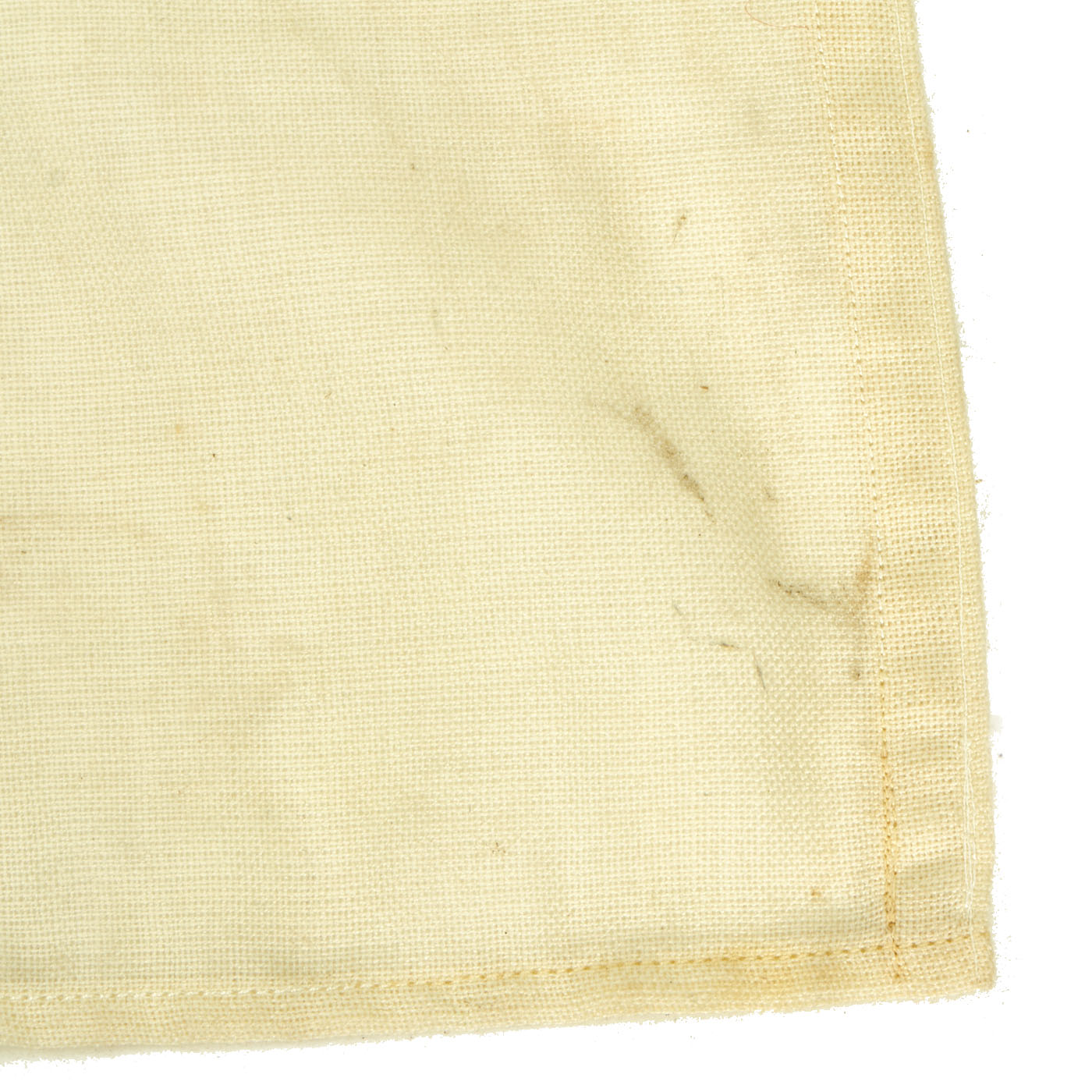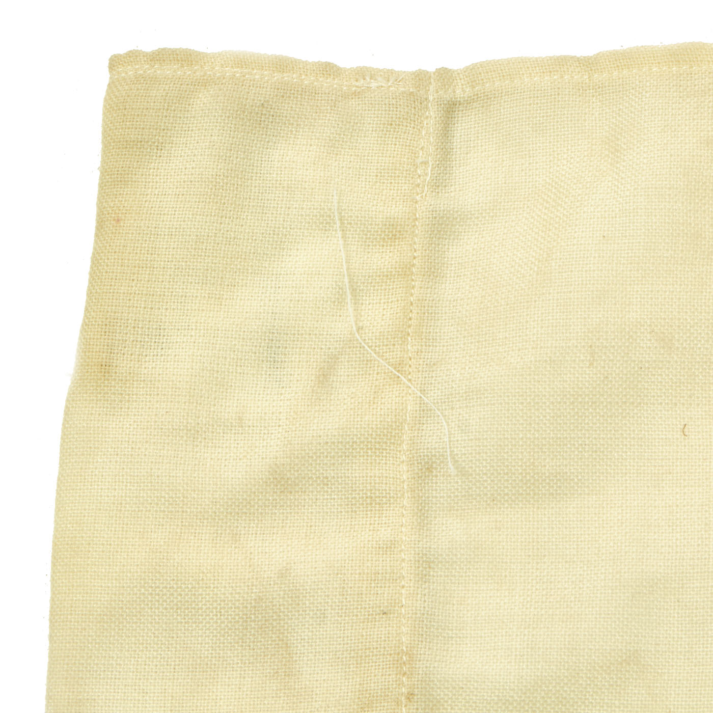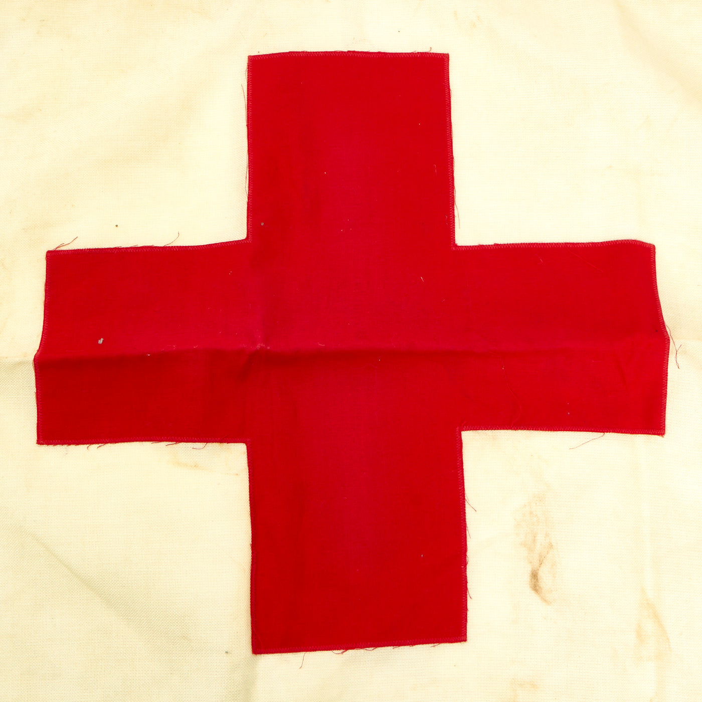 This American Red Cross flag measures 27” x 18” and is in near unissued condition. There is minor age toning present on the white field, but no staining. Inside the pocket on the hoist side still retains the leather securing tabs as well as manufacturer information: