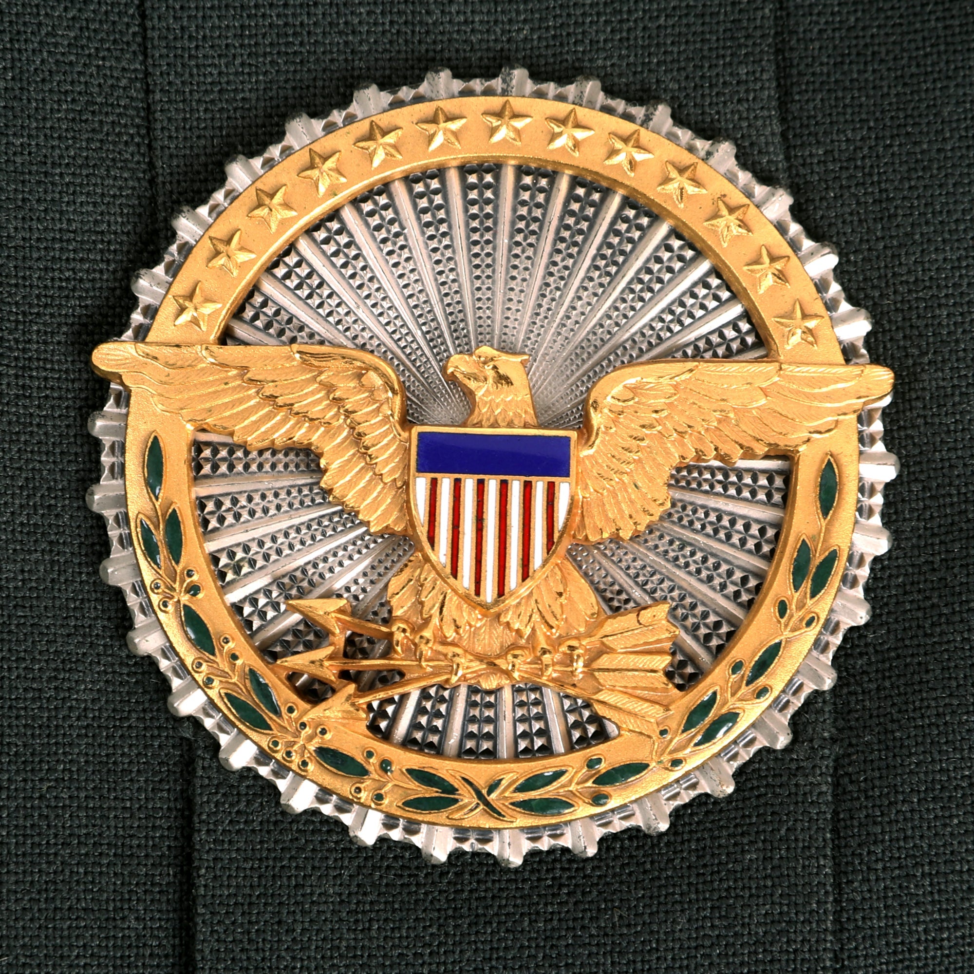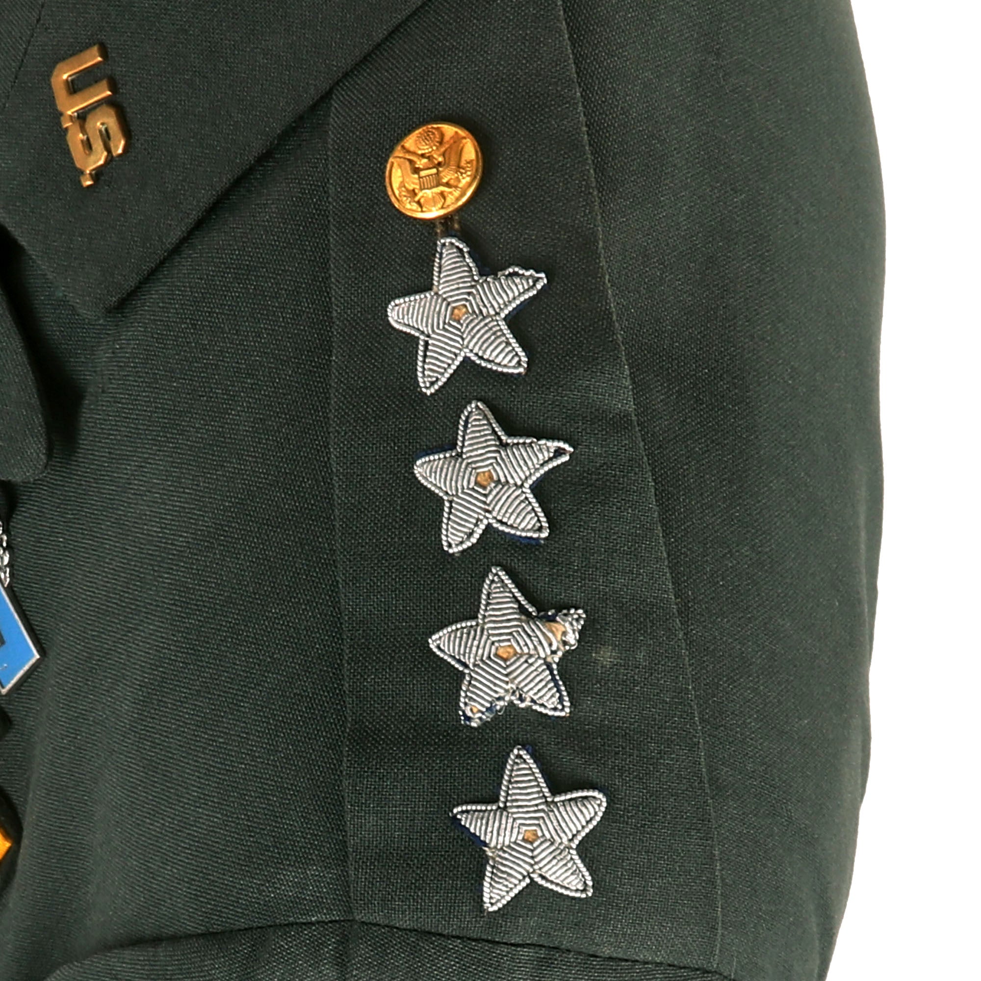 The jacket boasts several unique features that set it apart from other military jackets. The bullion embroidered General stars on the epaulets are particularly noteworthy, as they indicate the highest rank possible in the US Army and are just beautiful. A medal ribbon bar is also present on the jacket, which would have been used to display the General's various military honors and awards, which all appear to be correct and present.