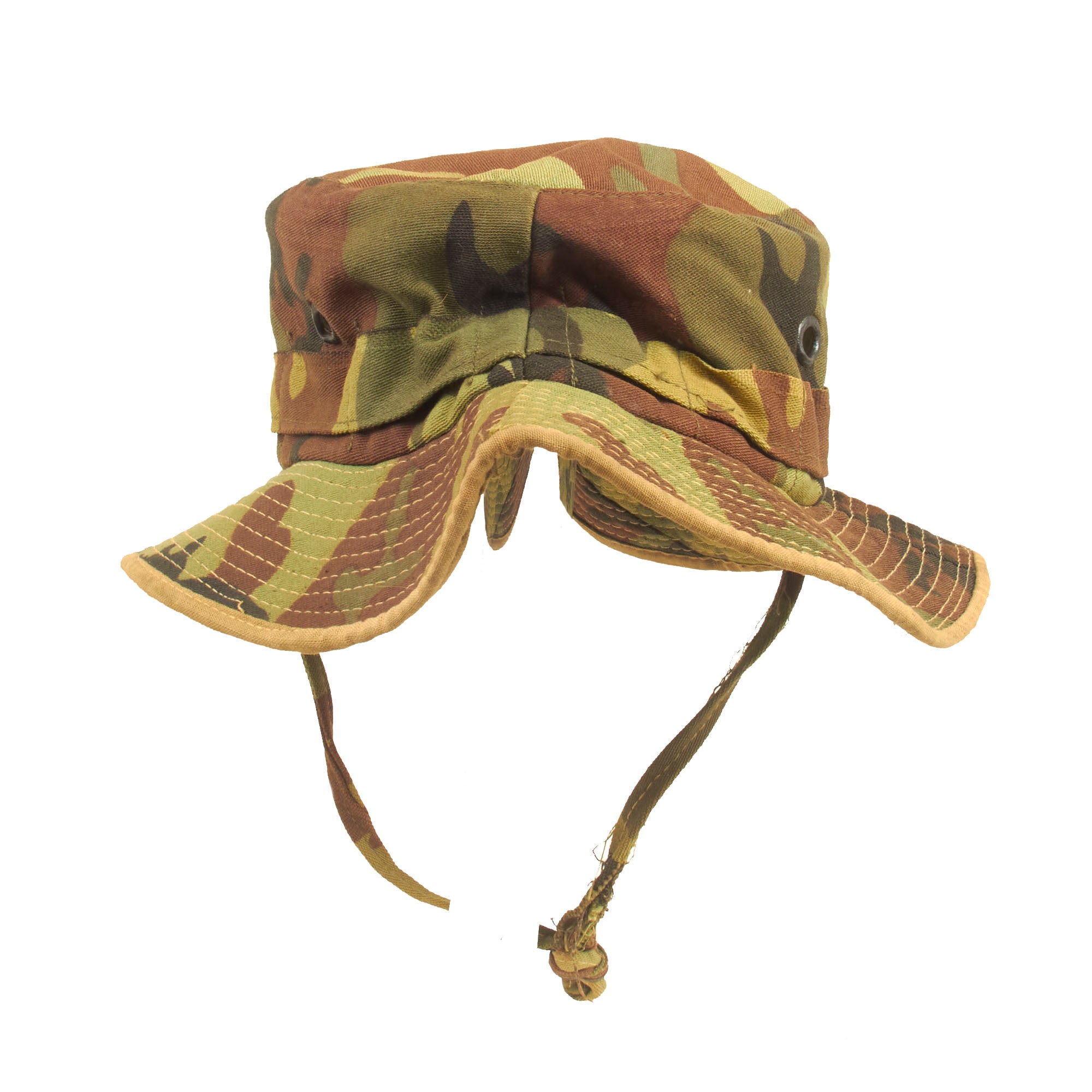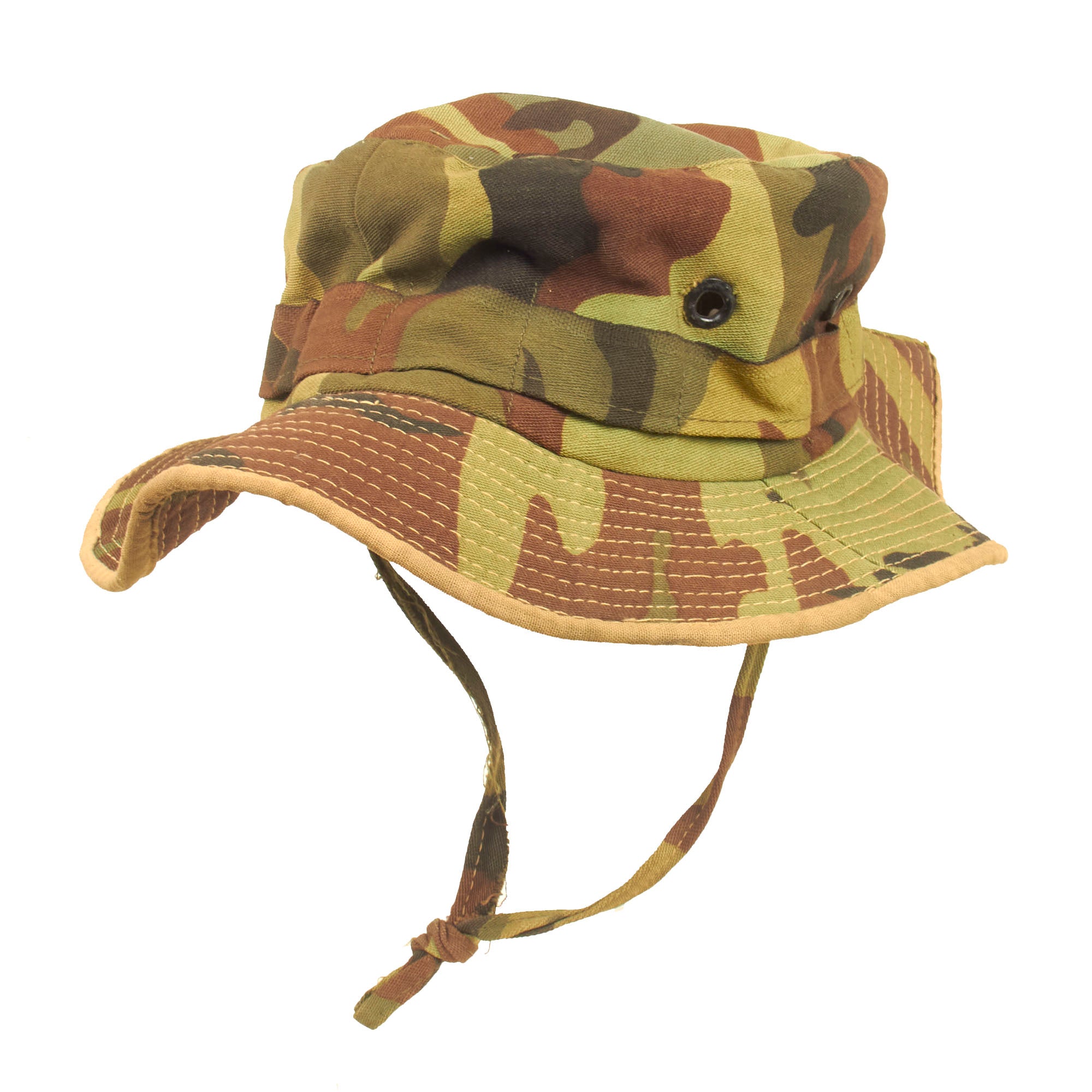 Original Item: Only One Available. This is a very nice example of an ARVN camouflage boonie which is an “in country” Vietnamese made example. These were popular with U.S. and Army Republic of Vietnam (ARVN) Forces all throughout the war. As the United States Military did not issue the now popular “Boonie Hat” until approximately 1967, many U.S. personnel acquired their own through local indigenous Vietnamese Tailor shops, street vendors, etc. The practice of buying Vietnamese-Made items privately for use by U.S. personnel continued to the end of U.S. Involvement in Vietnam.