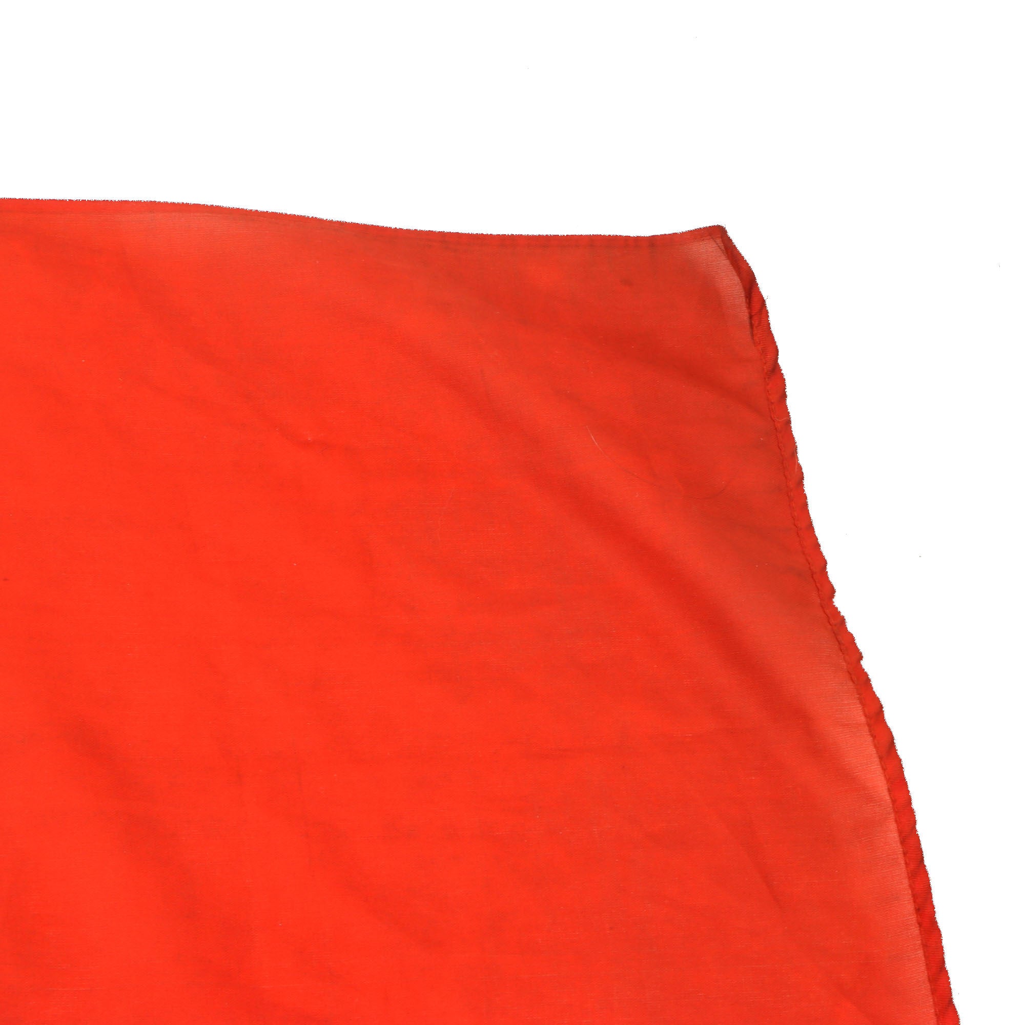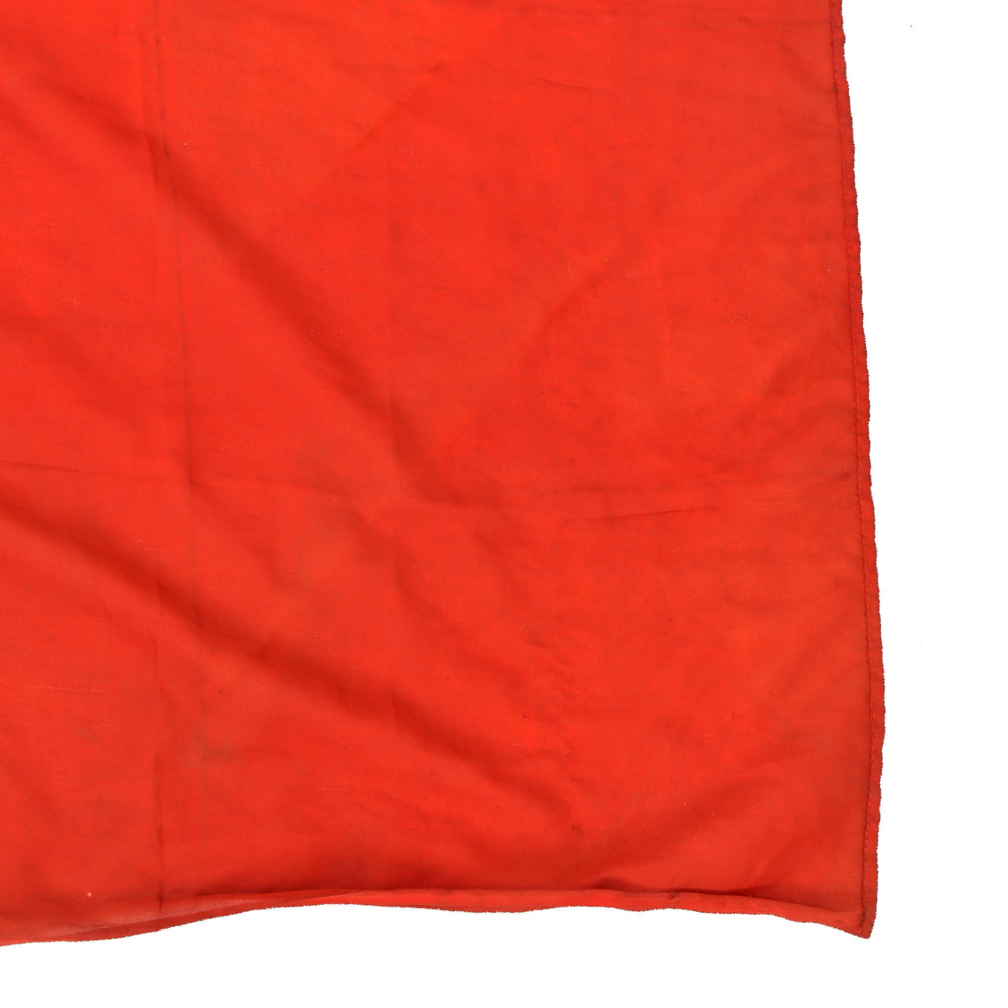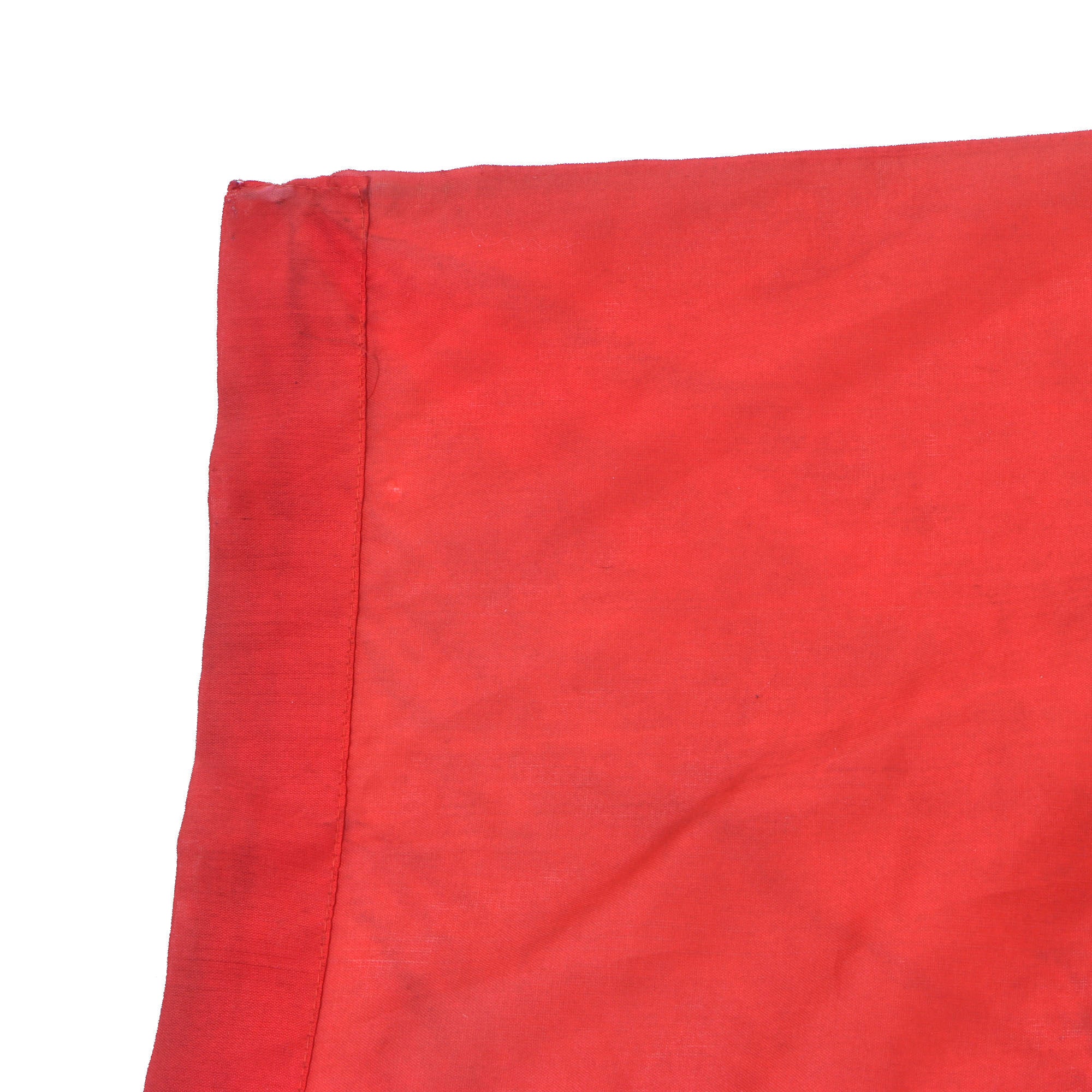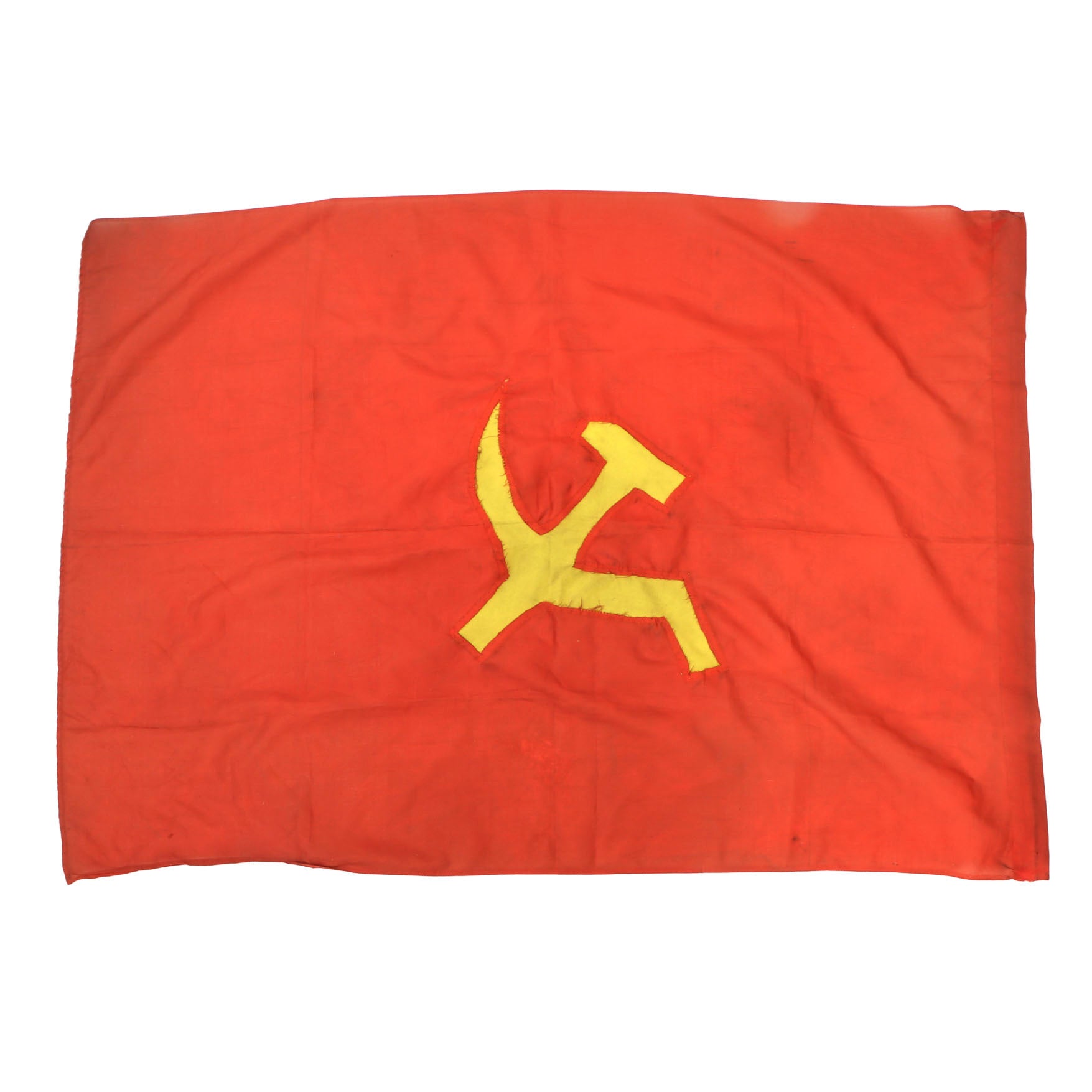 The flag is very similar in design to the flag of the Soviet Union. An all red field with a large yellow hammer and sickle in the center of the flag. This example has a header for attachment to a pole. The material is very soft and similar to rayon, but the way the hammer & sickle is applied is very similar to how the star is applied on North Vietnamese flags, so this example is certainly East-Asian made, and almost certainly Vietnamese.