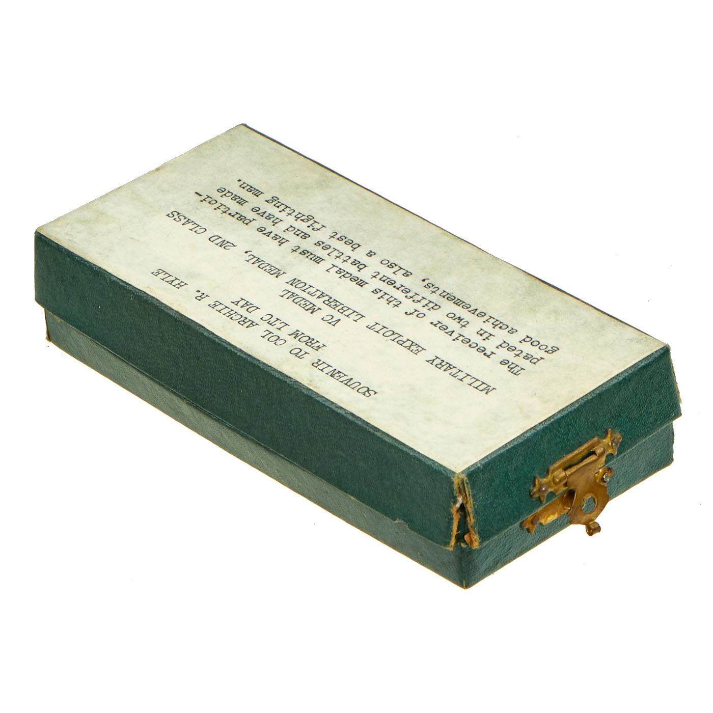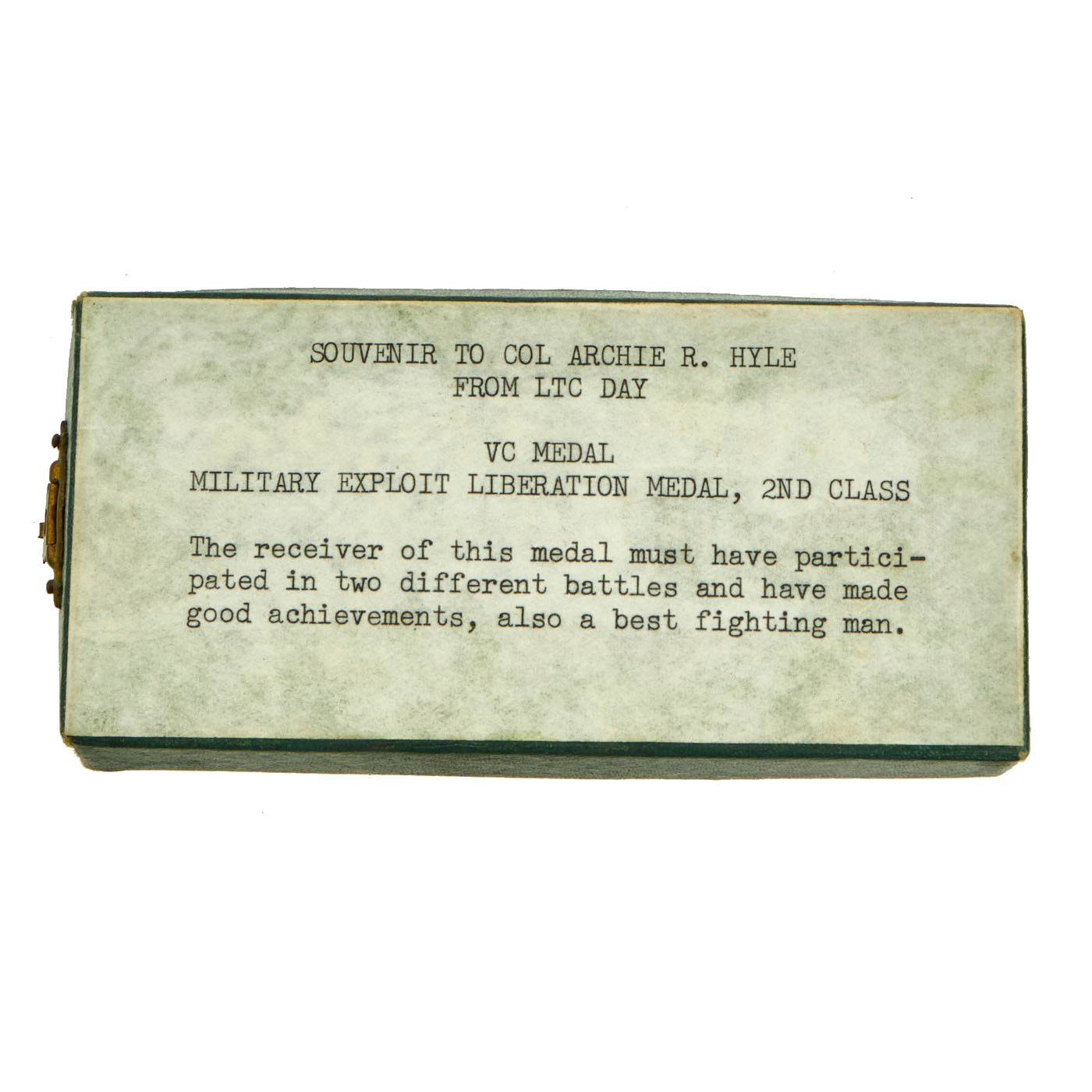 Original Item: Only One Available. This is a very lovely boxed set for the Vietcong Liberation Exploit Medal. The medal was captured by Lieutenant Day, who we believe to be George Everette "Bud" Day who was a United States Air Force officer, aviator, and veteran of World War II, Korean War and Vietnam War. He was also a prisoner of war with John McCain, and recipient of the Medal of Honor and Air Force Cross. As of 2016, he is the only person to be awarded both the Medal of Honor and Air Force Cross. He was posthumously advanced to the rank of brigadier general effective March 27, 2018, as directed by the 2017 National Defense Authorization Act.