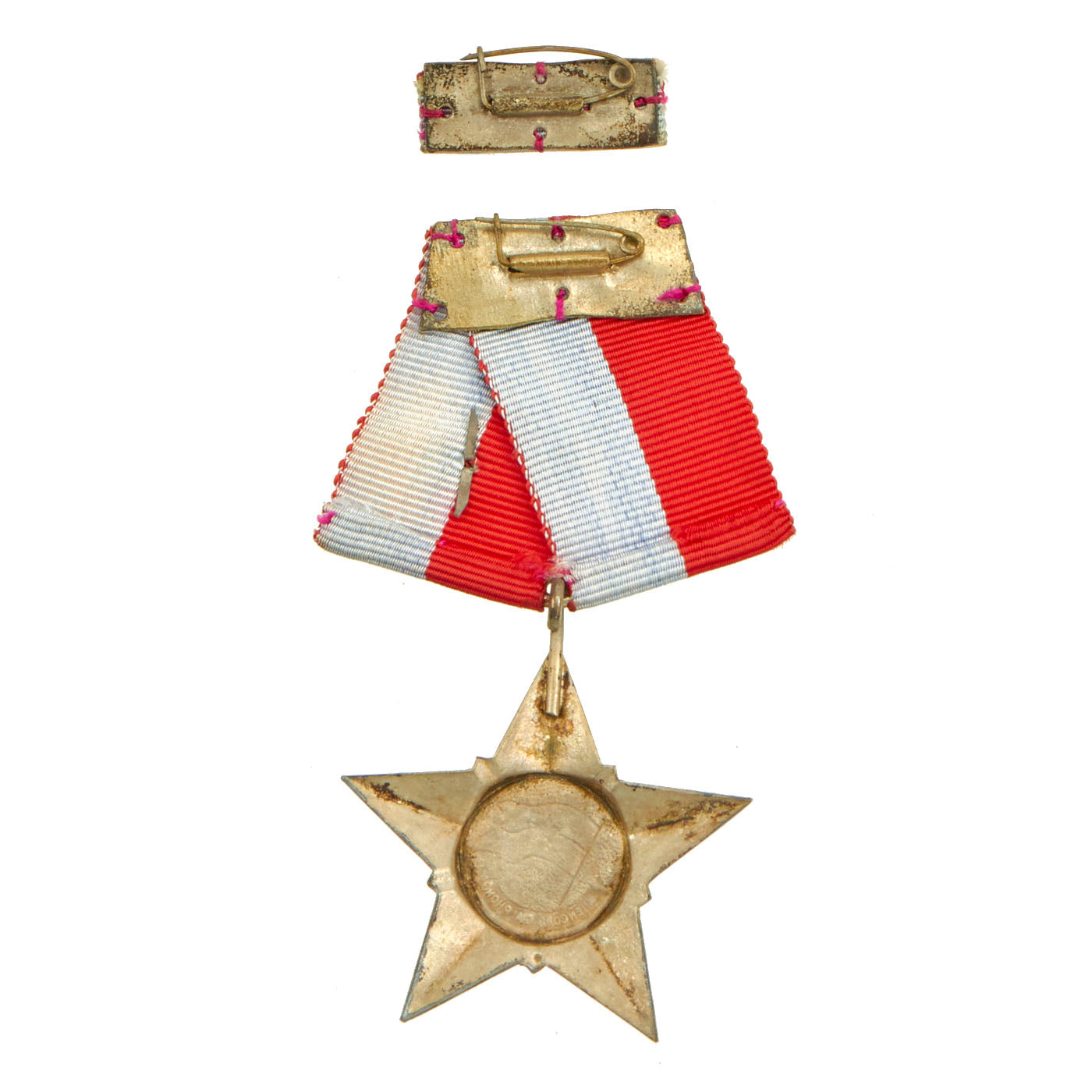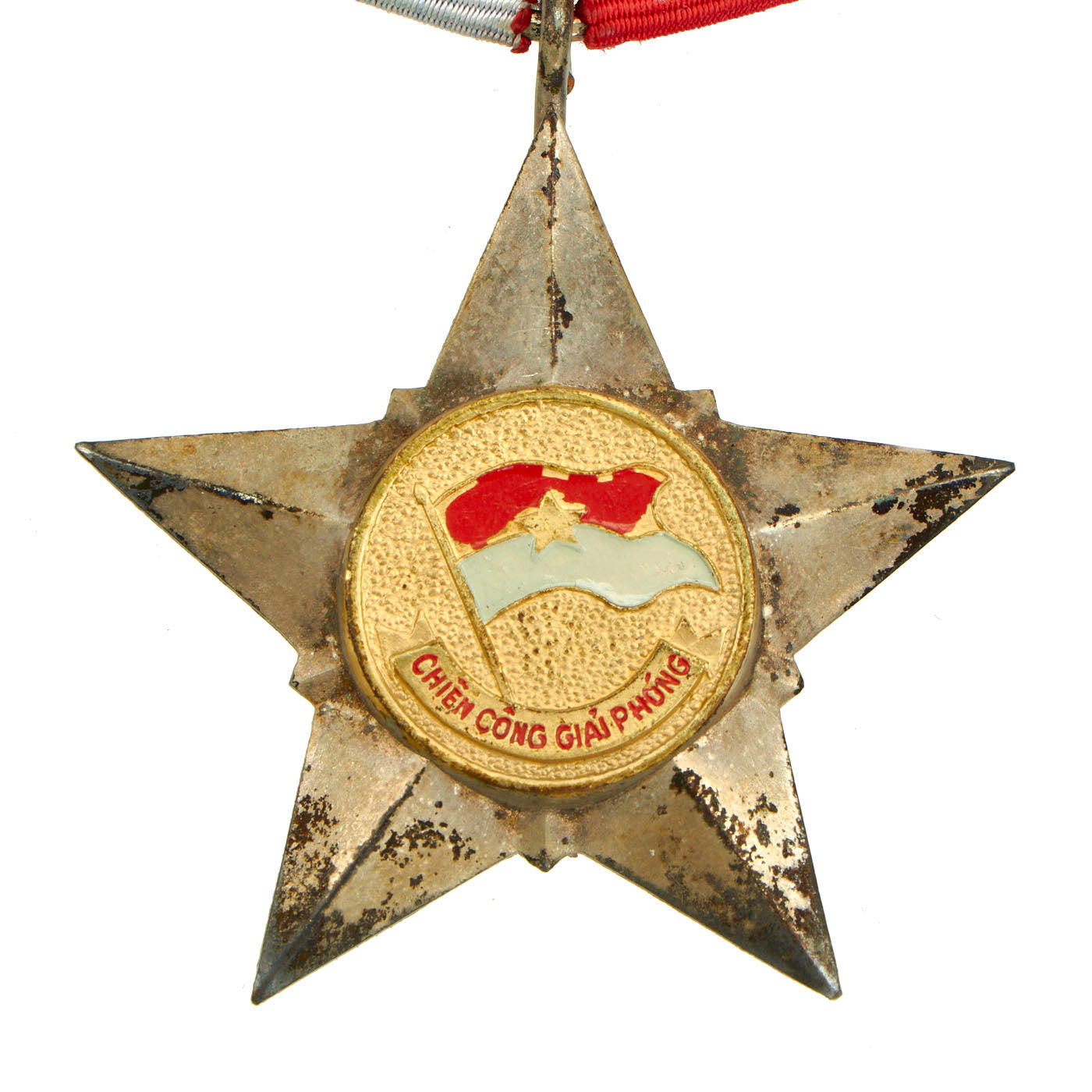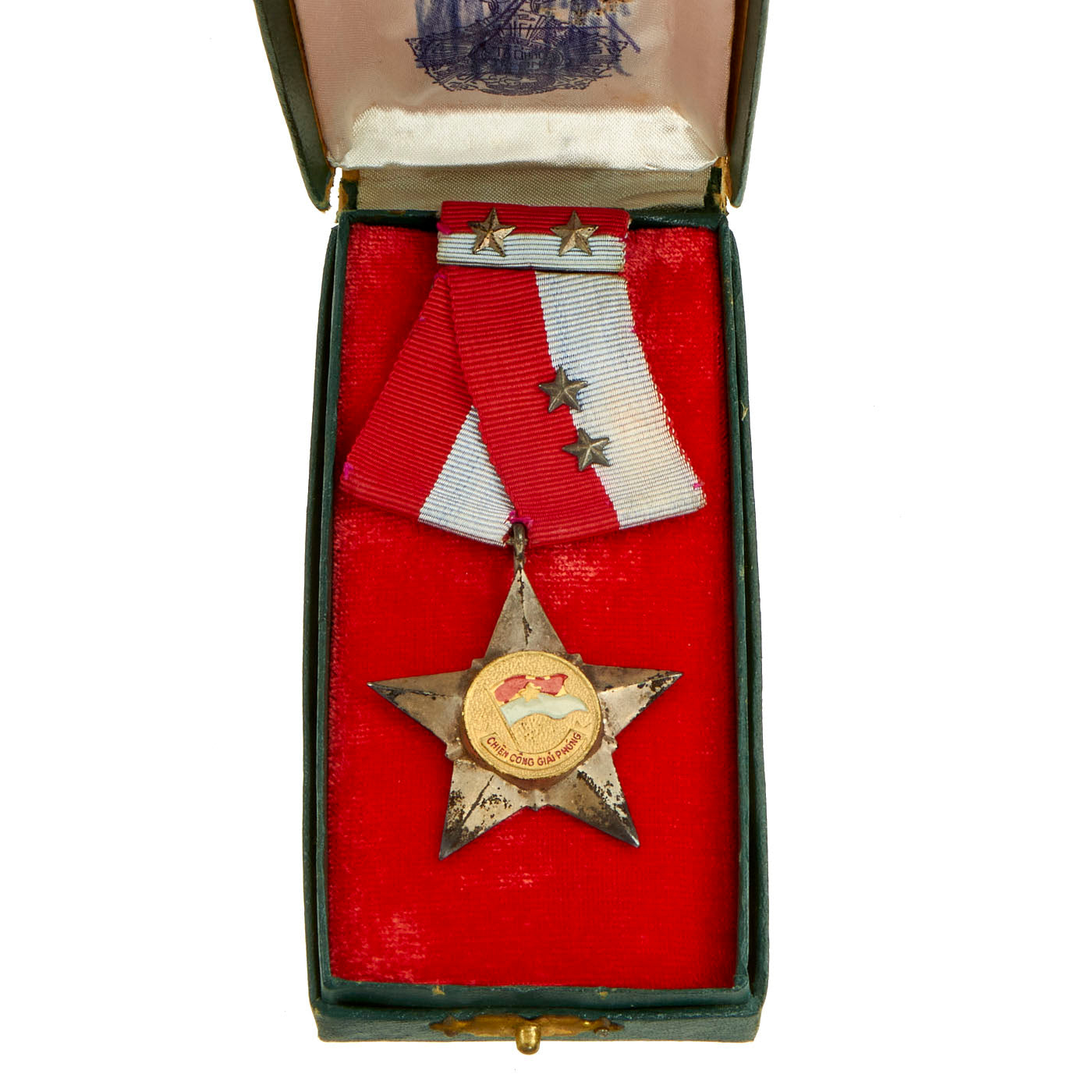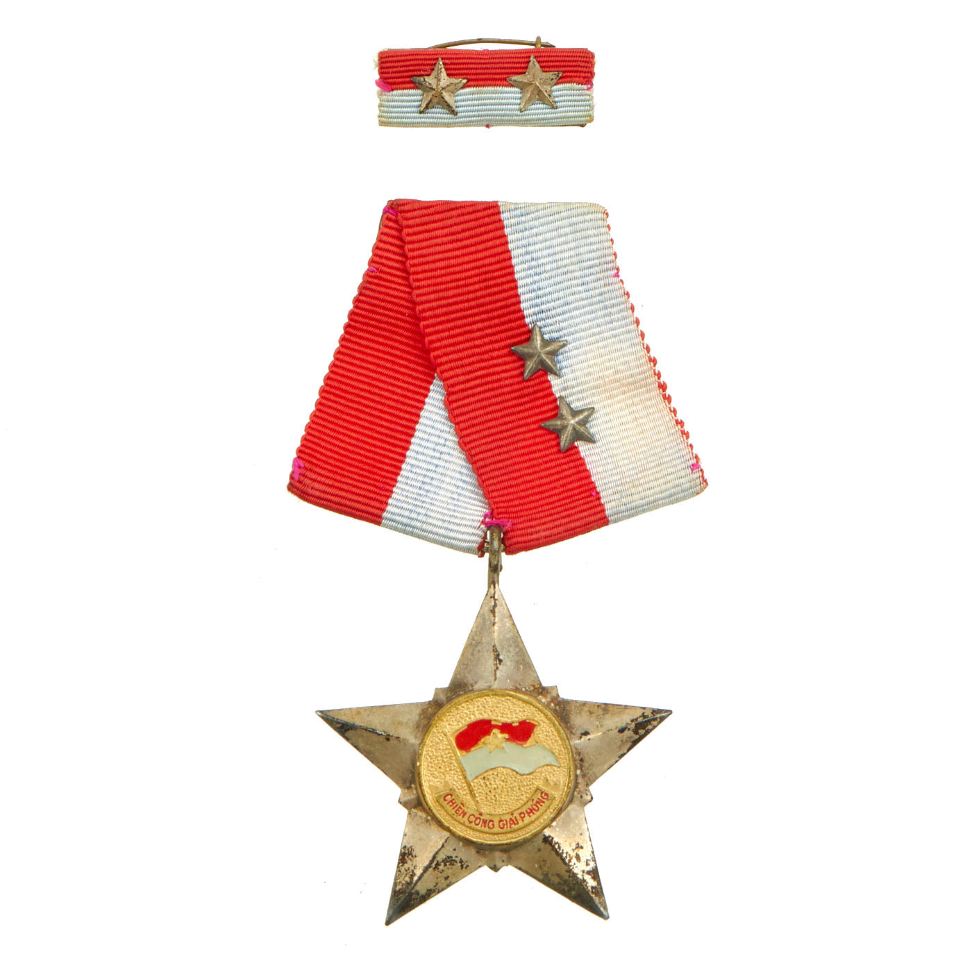 The medal itself is a Liberation Order Badge which bears 2 stars with a matching separate ribbon, in a green cardboard box with red velvet padding. The Liberation Order Badge is a military badge given by North Vietnam during the Vietnam War originally instituted on August 9, 1965 and awarded t0 groups and individuals for outstanding performance in combat, production, official-business and to families separated by the struggle in the South.