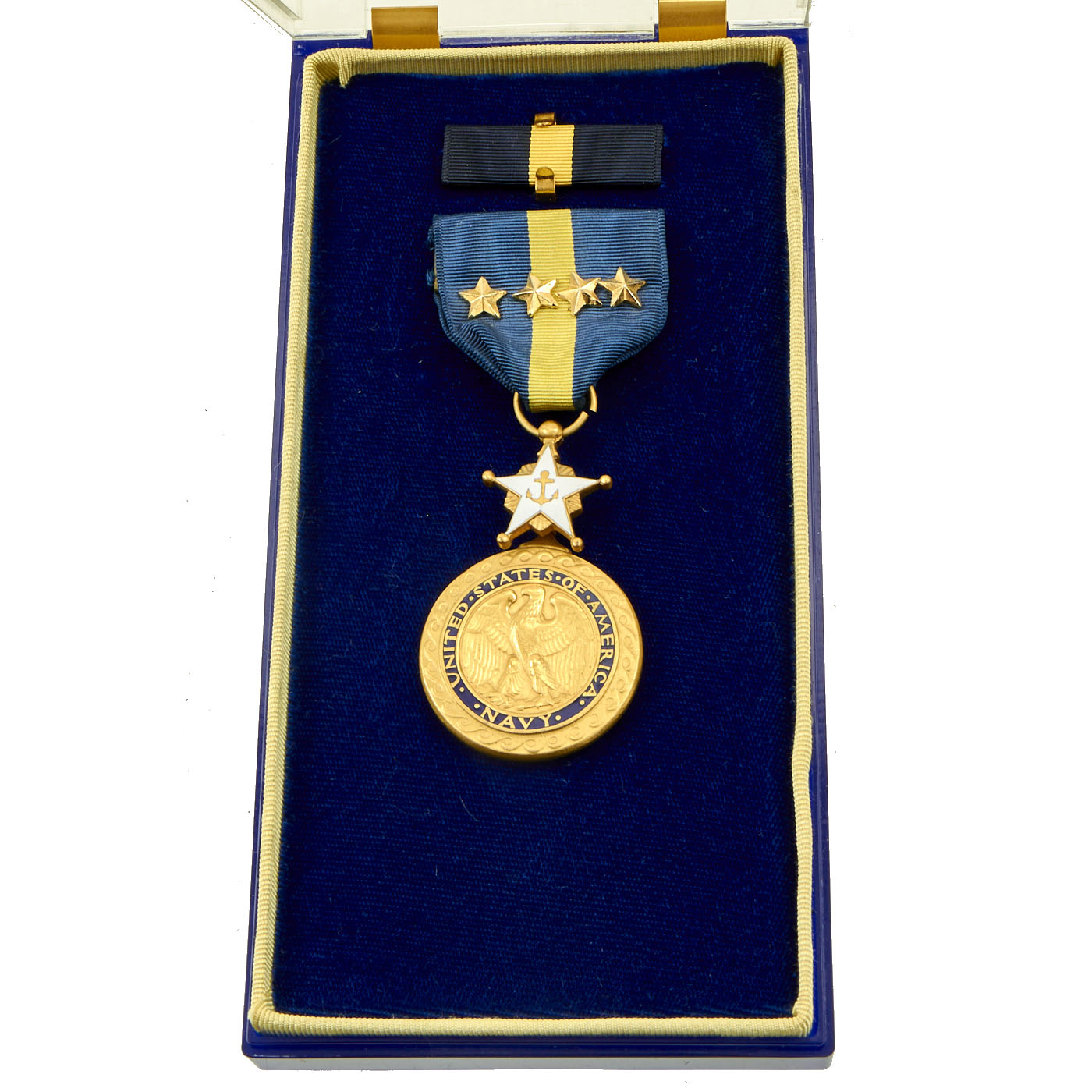 The medal's suspension and service ribbon is navy blue with a single central stripe of yellow. Additional awards of the Navy Distinguished Service Medal are denoted by gold and silver 5/16 inch stars worn on the medal's suspension and service ribbon.