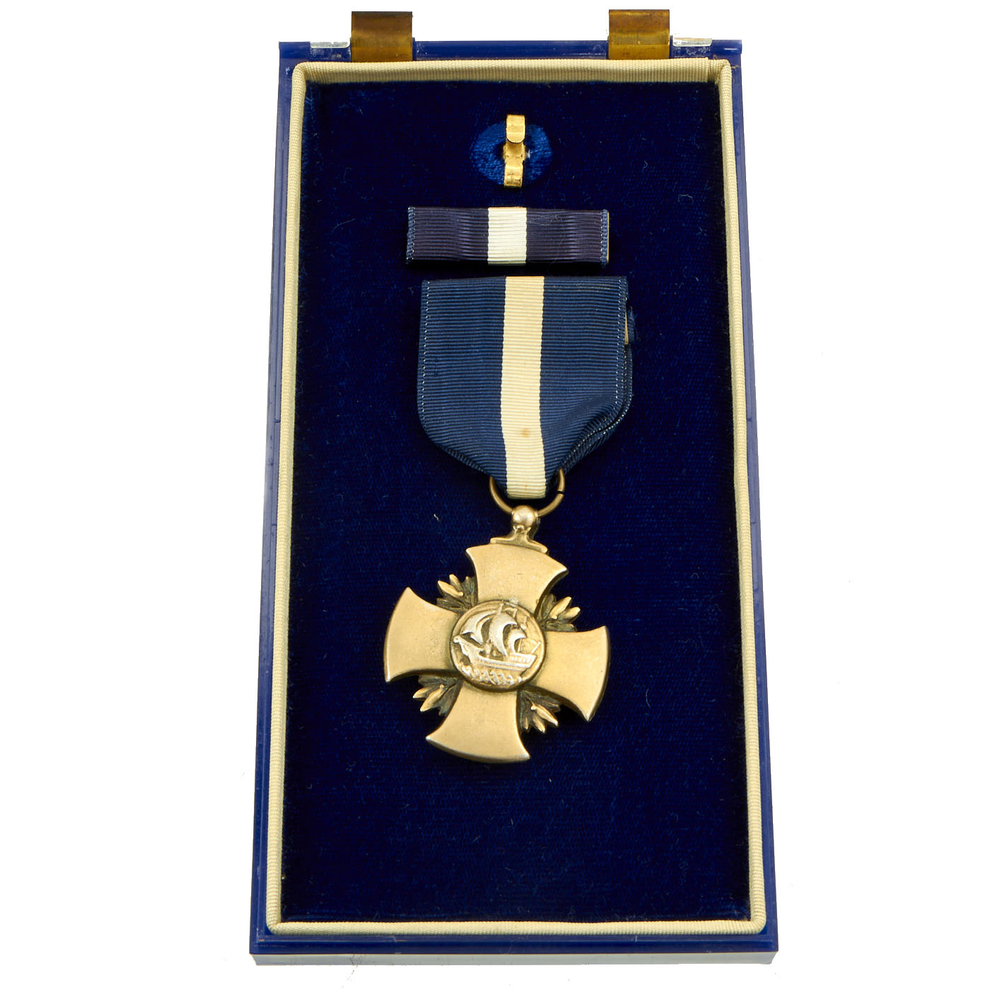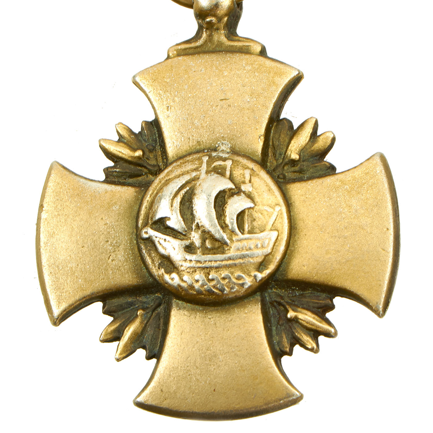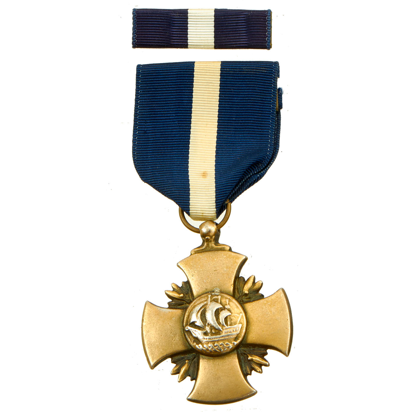 Obverse: The medal is a modified cross pattée one and a half inches wide. The ends of its arms are rounded whereas a conventional cross patée has arms that are straight on the end. There are four laurel leaves with berries in each of the re-entrant arms of the cross. In the center of the cross, a sailing vessel is depicted on waves, sailing to the viewer's left. The vessel is a symbolic caravel of the type used between 1480 and 1500. Fraser selected the caravel because it was a symbol often used by the Naval Academy and because it represented both naval service and the tradition of the sea. The laurel leaves with berries refer to achievement.