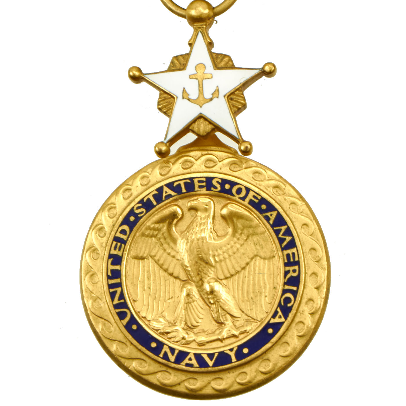 The Navy Distinguished Service Medal is a gilt bronze medallion 1.25 inches (32 mm) in diameter. The obverse of the medal depicts an American bald eagle in the center displaying its wings. The eagle holds an olive branch in its right talon and arrows in its left talons. The eagle is surrounded by a blue enameled ring with the words, • UNITED • STATES • OF • AMERICA • at the top and • NAVY • at the bottom. Surrounding the blue enamel ring is a gold border of scroll waves depicted moving in a clockwise direction. The medal is surmounted by a white five-pointed star, point up, the points of the star being tipped with gold balls. In the center of the star is a blue anchor, while gold rays radiate between the arms of the star.