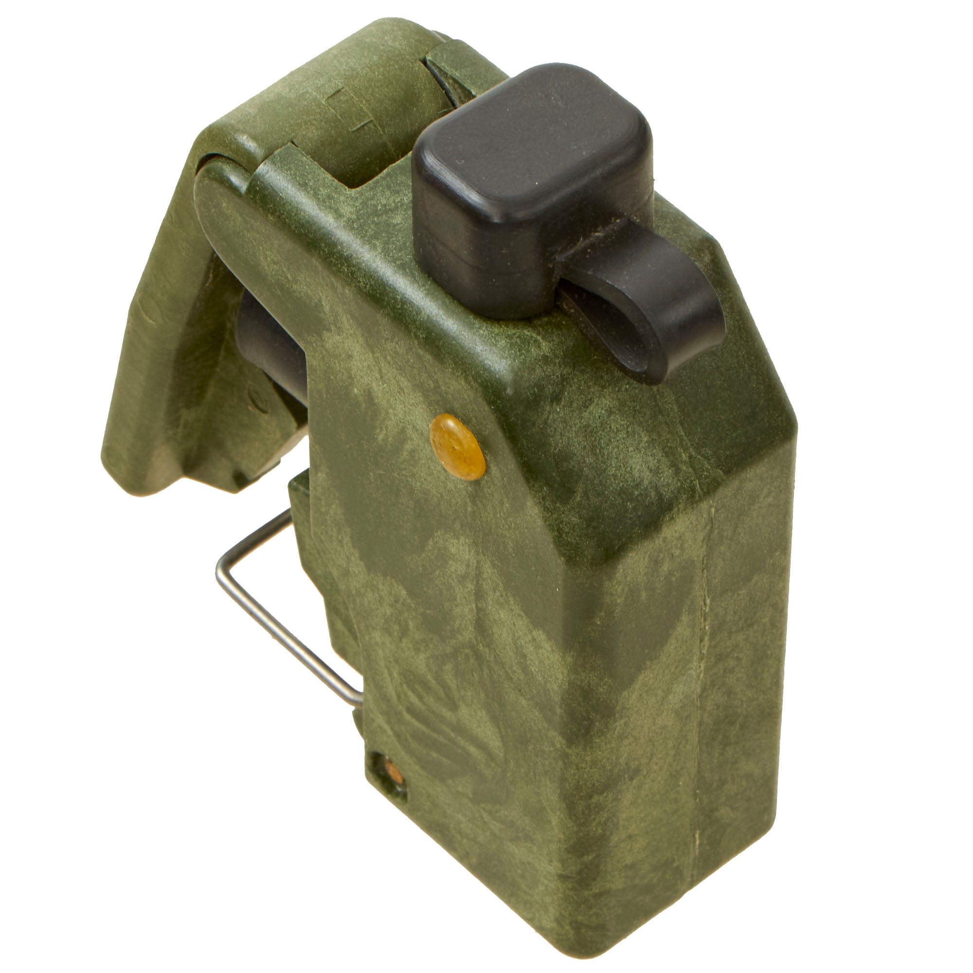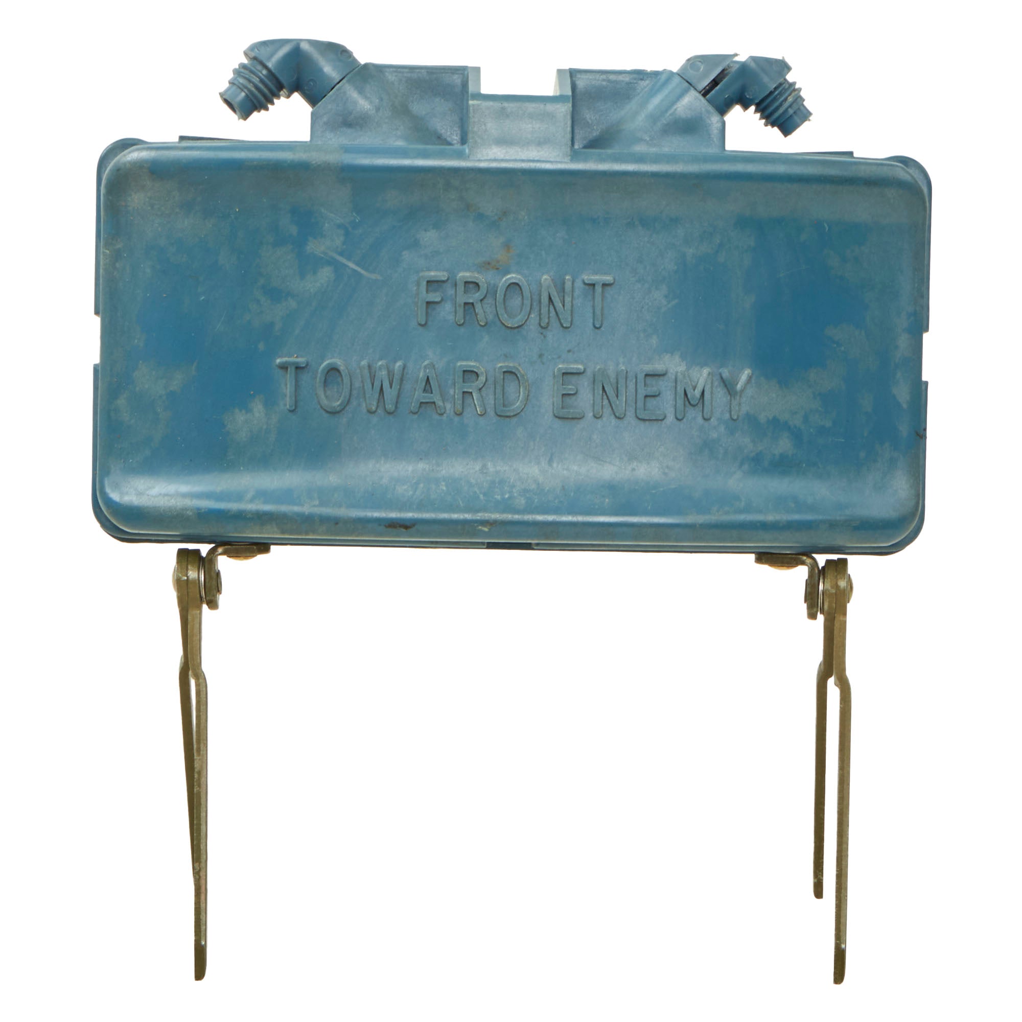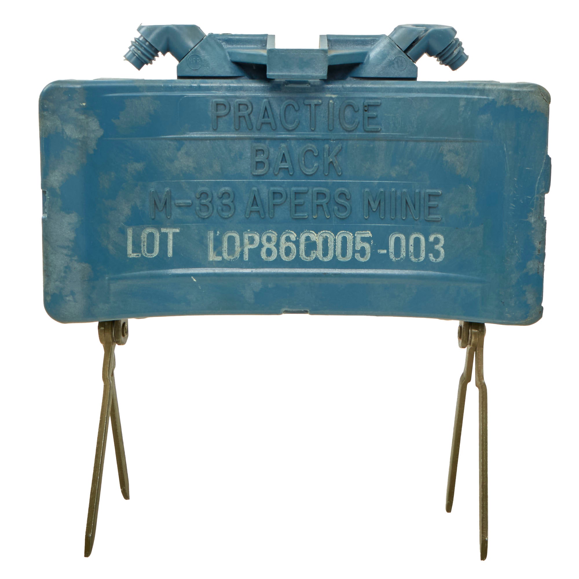 This example is very nice, and has the look of a well-used piece of equipment. The mine itself is cast in blue plastic, complete with internal shrapnel, some of which has broken loose. It was not later repainted OD Green for display, but it is definitely marked PRACTICE / BACK / M-33 APERS MINE on the back with LOT LOP86C005-003 below that. It still retains the original fold out support legs as well as the wire connectors. There are some cracks and chipping on the body of the inert mine most likely from being dropped.
