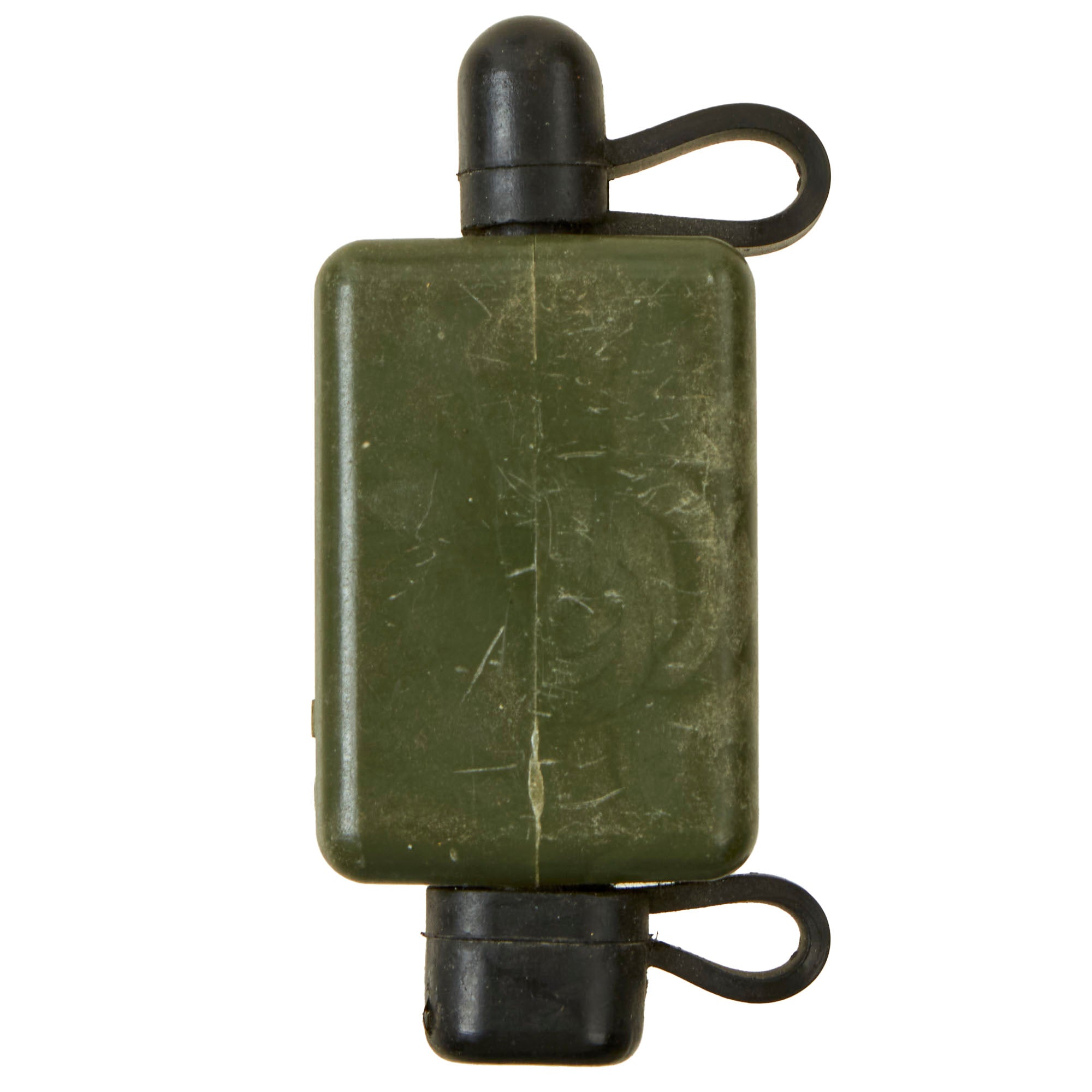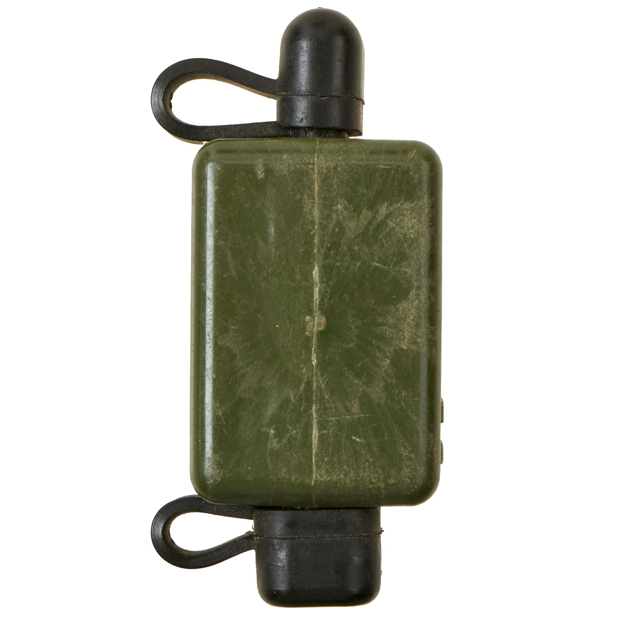 The M57 clacker appears to function, and when connected with the M10 wire and M40 test kit, the light on the test kit properly lights up, so we know that the wire is complete. The bag is in very good condition and the instructions under the flap are still retained! A rare sight to see. Overall a very nice complete condition set of a rare and essential Vietnam Era training set. Ready to display!