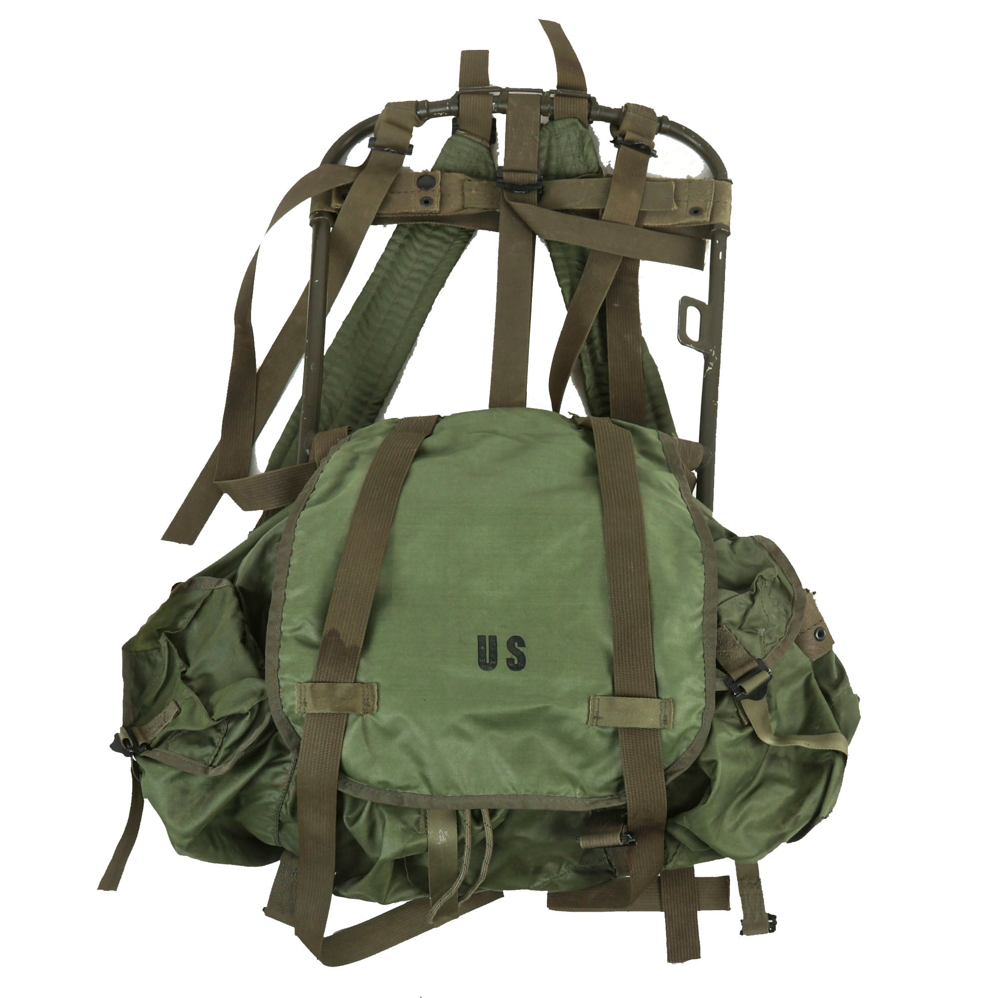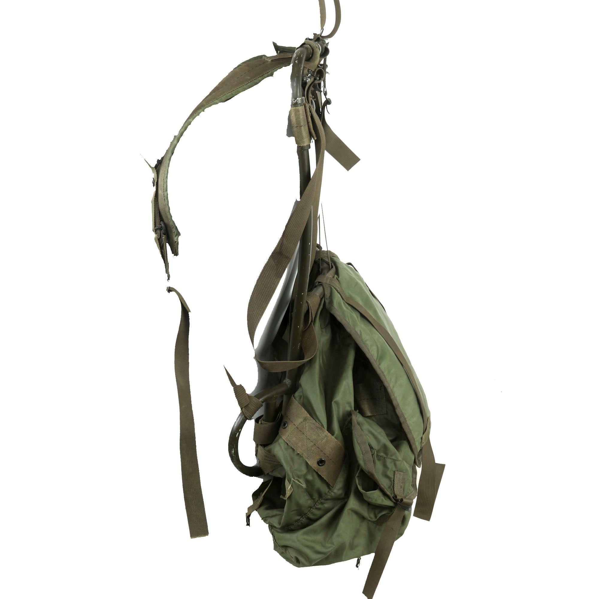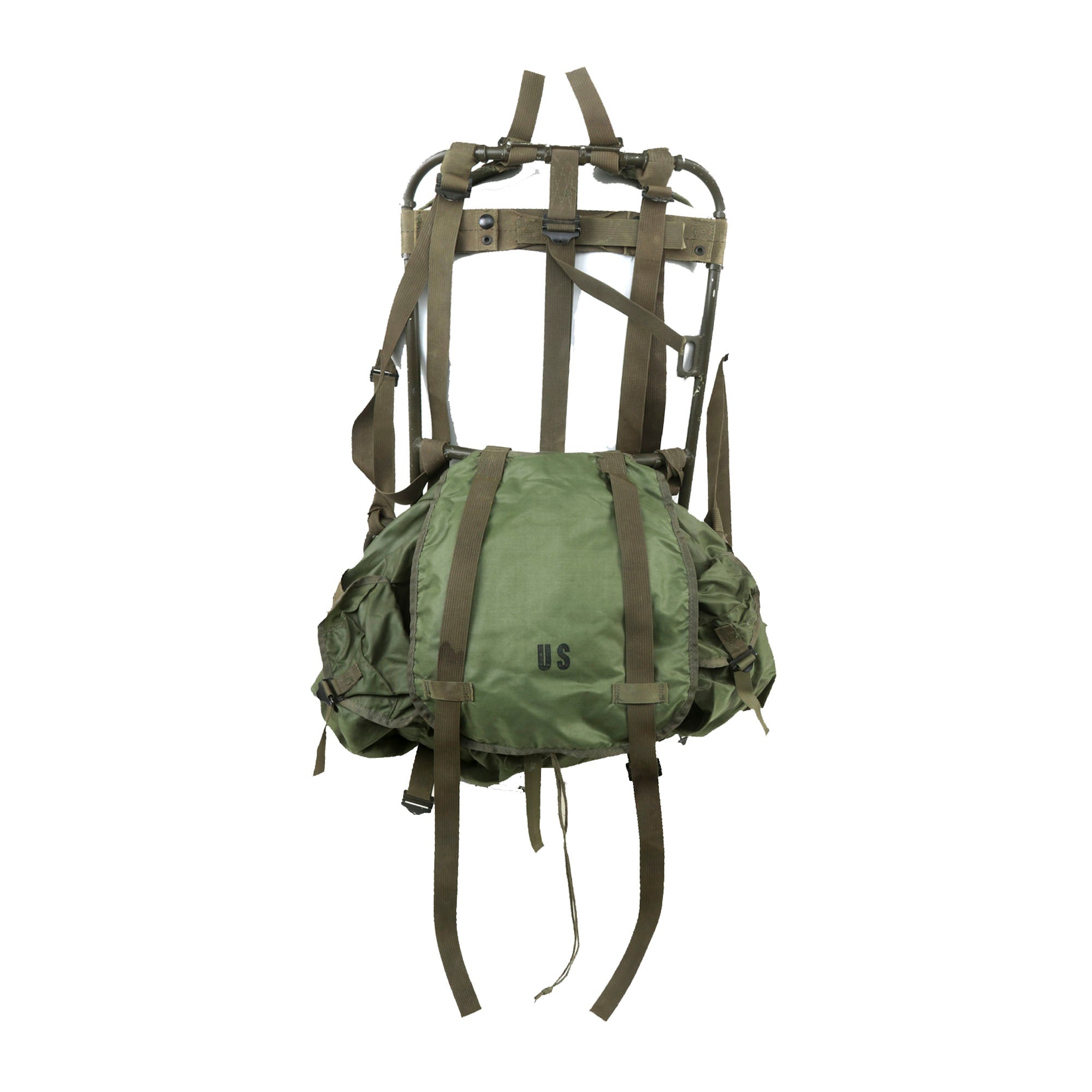 • Original Item: Only One Frame Available. This is a beautiful, genuine Lightweight Rucksack Frame with the correct lower rucksack. This model 1964 version features welded aluminum construction with wraparound tabs on strap loops. The model 1966 version would be made from riveted aluminum instead of welded, and the tabs would then be eliminated on the next frame modification introduced in 1968.