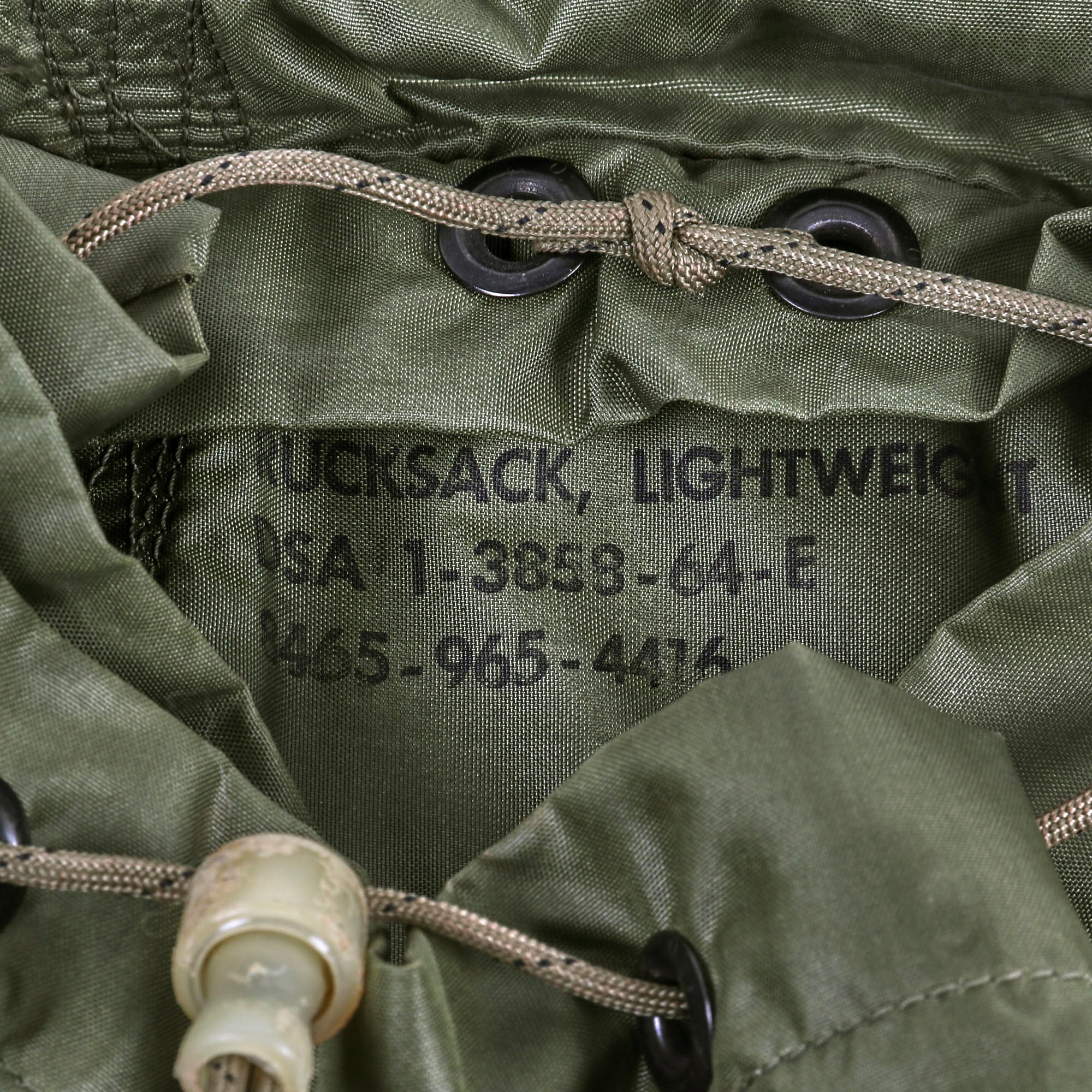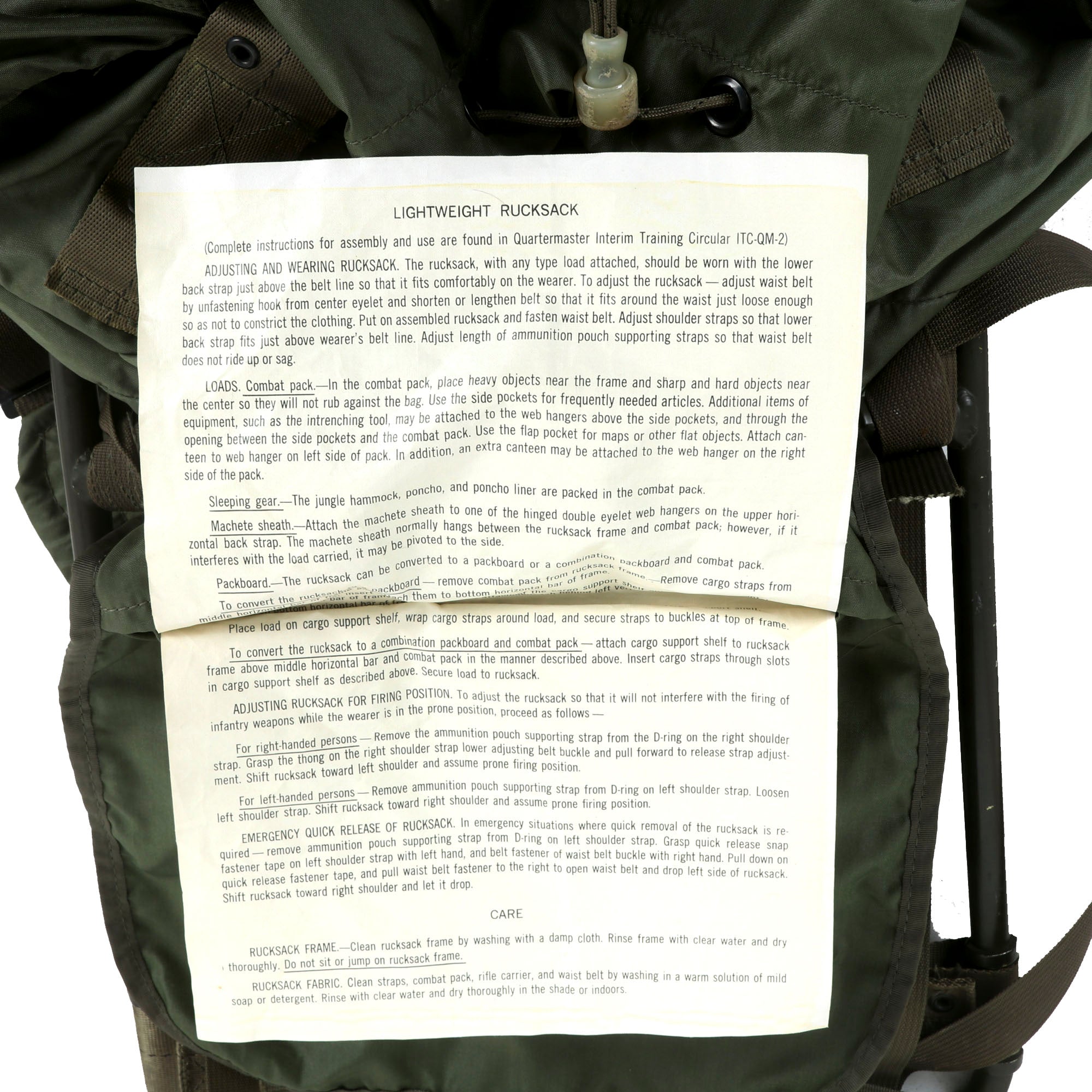 The attached lower RUCKSACK, LIGHTWEIGHT is in fantastic shape, and looks to be totally complete. It even retains the original instructions inside the top flap, and the 1964 contract date and other information stamped inside is still clear.