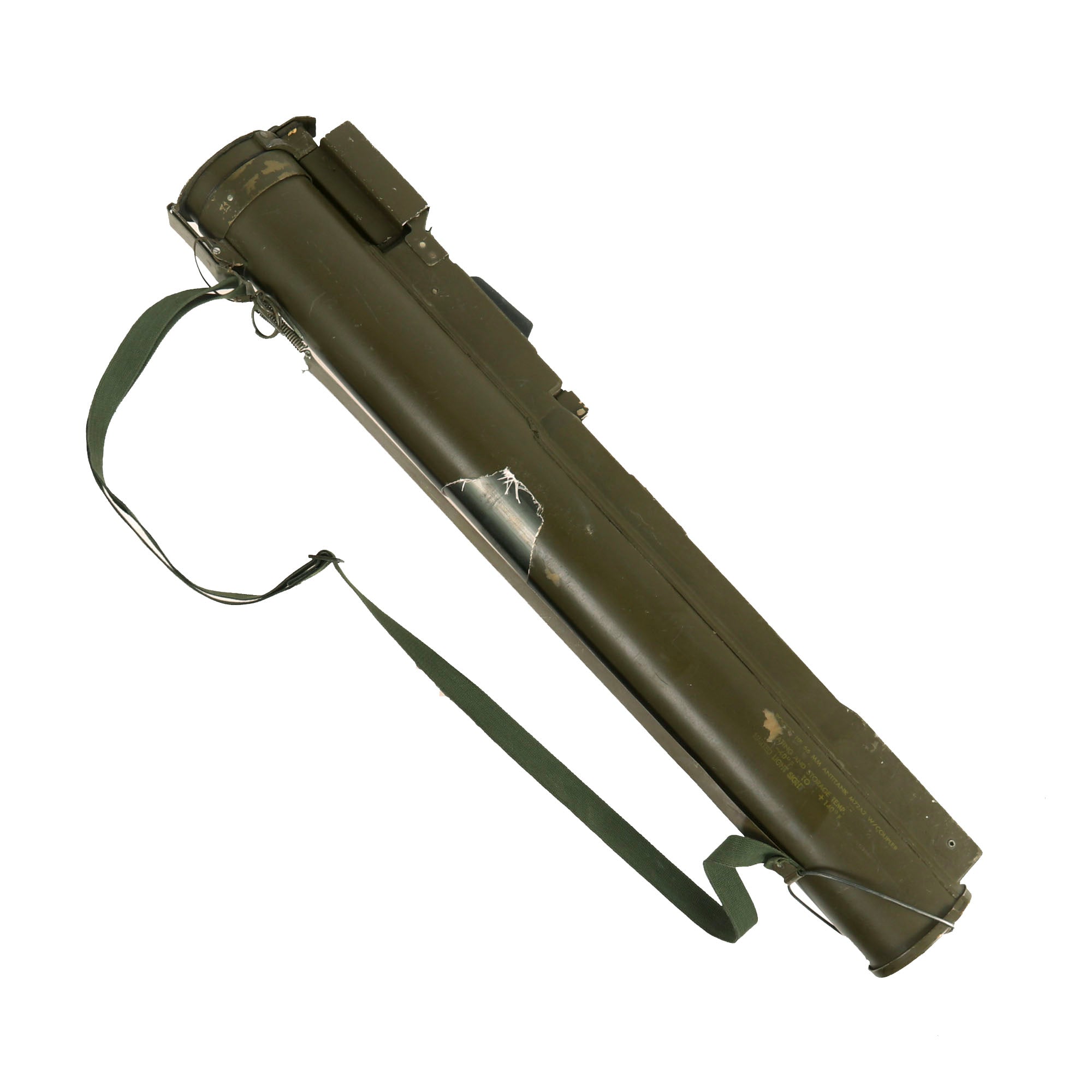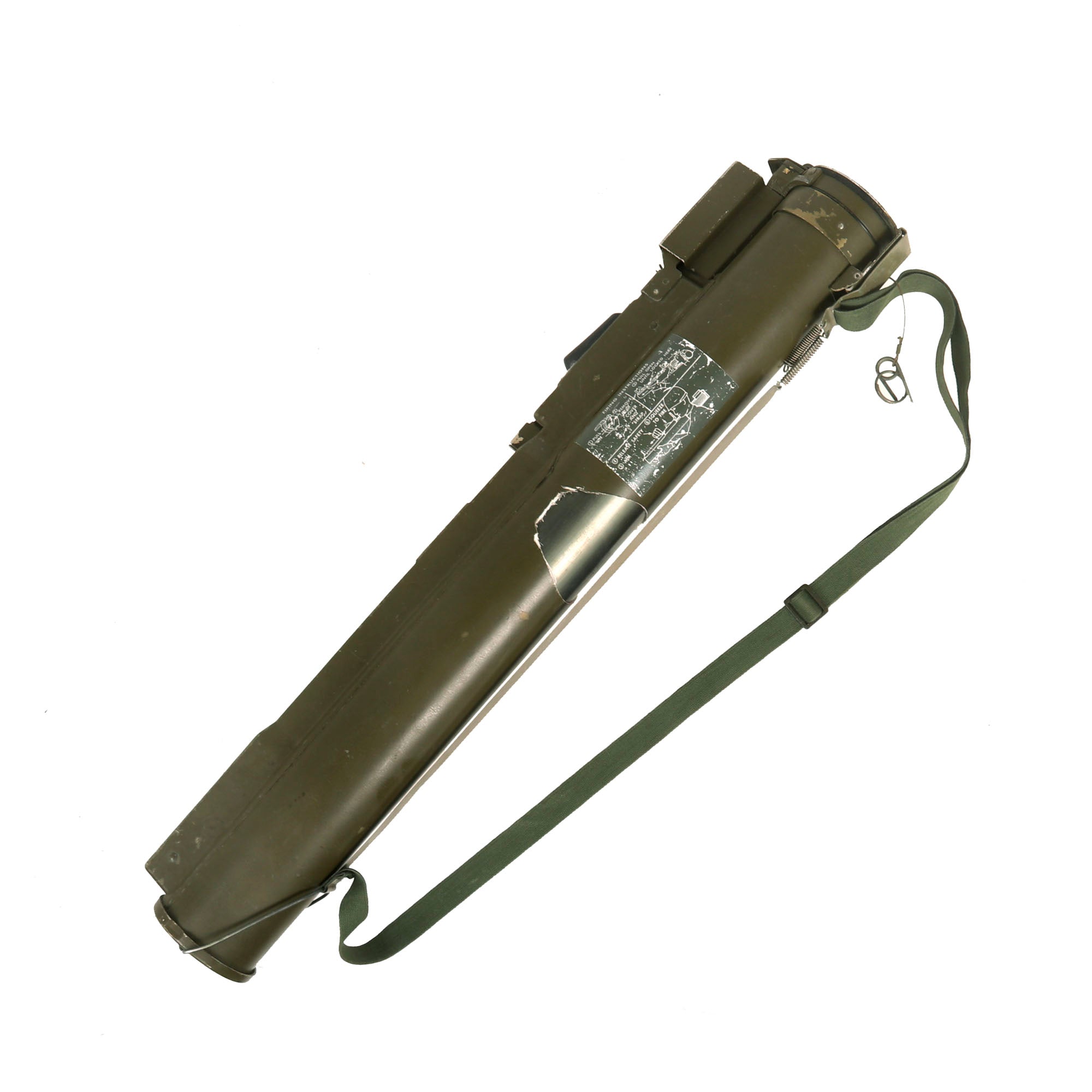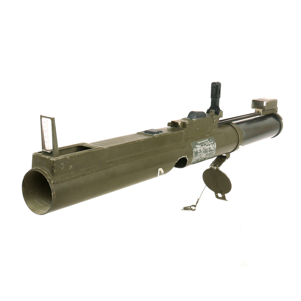 These are timeless in design, which the U.S. Military has tried to replace in the past, but was unable to find anything better than these disposable launchers. This very nice example has both the rear sight and the front sight and complete sling assembly with end caps, though one of the springs on the covers has torn through the metal strap.