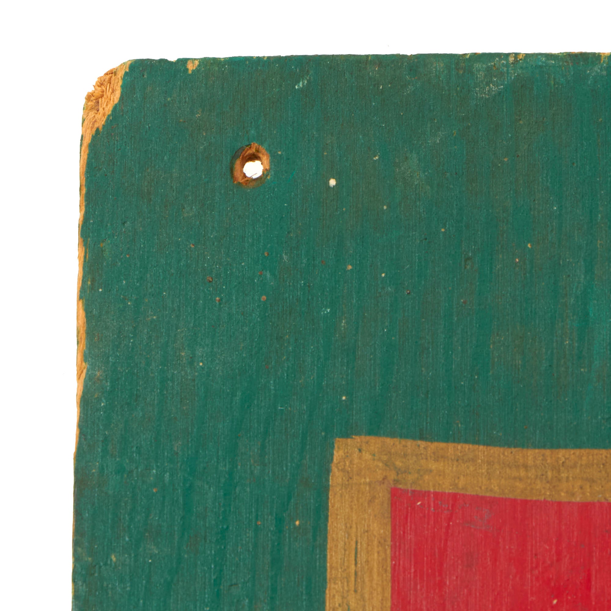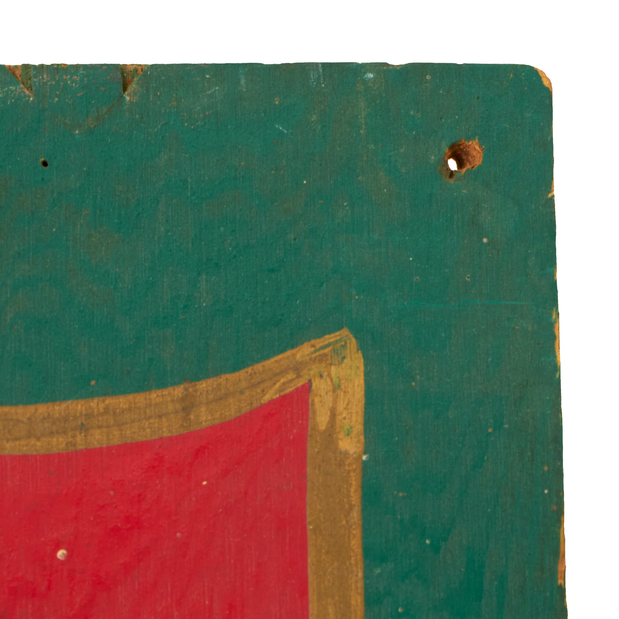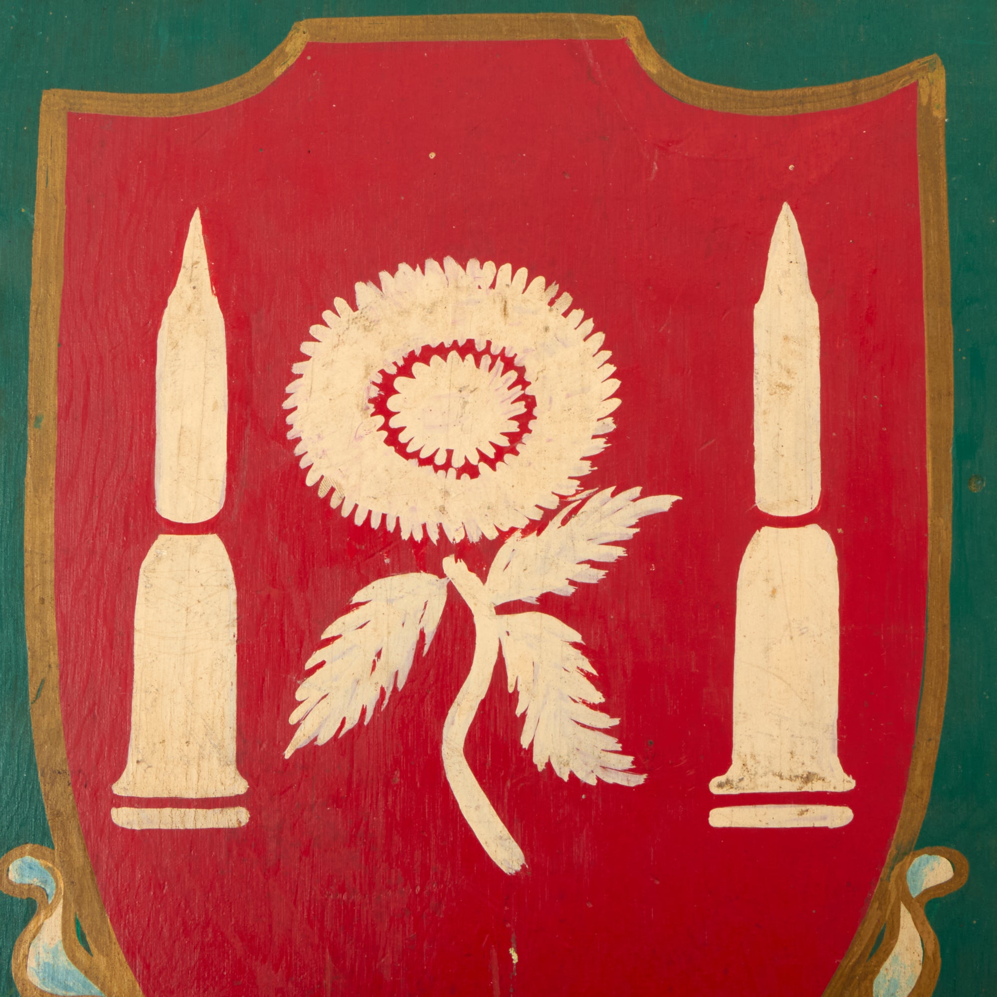 This is a fantastic hand-painted unit sign for the 29th Field Artillery. The sign is painted green with a red shield with two artillery rounds and a flower painted onto it. The motto “Fidelist Et Verus” (Faithful and True) is painted onto a ribbon below the shield. The board measures 11½ x 16¾”.
