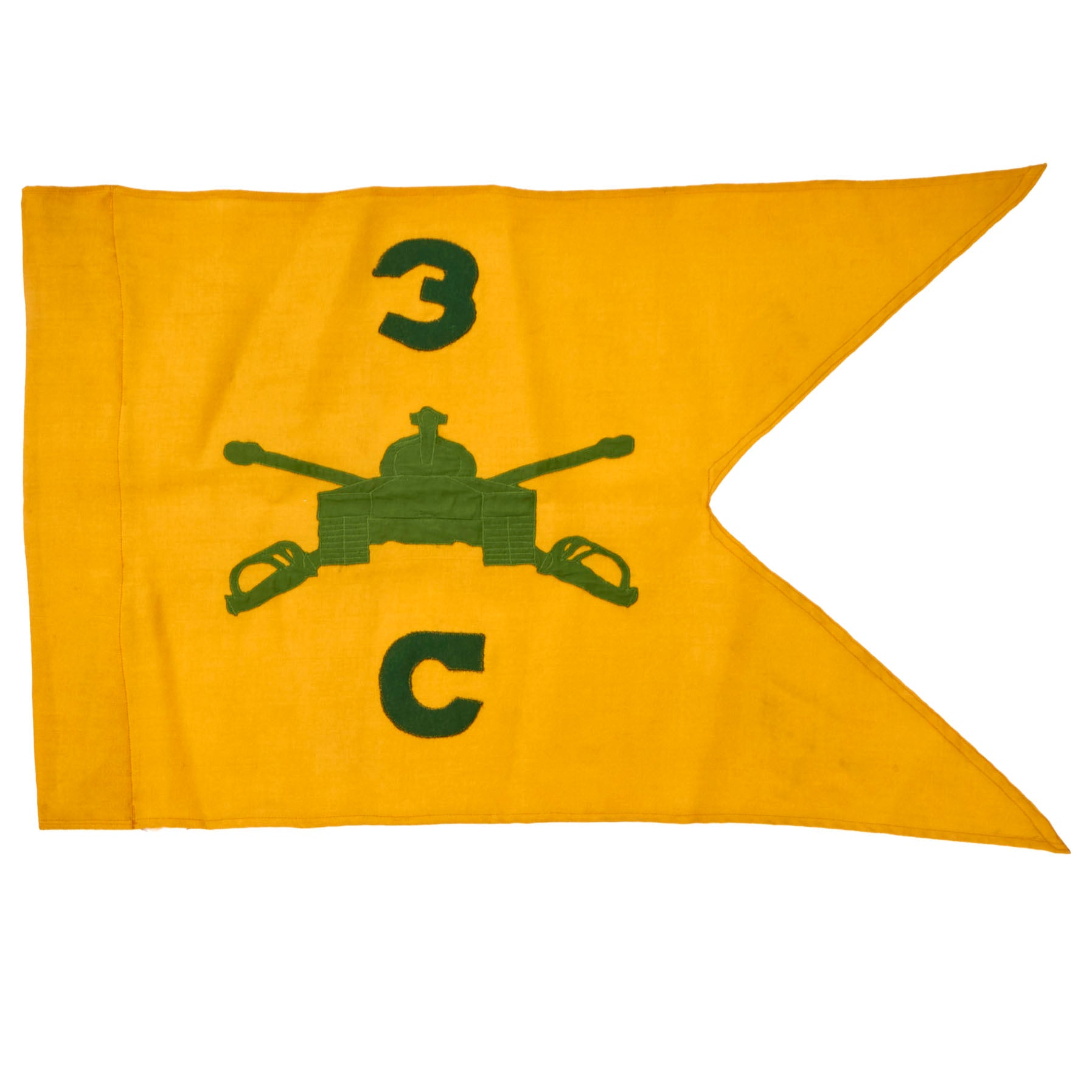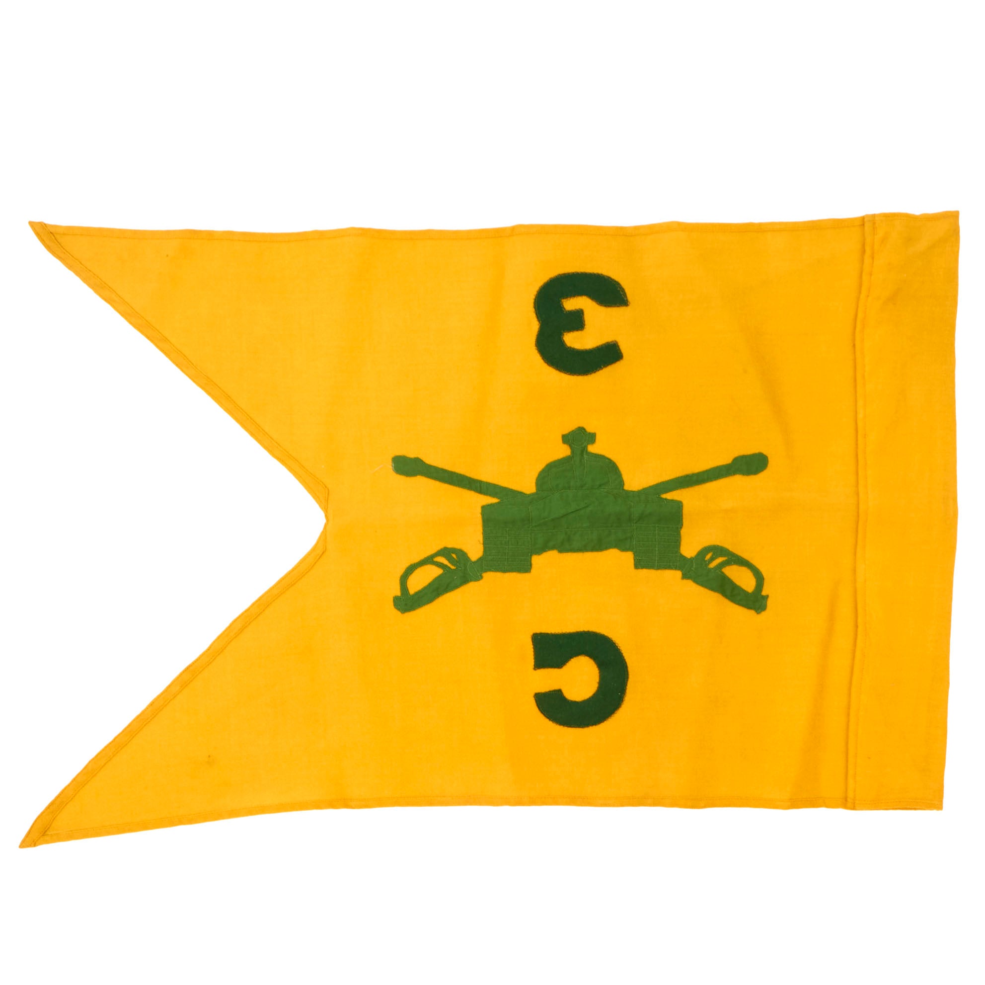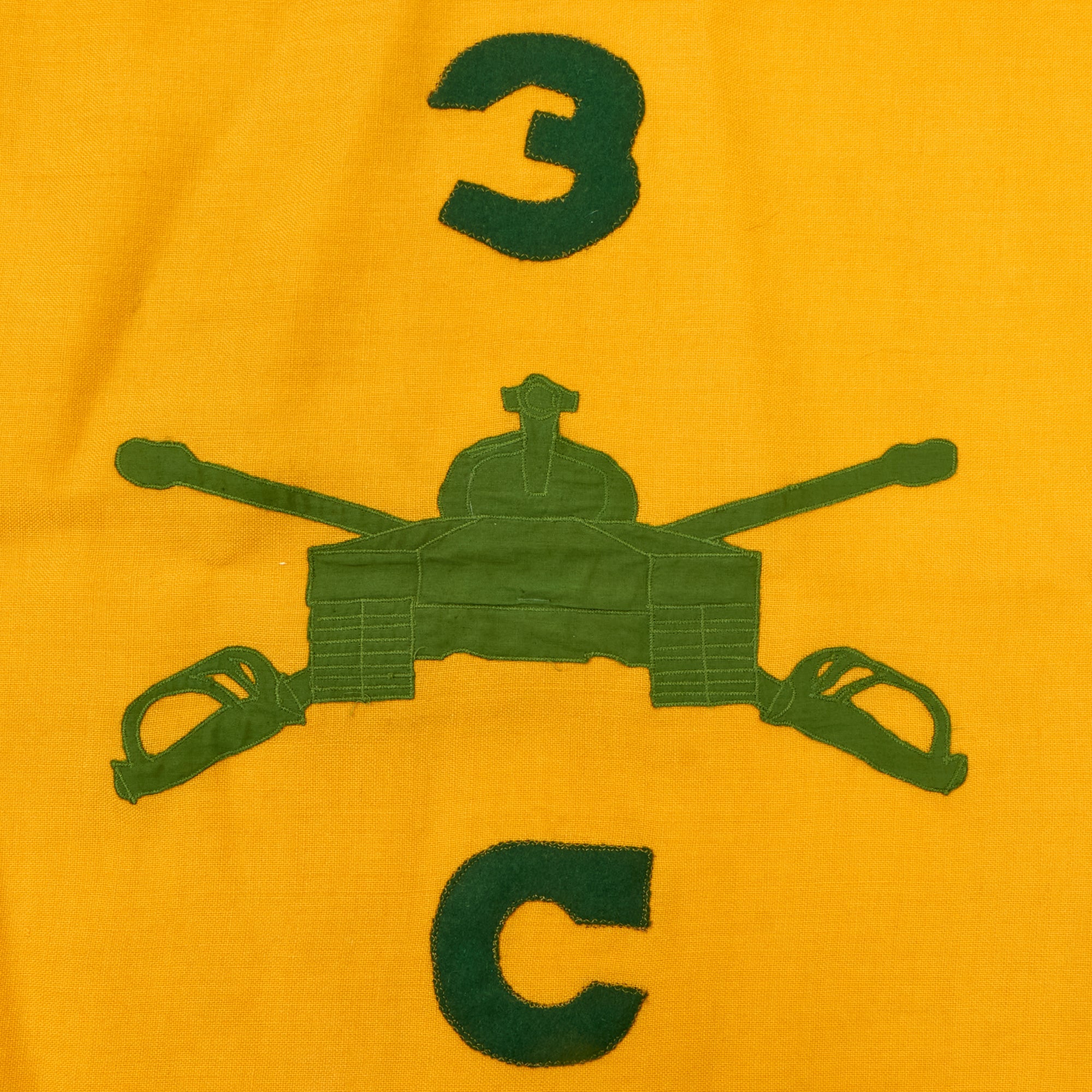 This is a great guidon dated 1959 for Company C of the 3rd Cavalry Regiment, along with a great period patch for the regiment. The guidon is yellow for Cavalry and features a tank with crossed cavalry swords behind, with a 3 above the tank and a C below.