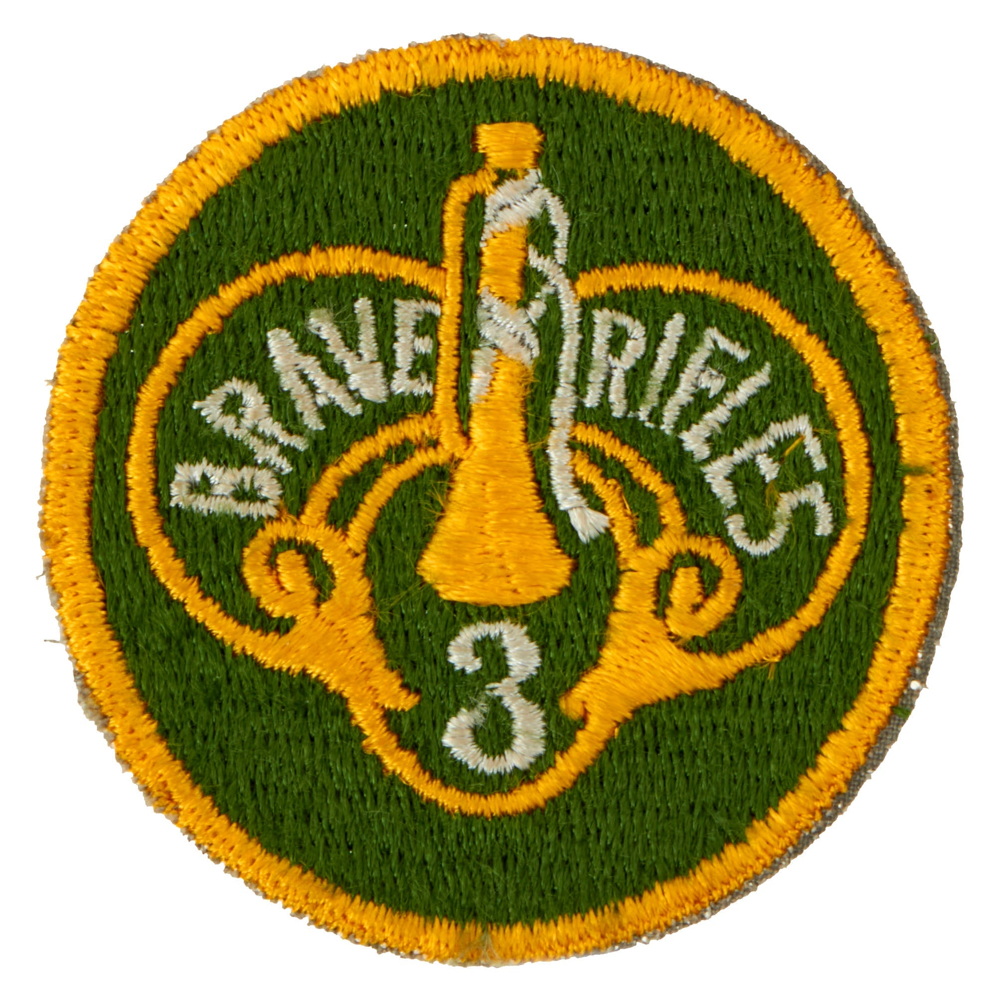 The patch depicts a trumpet with BRAVE RIFLES 3 around it. The guidon has a great tag in the header dating its manufacture to 2/4/59, for February 4th, 1959.