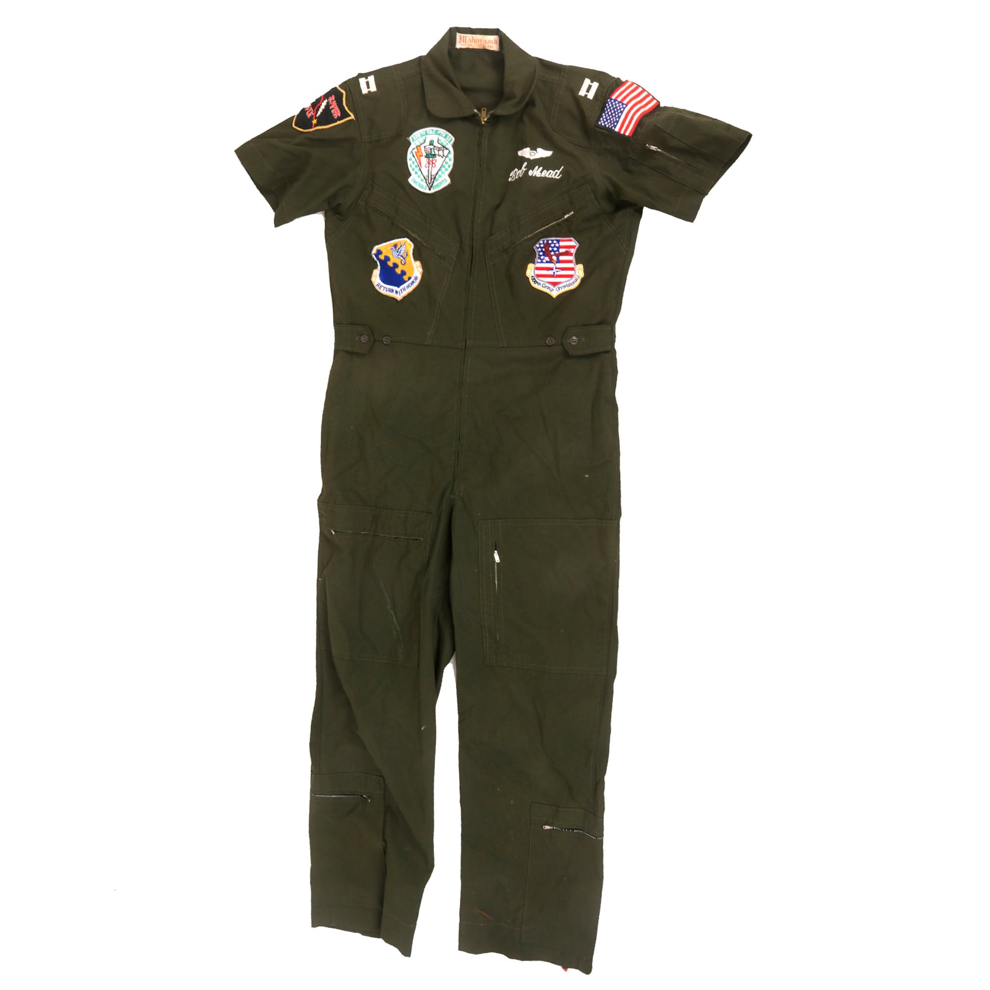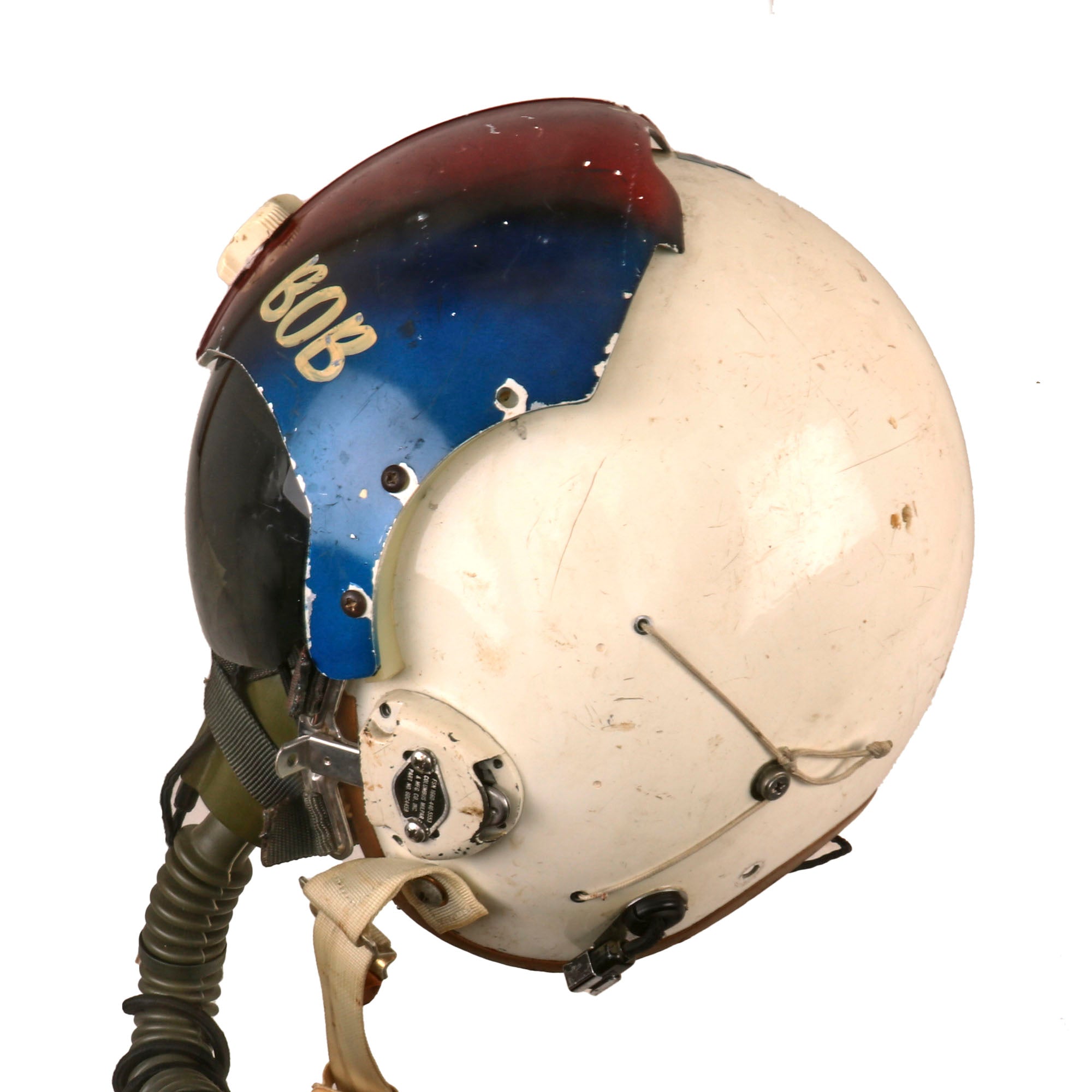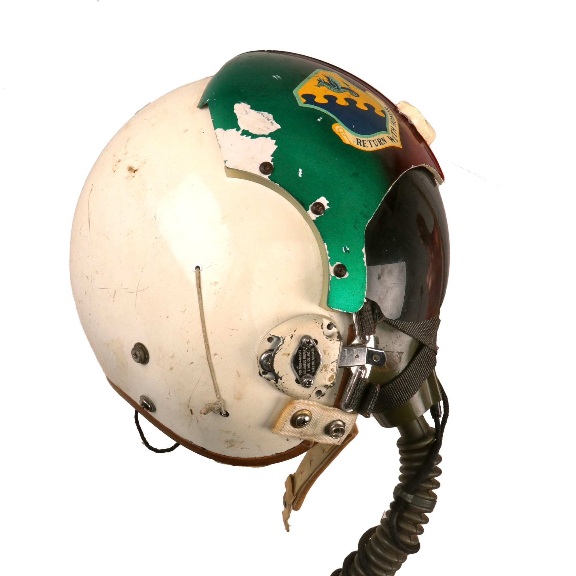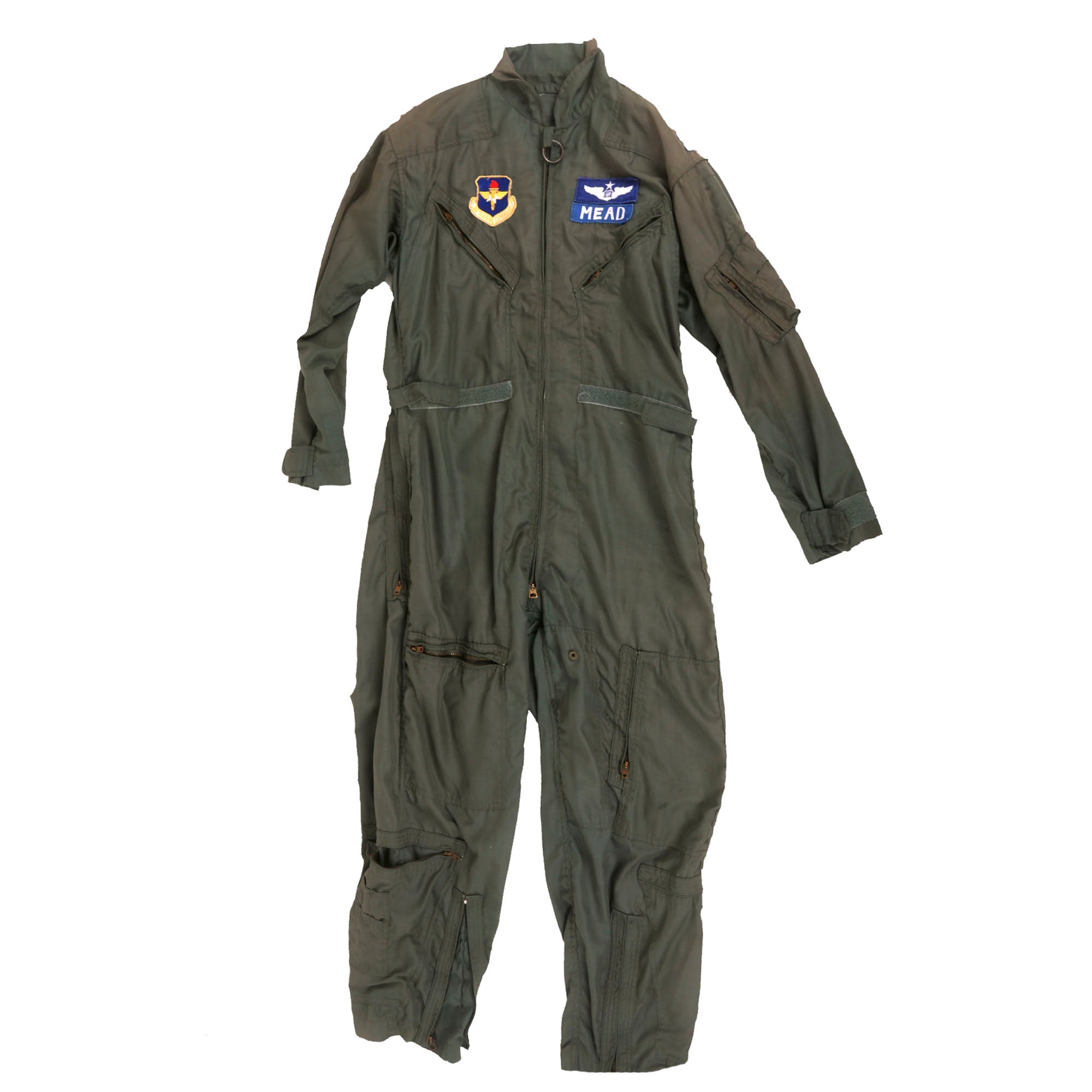 Original Items. One-of-a-Kind Grouping. This is the extensive uniform and flight helmet grouping of Robert Mead, a Master Navigator with more than 3,000 flying hours including over 670 combat hours flown from Da Nang Air Force Base in South Vietnam and 67 more missions flown over North Vietnam. He’s received numerous decorations including the Bronze Star, Meritorious Service Medal, Air Force Combat Action Medal, Air Force Outstanding Unit Award with one OLC, and the Air Medal with 10 OLCs.The grouping includes:- Mead’s white dress uniform with Lieutenant Colonel shoulder boards, his MEAD nametag, his pilot’s wings, and a 11-place ribbon bar with the Meritorious Service Medal, the Bronze Star, the Air Medal with 2 OLCs, the Republic of Vietnam Campaign Medal with bar, the Vietnam War medal, the Outstanding Unit Award with OLC, the WWII American Campaign medal, the Army of Occupation Medal, the Korean Service Medal, the WWII Victory Medal, and the United Nations Korean War Medal. Pants are also included.- Mead’s dress dinner jacket with Colonel’s shoulder boards, his mini pilot’s wings, and a 13-place mini-medal bar with the Bronze Star, the Air Force Combat Action Medal, the National Defense Medal, the Air Force Reserve medal, the Combat Readiness Medal, the Vietnam Service Medal, the Air Medal, the Meritorious Service Medal, the WWII American Campaign Medal, the Korean War UN Medal, the Army of Occupation Medal, the American Defense Medal, and the WWII Victory Medal.- Three of Mead’s flight suits from the Vietnam Period. The first of these has the Yankee Air Pirate, Linebacker II, and DCAL 1952-1975 McClellan patches. The shoulder has WOLF FAC and River Rate patches. The second has his Name Tag, cloth Master Navigator wings, and Air Training Command patch. The third flight suit has Captain’s bars, 308th Tactical Fighter Squadron patch, 31st Fighter Wing patch, 4100th Group (Provisional) patch, embroidered name and wings, and the River Rate patch on the sleeve. These are three fantastic flight suits detailing different parts of Mead’s Air Force service.- Mead’s Camouflage-covered HGU-26/P flight helmet with retained visor. The entire helmet is covered in strips of camouflage. The interior of this helmet is entirely empty, the lining, padding, and whatever else is entirely gone.- Mead’s white HGU-26/P flight helmet with attached oxygen mask and retained visor. This helmet has red/blue decaling on the front with the name BOB painted in white on one side, with the insignia of the 31st Fighter Wing on the other side. The mask is an MBU-5/P oxygen mask and is in good condition with the hose retained. The interior of this helmet is likewise missing most all of the padding besides one ear. Both helmets are missing most of their internals but still display well.- Mead’s 1990s era Camouflage jacket with Colonel ranks on the collars, Air Force Recruiting Service patch and Air Education & Training Command patch. This is likely the most recent uniform in the group.- Blank blue dress uniform and trousers.- Mead’s Dress cap made in Taipei with a calling card for K.S. Smiley Jr, Lt. Col., USAF. This may have belonged to a friend of Mead’s, it is the only piece of the group that is named to someone else. An overall lovely cap with thunder & lightening bullion work on the visor.- Mead’s issue “Cardigan” with Colonel shoulder boards, Citadel tag.- Two of Mead’s overseas caps with Colonel insignia.- One pair of dress shoes and one pair of black boots, both in good order.A 1994 newspaper article notes that Mead was awarded the Distinguished Flying Cross with one OLC, but his uniform does not show these awards. Considering some of these uniforms are from earlier in his service, it’s possible he was awarded the DFC at a later date.Mead attended Arms Academy and received his Bachelors from Boston University and Masters from Golden Gate University. He was commissioned a Lieutenant through Air Fore ROTC and entered active duty in 1968. Mead became a Master Navigator with more than 3,000 flying hours including over 670 combat hours flown from Da Nang Air Force Base in South Vietnam and 67 more missions flown over North Vietnam. After serving as an undergraduate instructor at Mather AFB, XO for the Deputy Chief of Staff for plans in the Directorate of of Wartime Augmentation at Ramstein Air Base in Germany, and instructor weapons systems officers at Moody Air Force Base, he assumed command of the Recruiting Squadron, Gunter Air Force Station. He assumed command of the 360 USAF Recruiting Group, Air Training Command, Hanscom AFB in 1991.This is a fantastic & extensive Vietnam War flight grouping, ready for further research and display.Approximate Measurements:-Blue Jacket #1