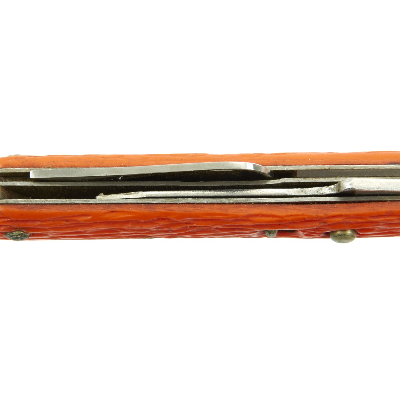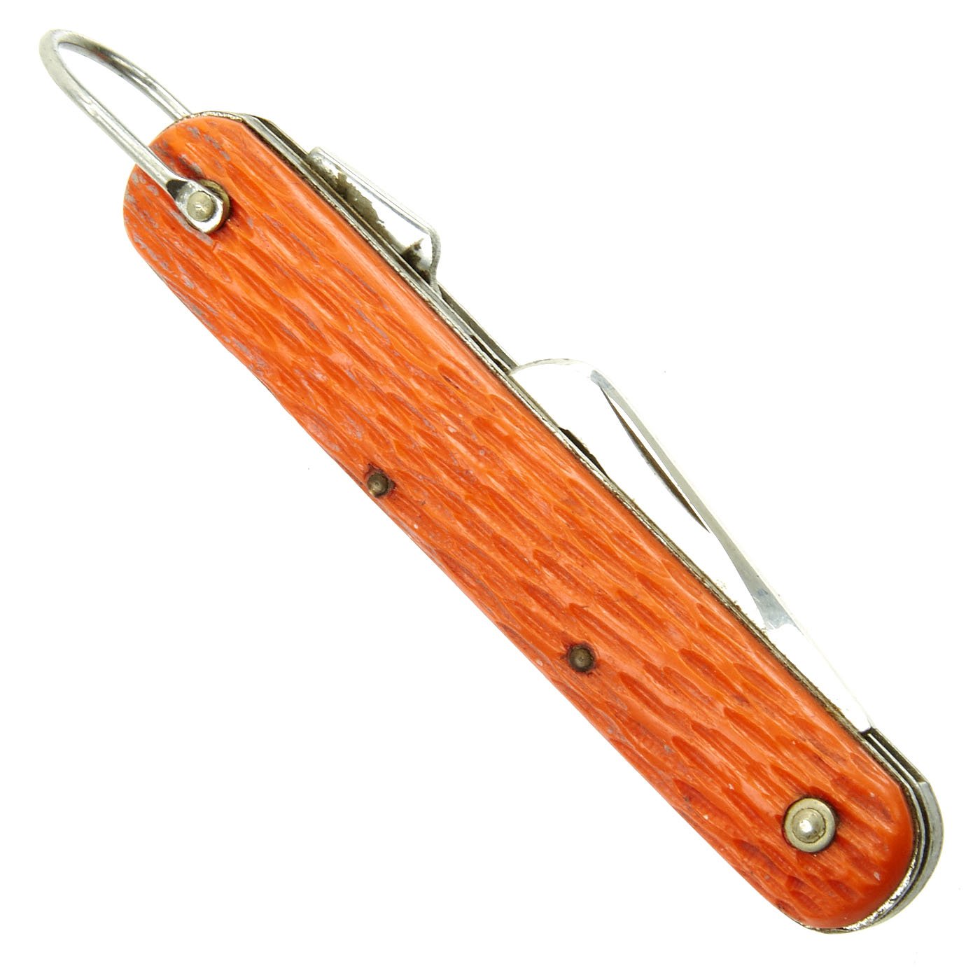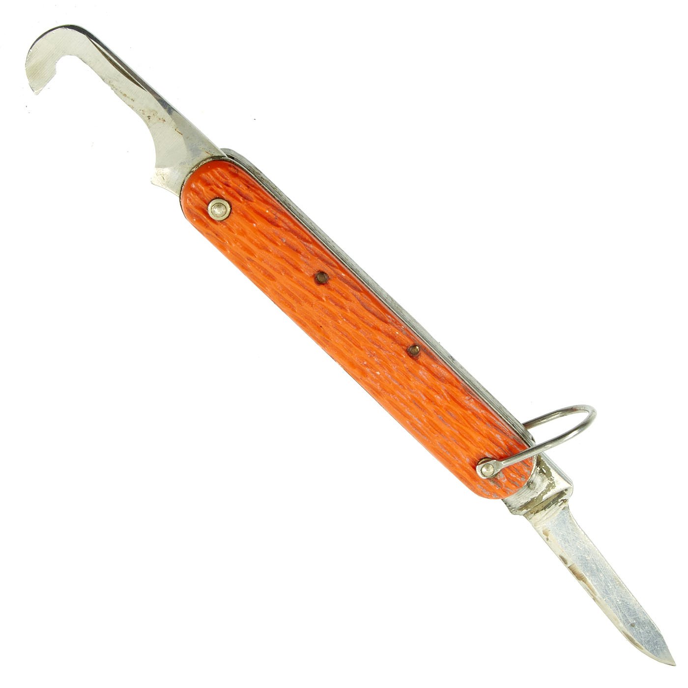 Original Item: Only One Available. This is a very nice service used example of a Vietnam War issue Schrade Paratrooper and Pilot knife, with correct orange plastic "jigged bone" handles. These differ from the WWII and Korean war issue knives in that they have a second blade, specifically designed to cut cords. This would be used to help free the owner from tangled parachute rigging, or even their harness if they were a helicopter pilot. The black plastic was replaced with orange to make the knife easier to see in low light conditions.