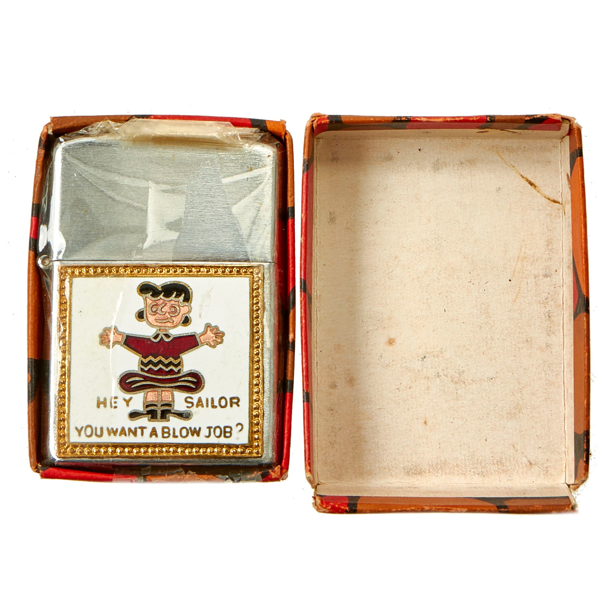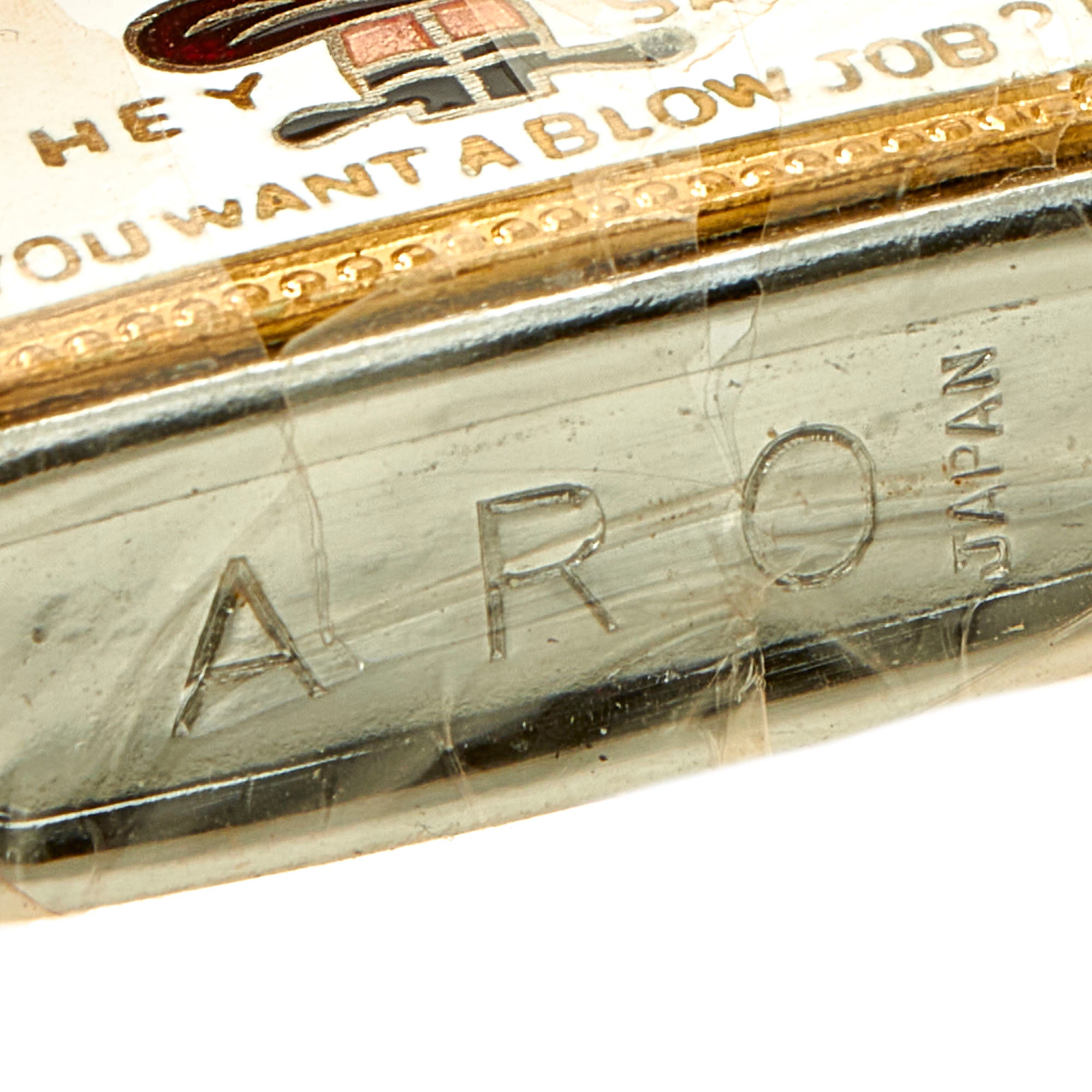 - Zippo style lighter by Arlo of Japan With Explicit Lucy (Charlie Brown) Gesture: These Arlo brand lighters of Japanese origin were very popular amongst the troops serving overseas. The popularity and ingenious zippo “windproof” lighters opened the market for other companies to start making their own versions. This example was most likely picked up by a soldier while on “R&R” in the Philippines or other popular spot. The lighter itself was never used and is still paired with the original box as well as retains the original plastic wrapping “molded” to the lighter.