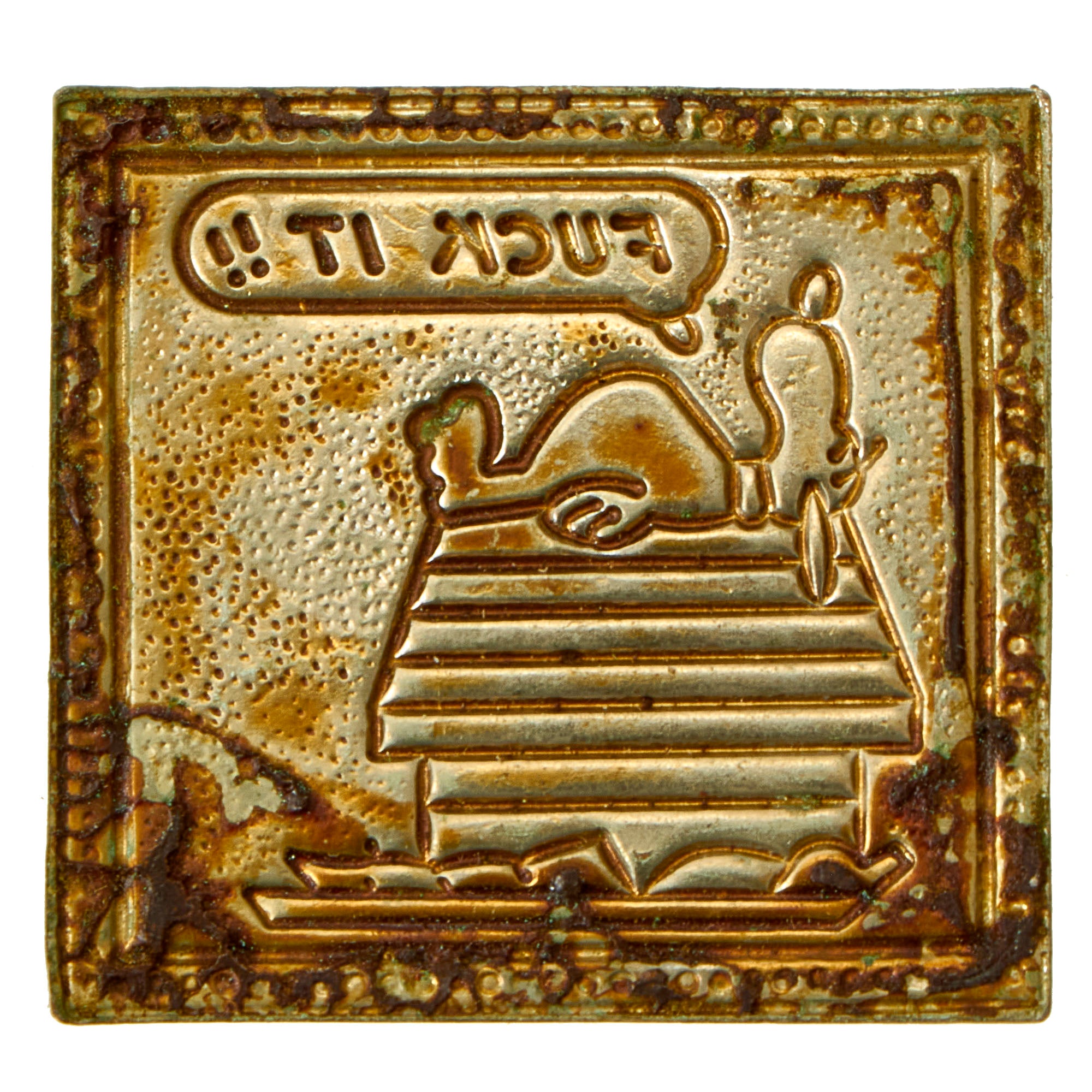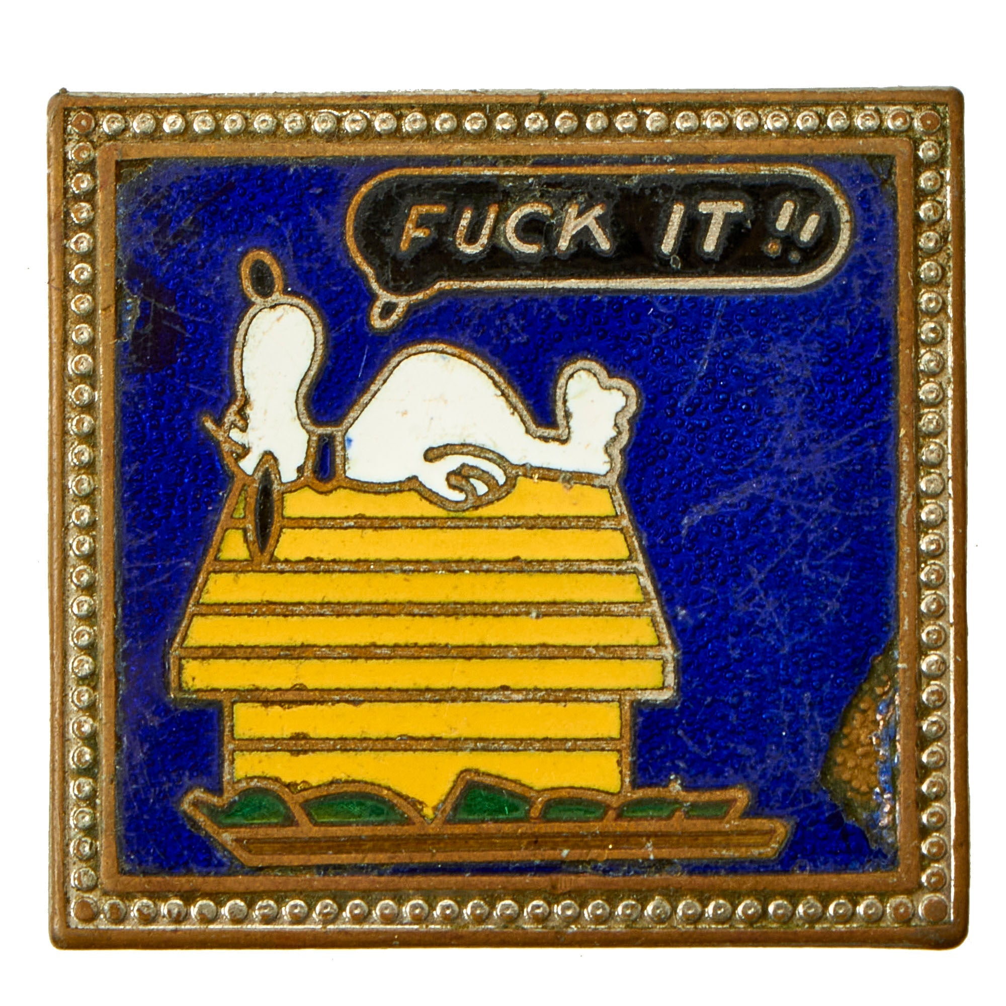 - Snoopy “F-It” Zippo Badge. This small square piece most likely fell off of a lighter or was purchased separately to be affixed to whatever was desired. It is in good condition retaining much of the original enamel and colors.