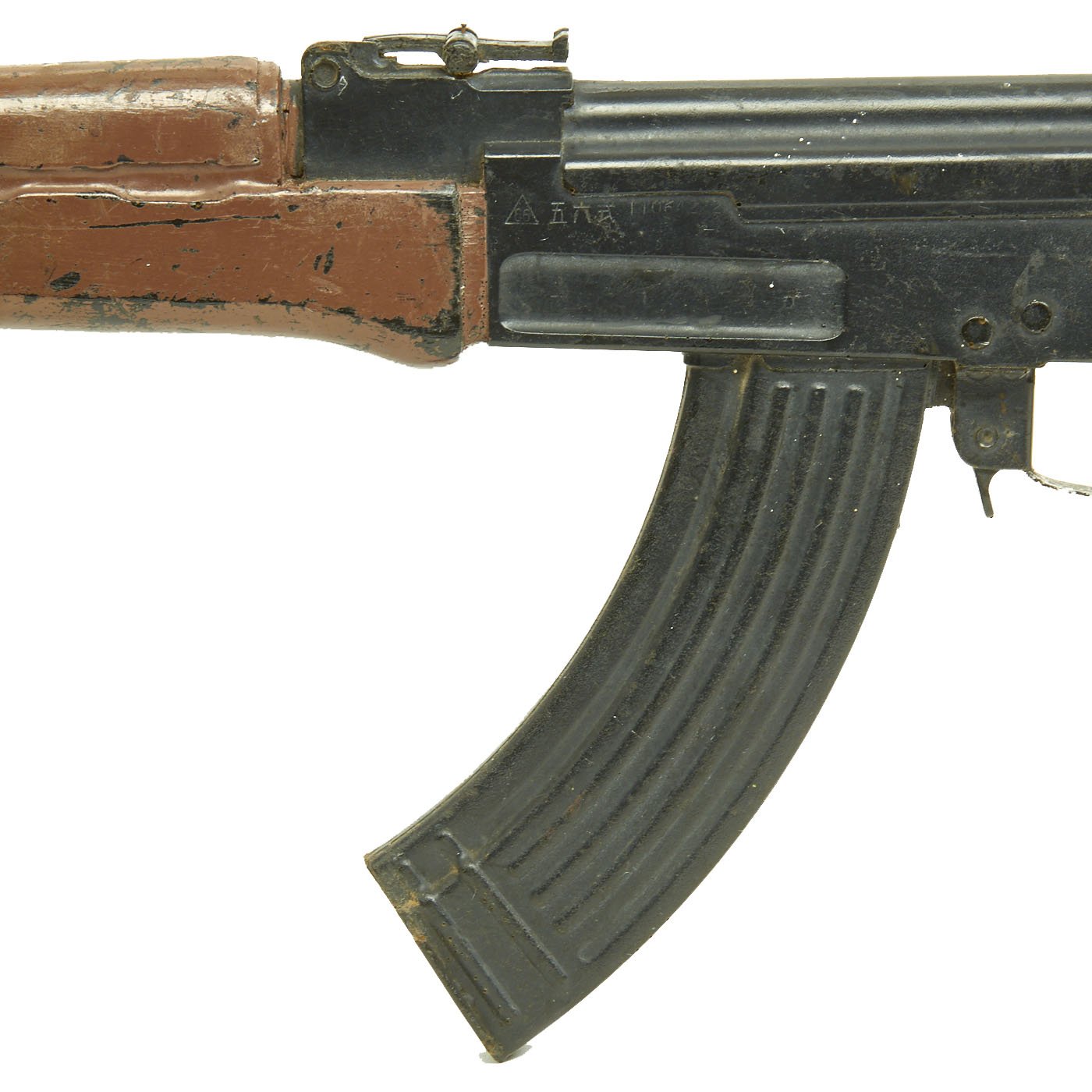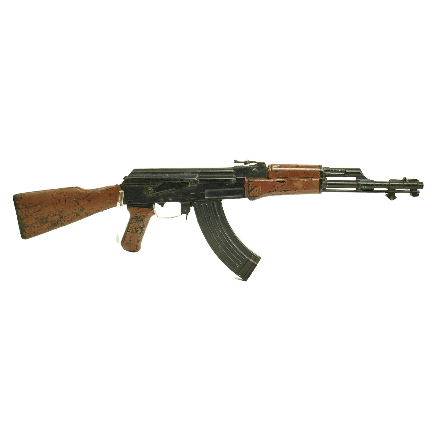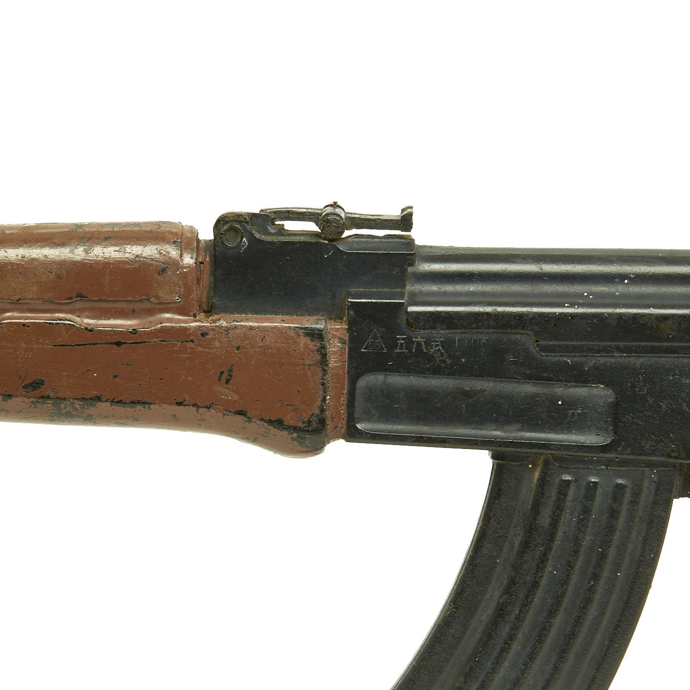 Original Item: Only One Available. This is 1960s Cold War / Vietnam War Era U.S. military issue AK-47 training replica rifle. The military calls these rifles Rubber Ducks. This is full size, true to weight, non-firing replica made of hard rubber, molded from an original. The side of the "receiver" is marked with 66 in a triangle, next to 五六式 11064272. The Chinese numbers and markings indicate this is definitely molded from a Chinese example, and they were the major supplier of AK-47s to the NVA and Vietcong.