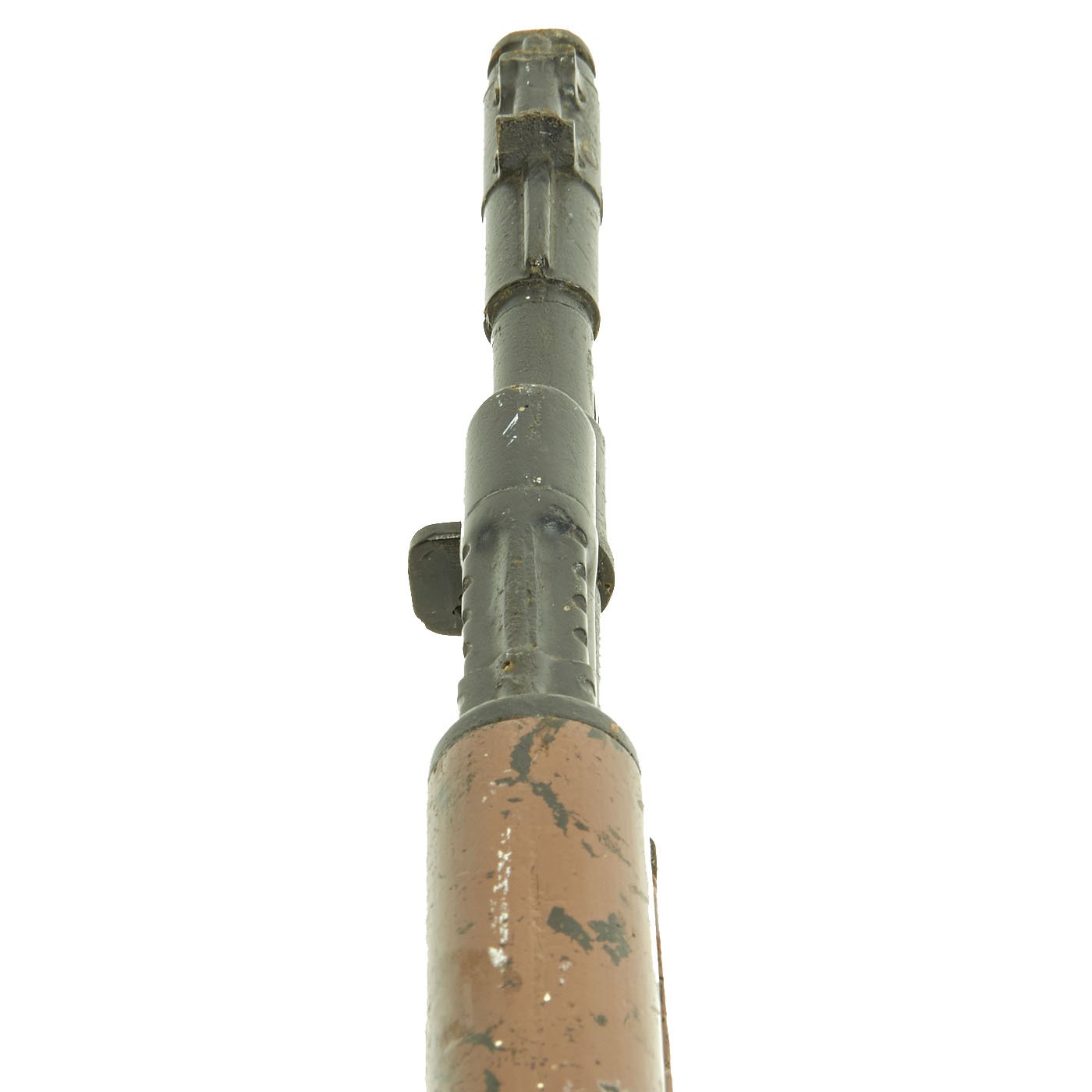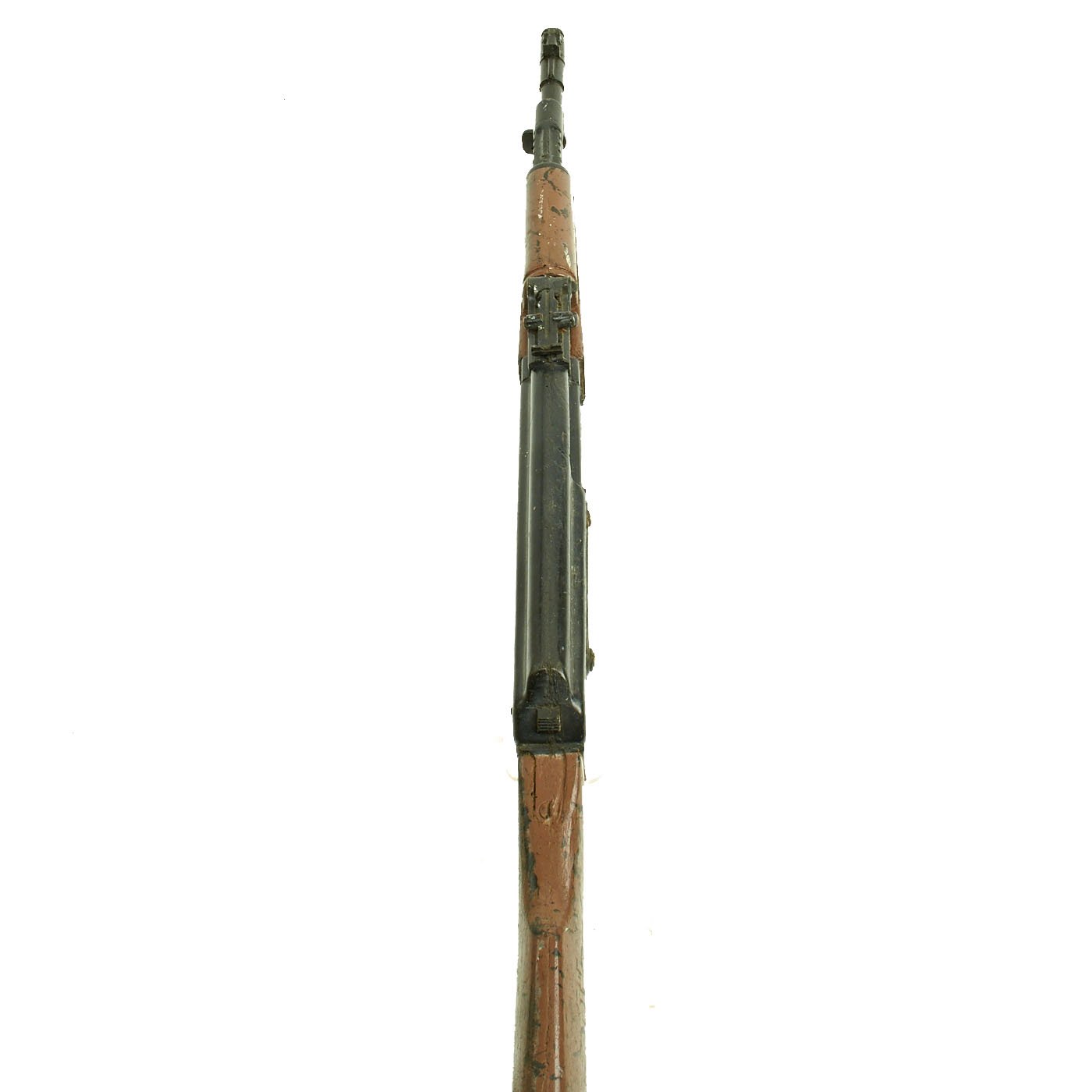 These were used for training by the military so they would not ruin a real rifle and as a safety precaution to prevent accidental discharges. It measures 34 inches long, and is in good condition, though it does have some damage from use. The front sight is broken off, and the rear sight has a glued repair. Otherwise, the rubber is solid and is very detailed without any cracks or splitting.